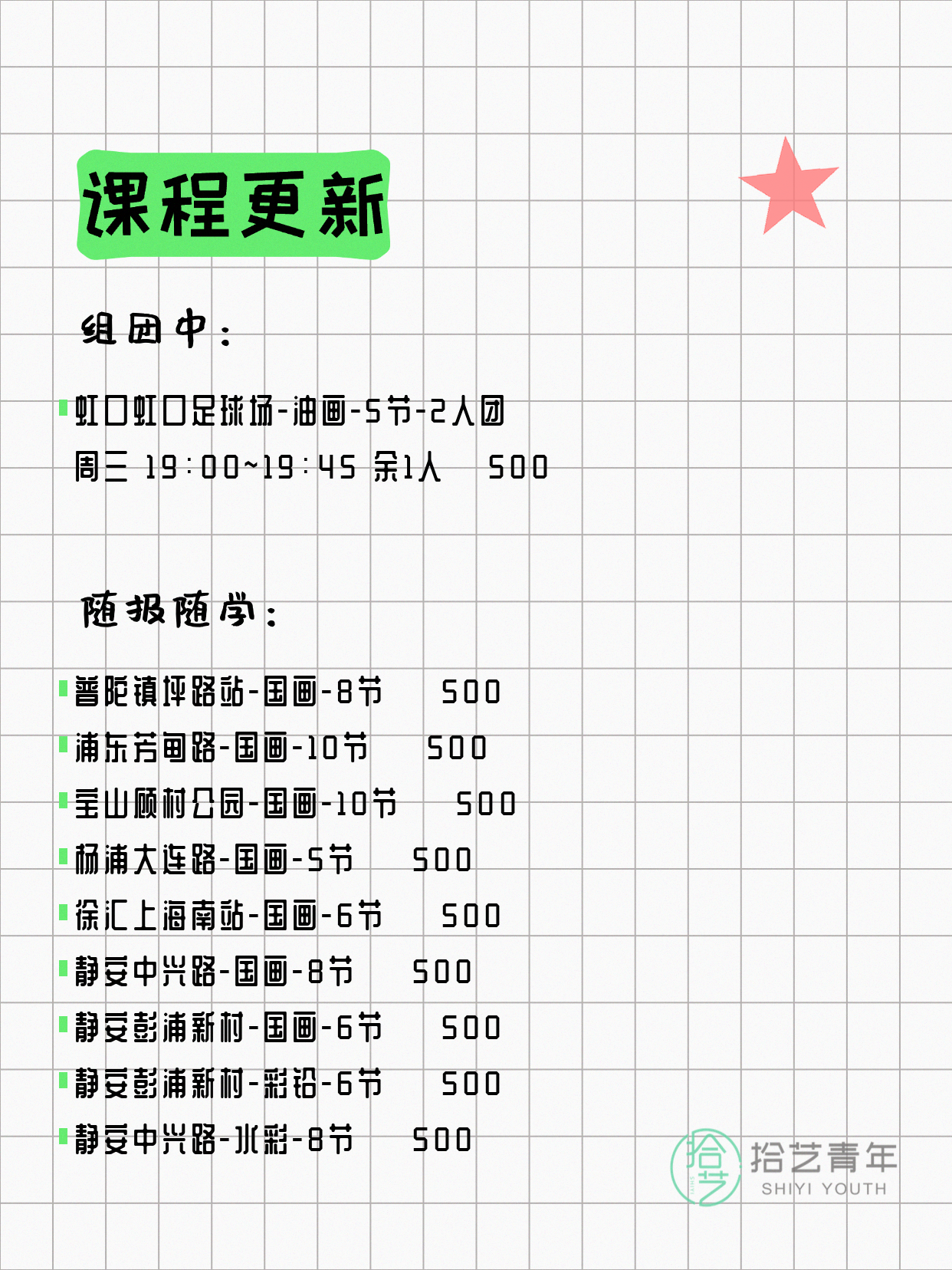 💡 提示:以上课程信息来自拾艺青年小程序,课程可能随报名动态变化,具体以小程序实时信息为准。