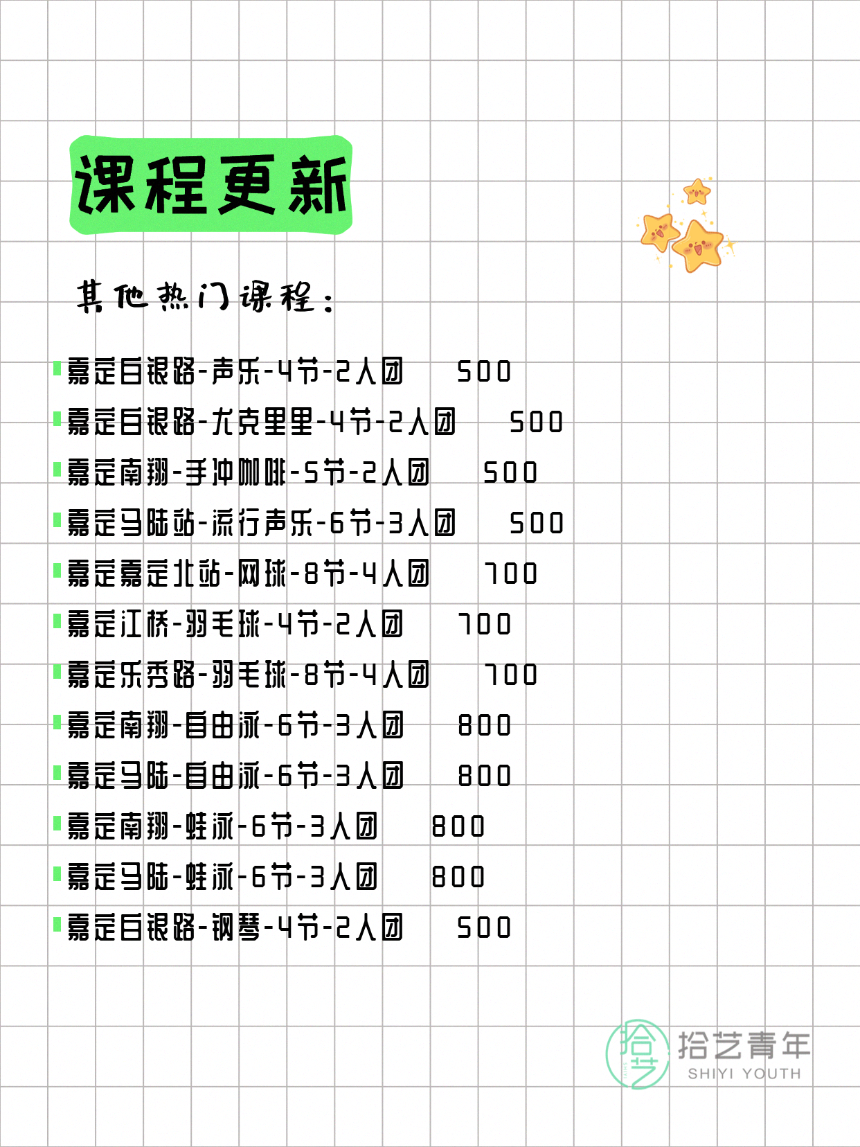 💡 提示:以上课程信息来自拾艺青年小程序,课程可能随报名动态变化,具体以小程序实时信息为准。