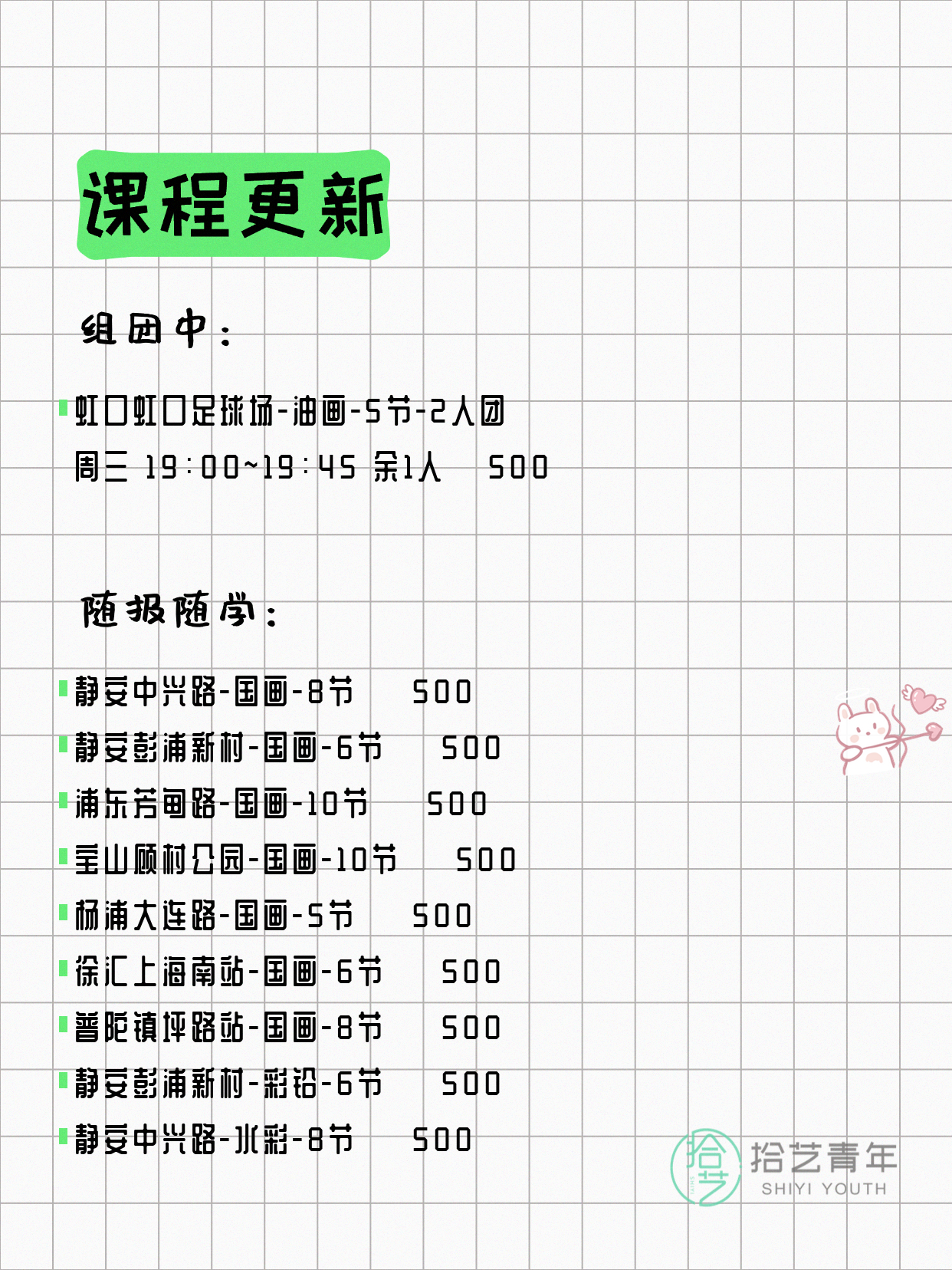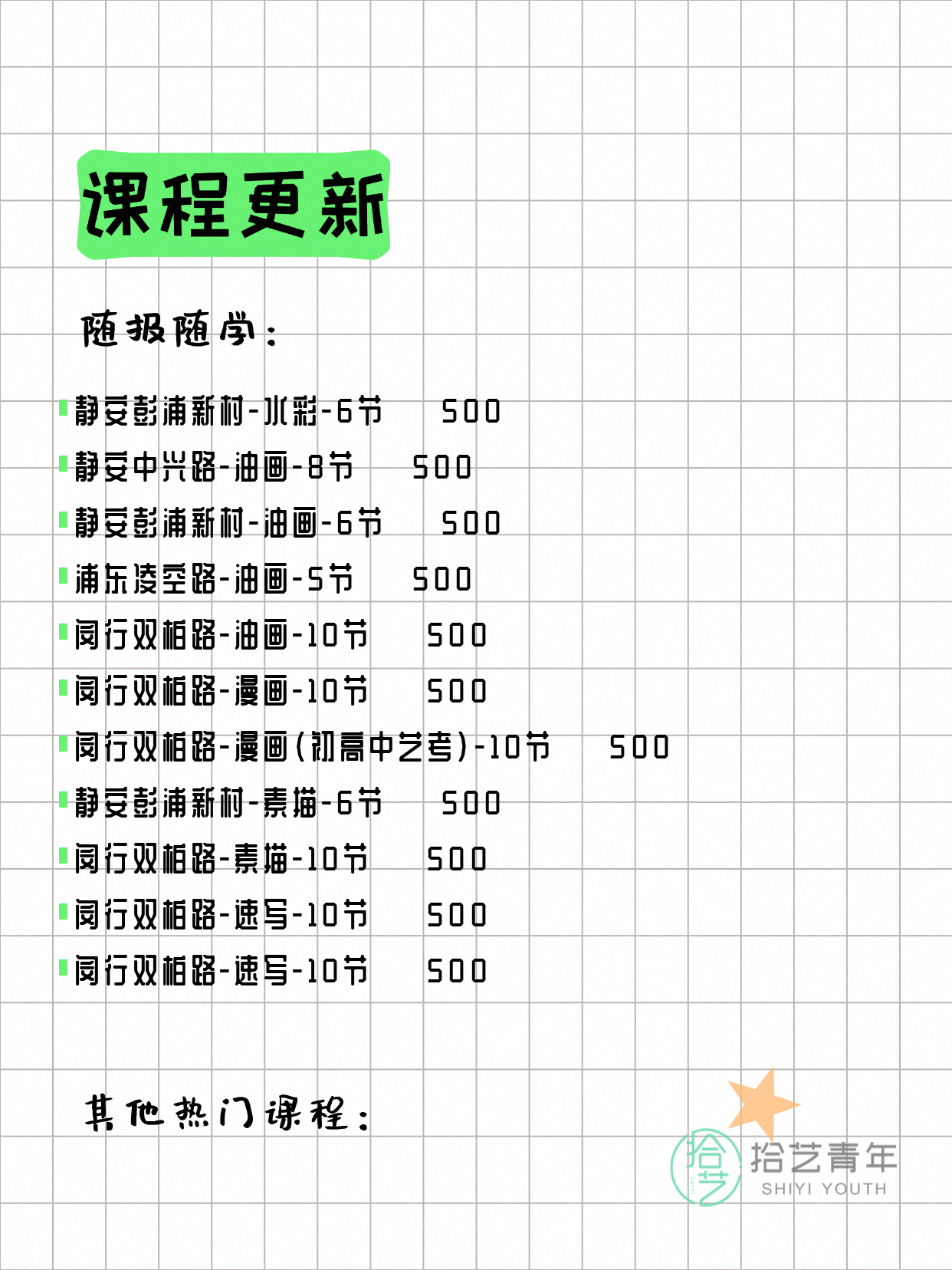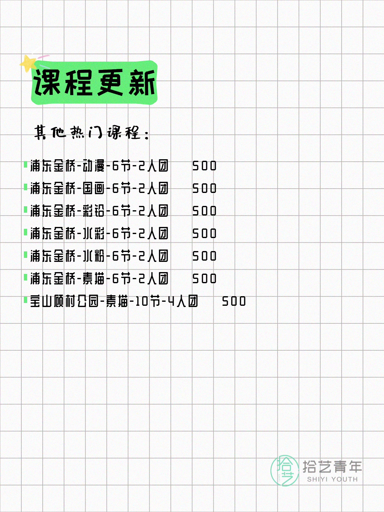 💡 提示:以上课程信息来自拾艺青年小程序,课程可能随报名动态变化,具体以小程序实时信息为准。