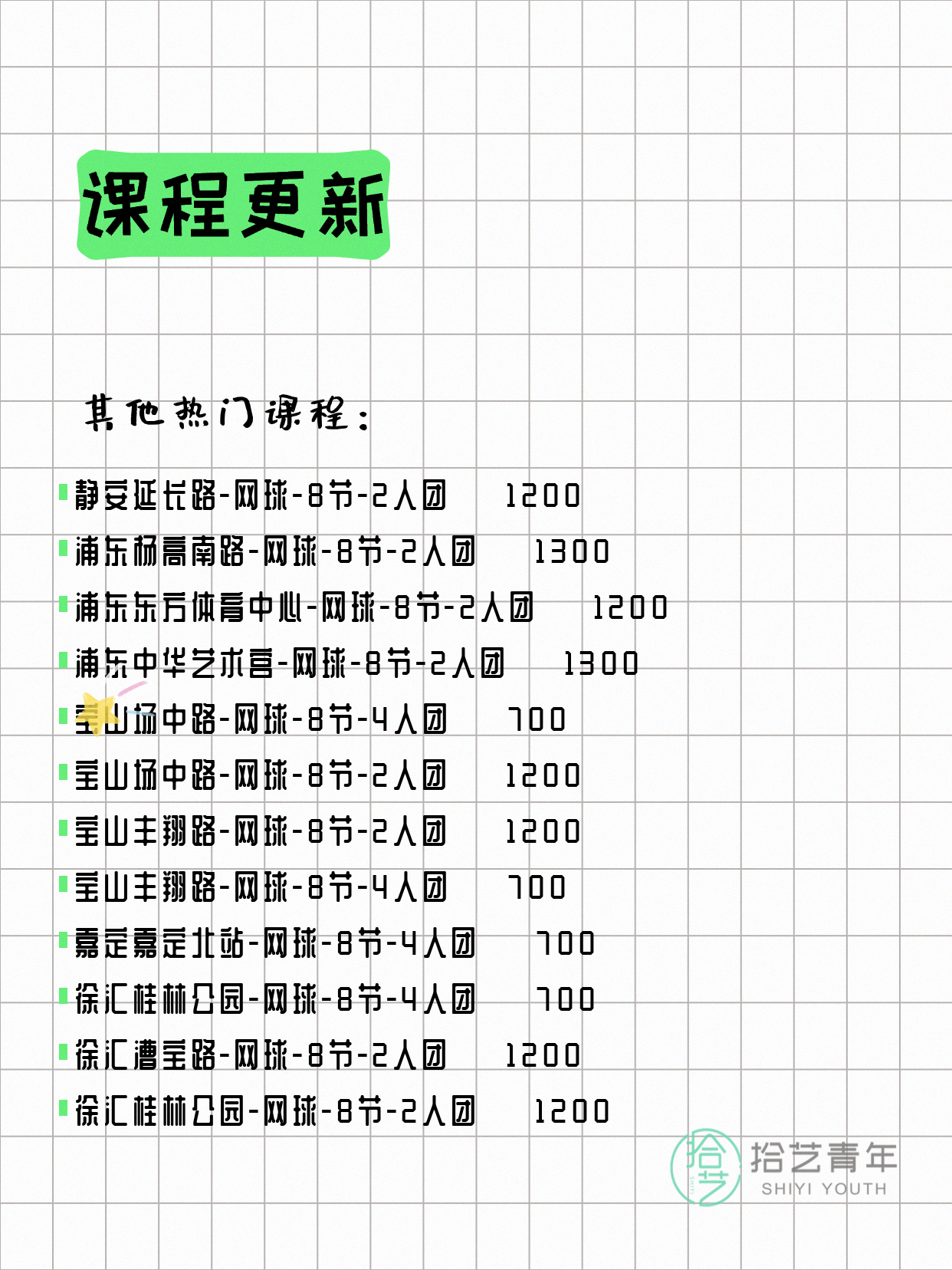 💡 提示:以上课程信息来自拾艺青年小程序,课程可能随报名动态变化,具体以小程序实时信息为准。