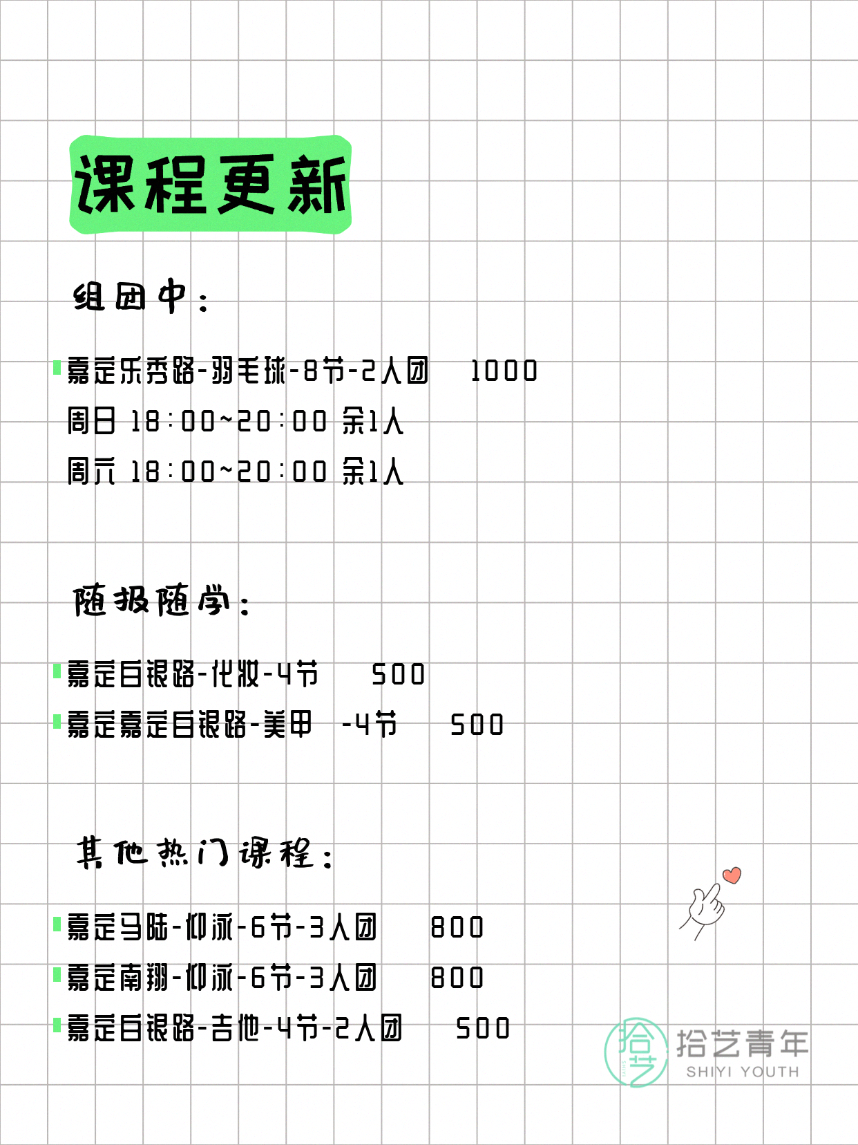 💡 提示:以上课程信息来自拾艺青年小程序,课程可能随报名动态变化,具体以小程序实时信息为准。
