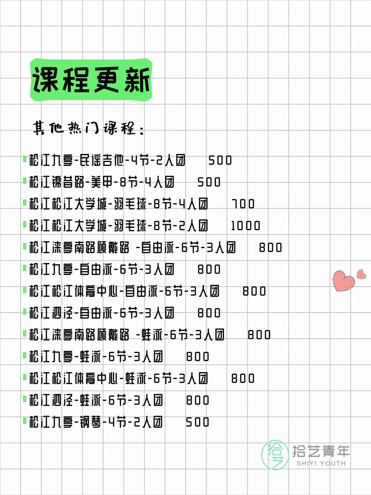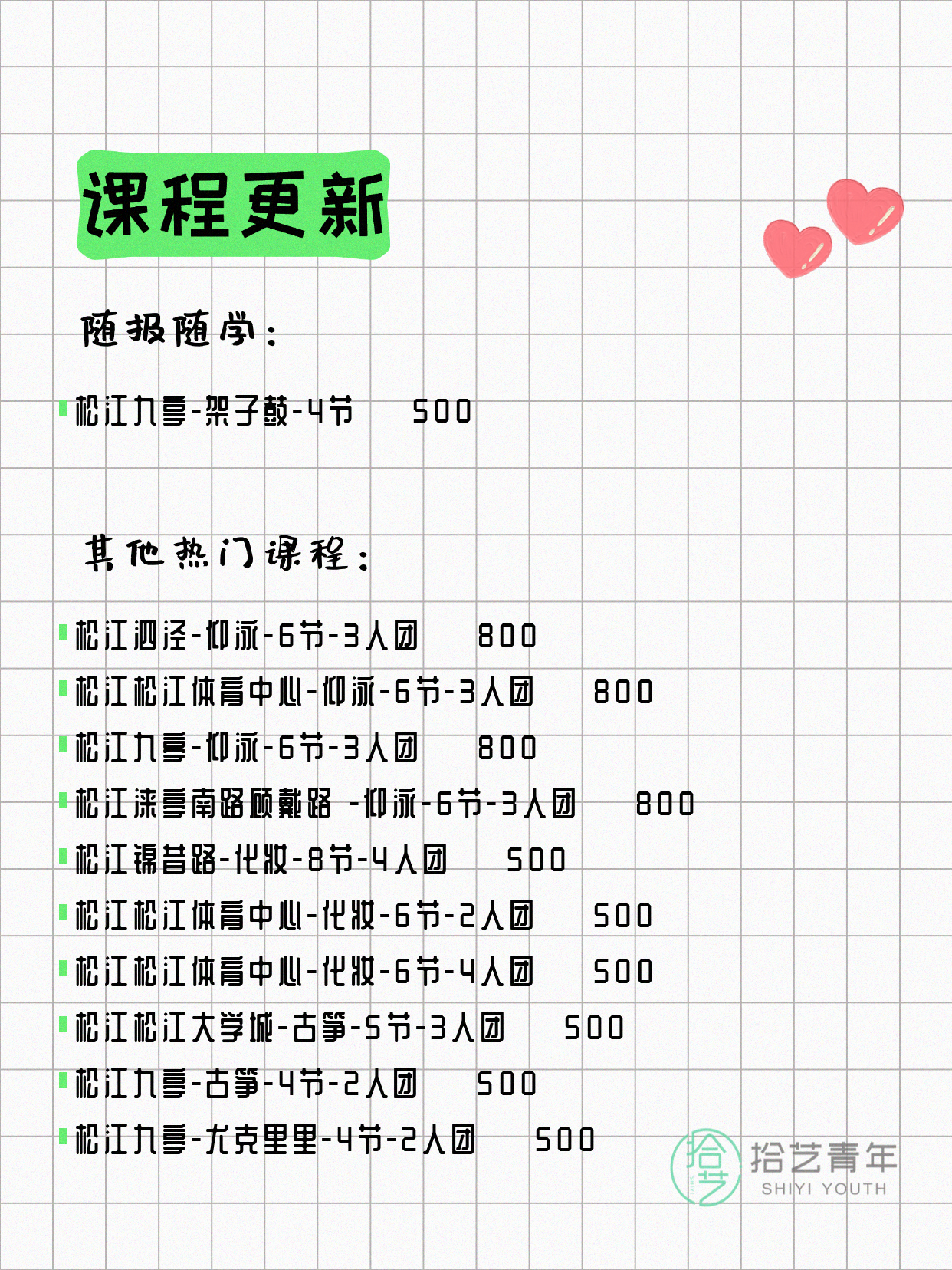💡 提示:以上课程信息来自拾艺青年小程序,课程可能随报名动态变化,具体以小程序实时信息为准。