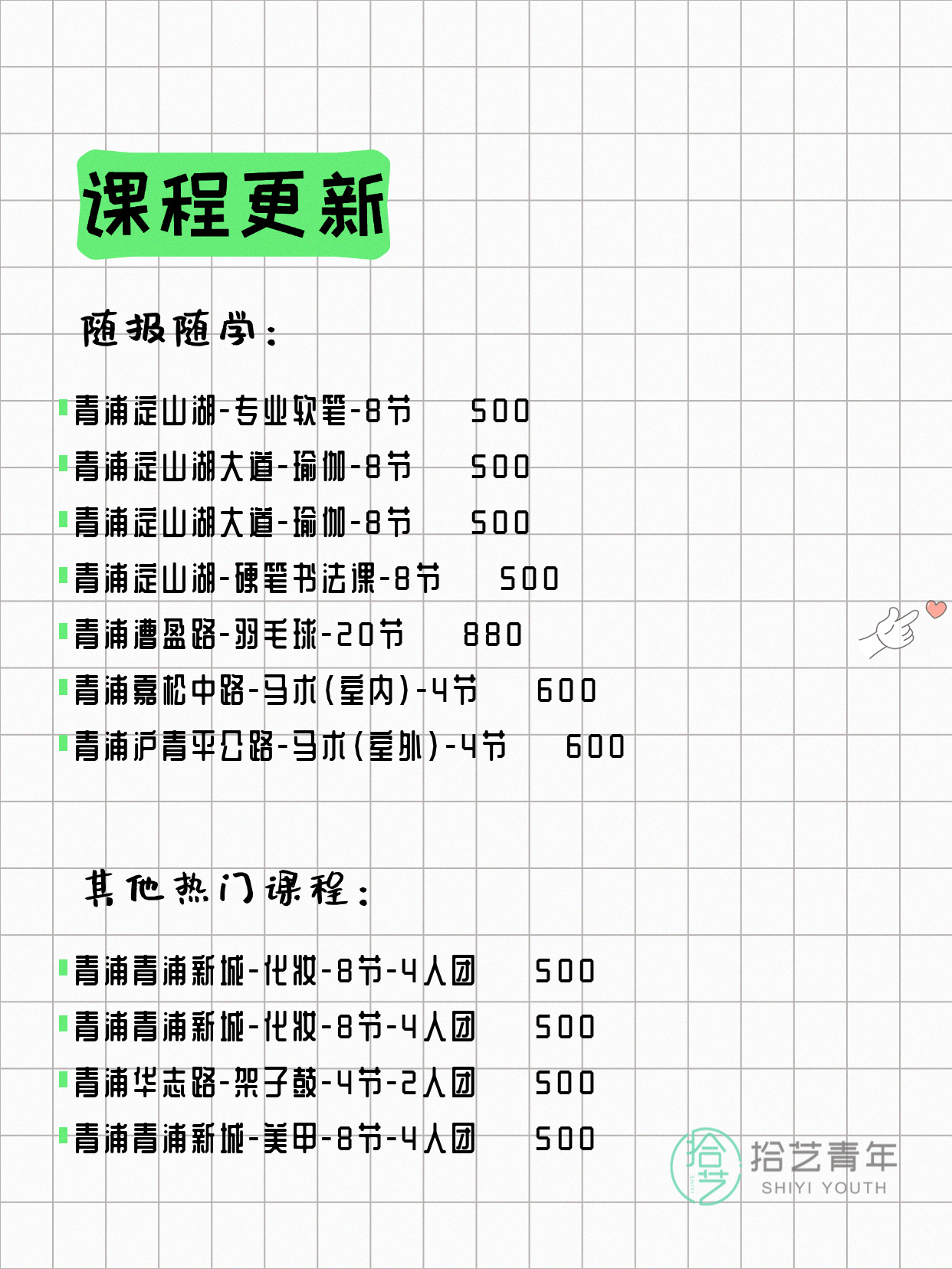 💡 提示:以上课程信息来自拾艺青年小程序,课程可能随报名动态变化,具体以小程序实时信息为准。
