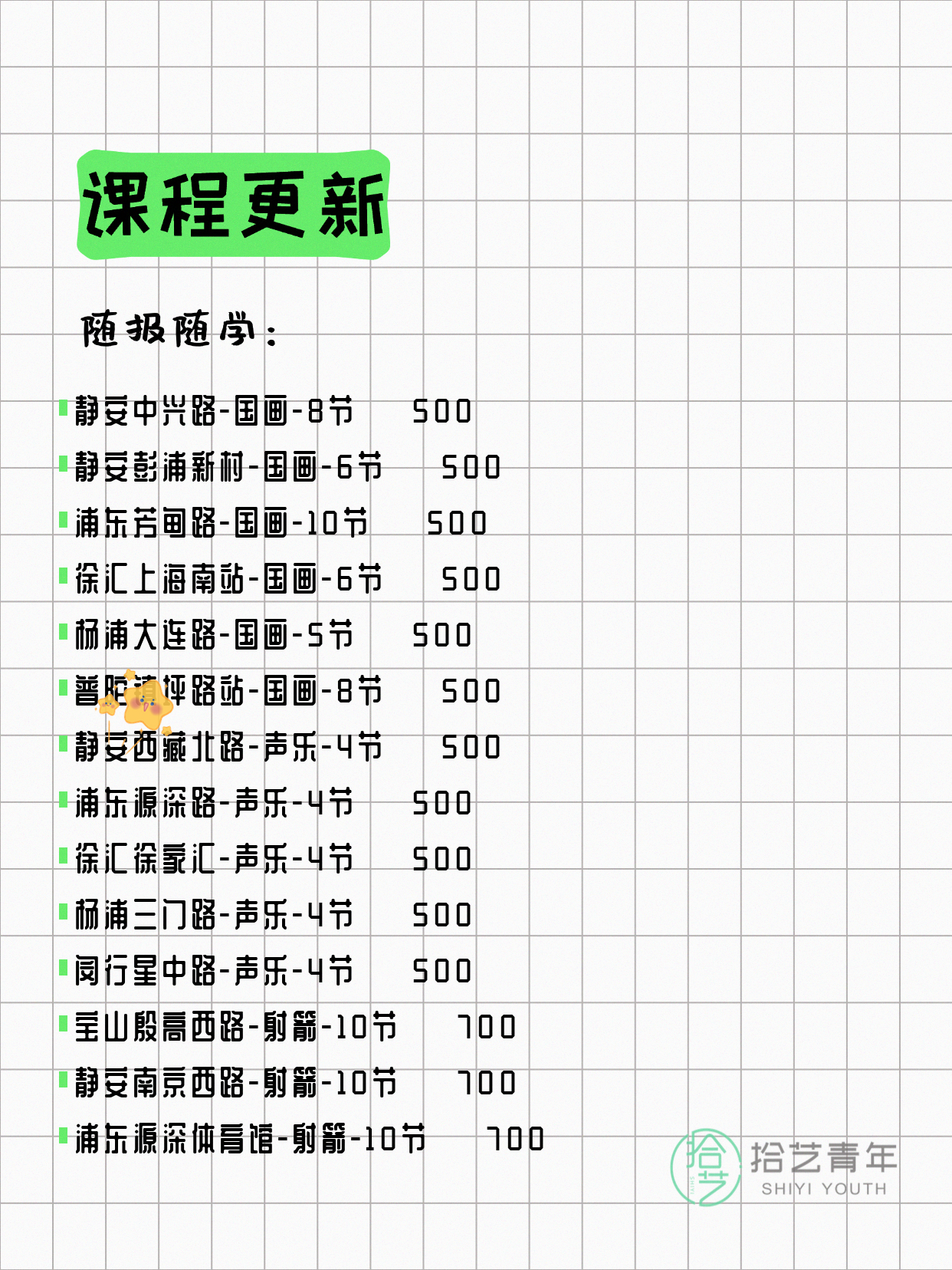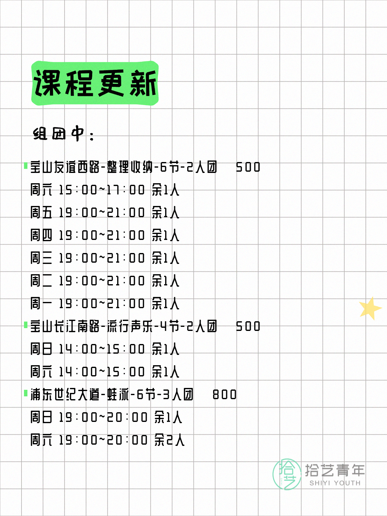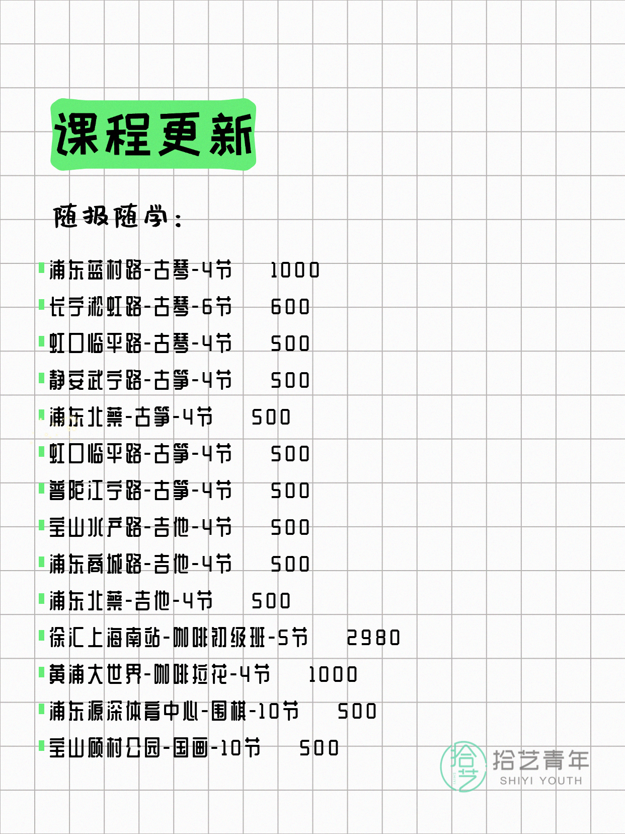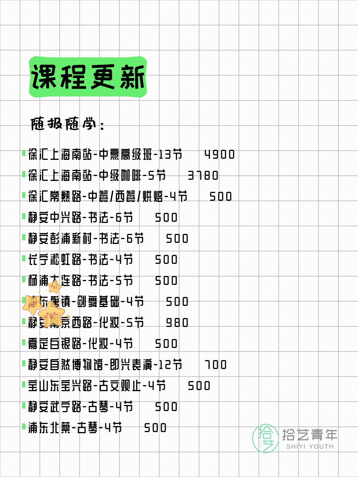 资讯>综合>正文4月24日上海夜校课程合集拾艺青年2026-04-241 / 17📊 本期课程概况• 总课程数:553门• 组团中课程:90门• 覆盖区域:15个区详见图片,欢迎报名咨询。💡 提示:以上课程信息来自拾艺青年小程序,课程可能随报名动态变化,具体以小程序实时信息为准。👉 微信小程序链接:#小程序://拾艺青年/WmfwH22mnQUxZwb
