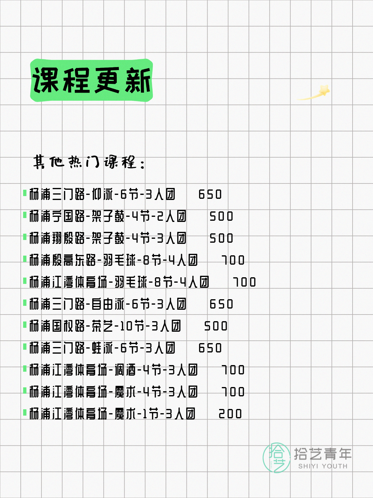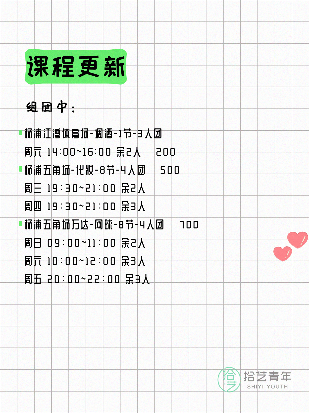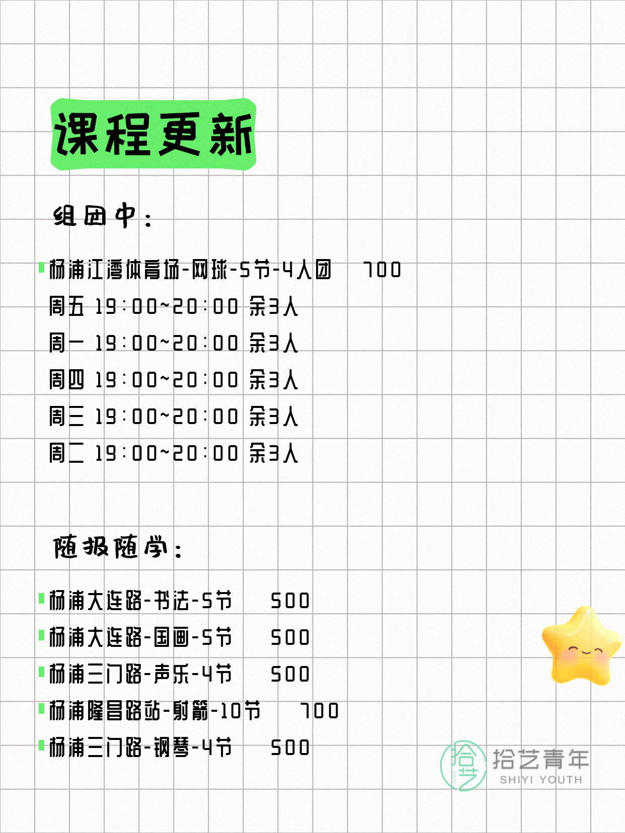 💡 提示:以上课程信息来自拾艺青年小程序,课程可能随报名动态变化,具体以小程序实时信息为准。
