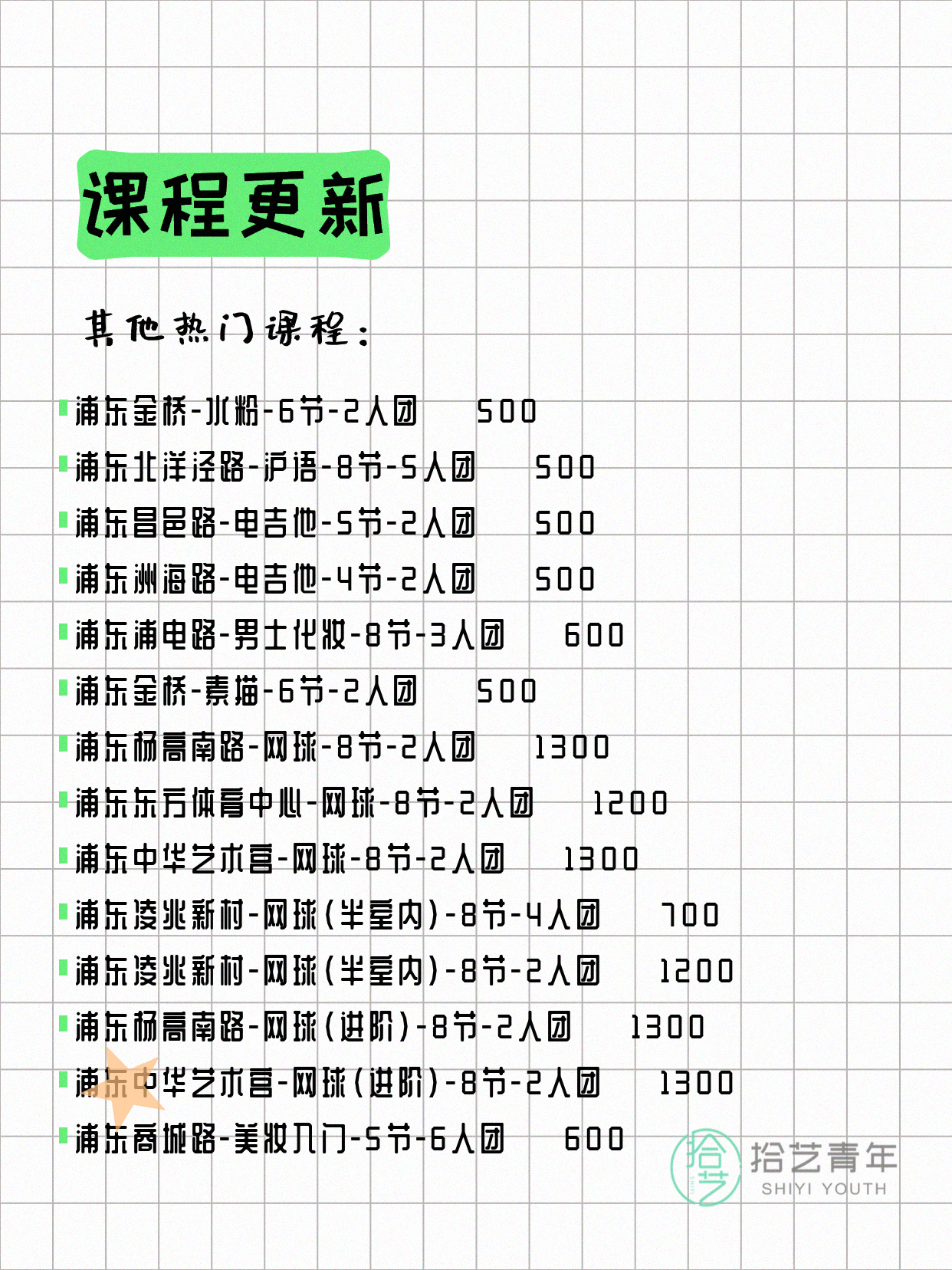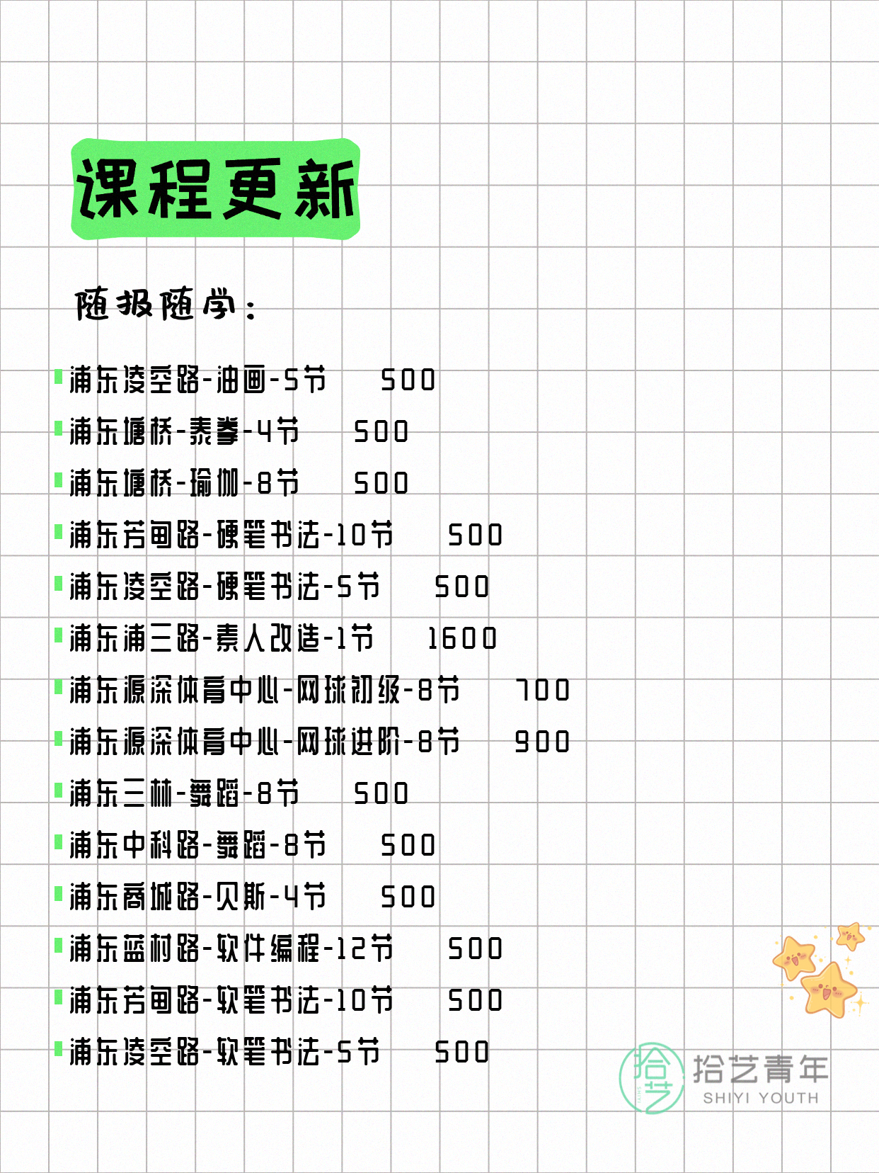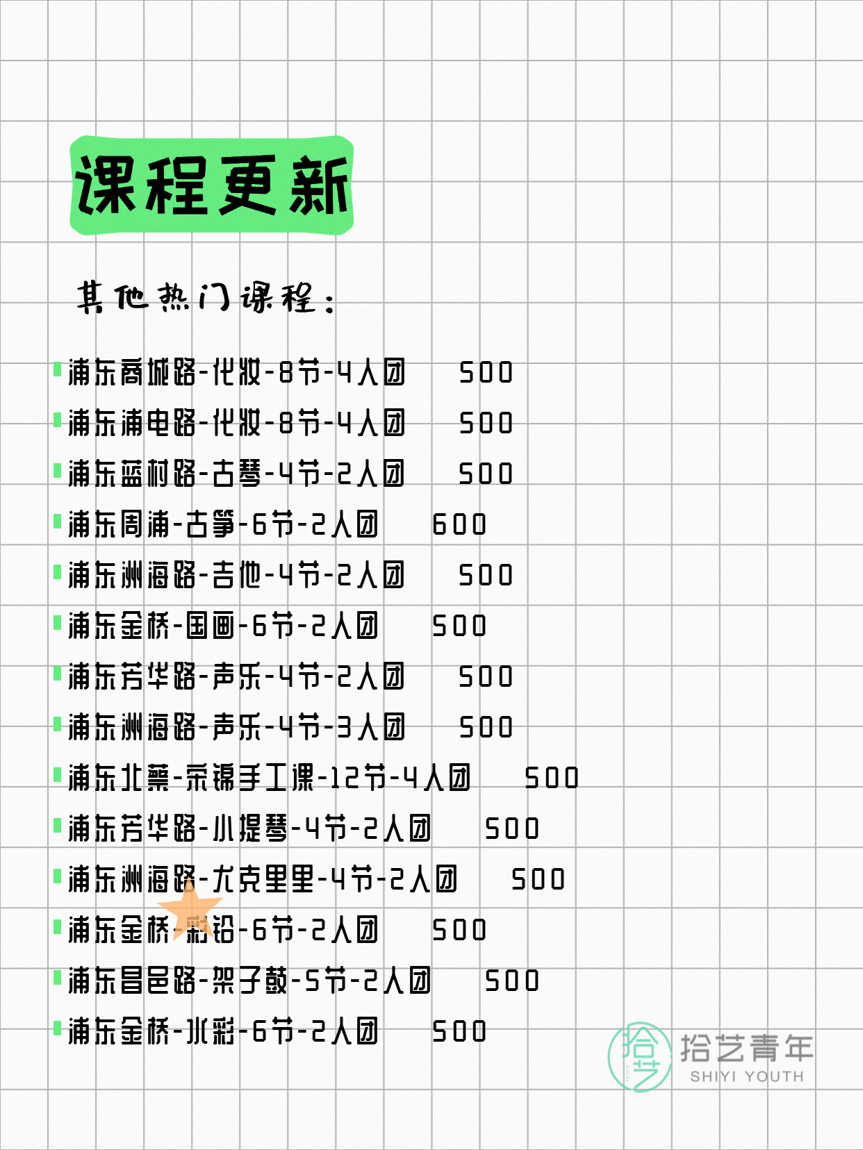 💡 提示:以上课程信息来自拾艺青年小程序,课程可能随报名动态变化,具体以小程序实时信息为准。
