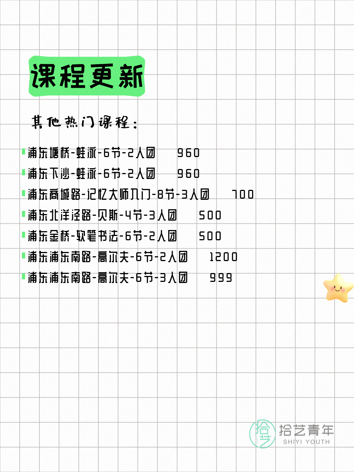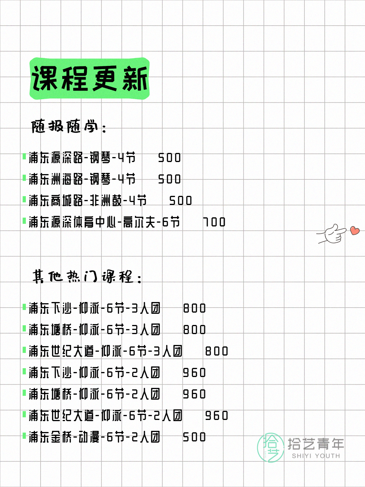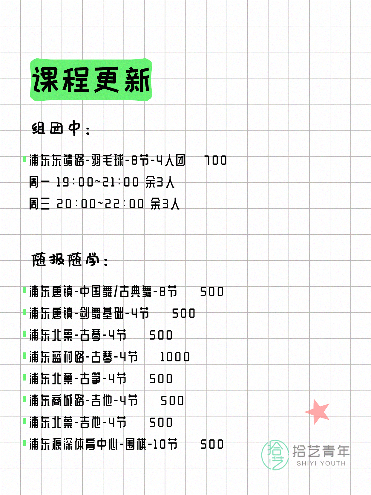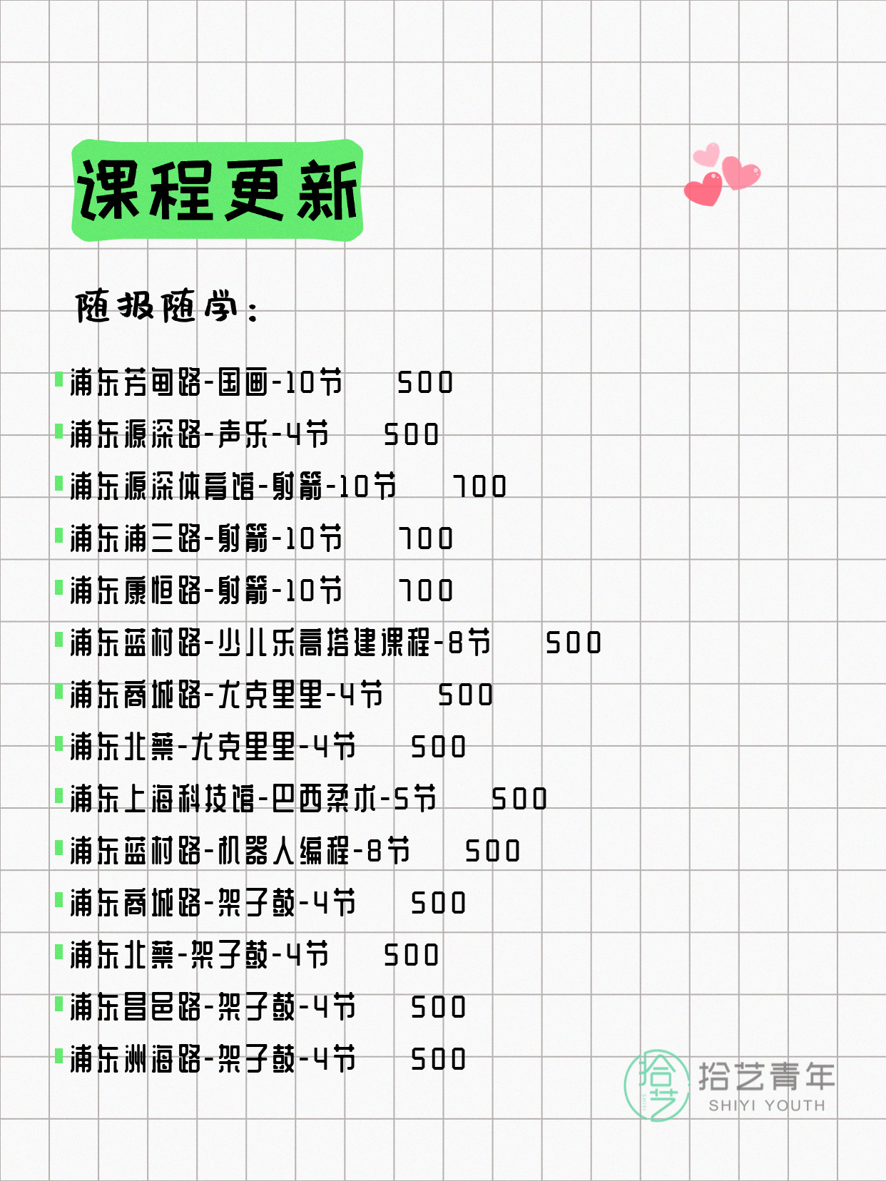 💡 提示:以上课程信息来自拾艺青年小程序,课程可能随报名动态变化,具体以小程序实时信息为准。
