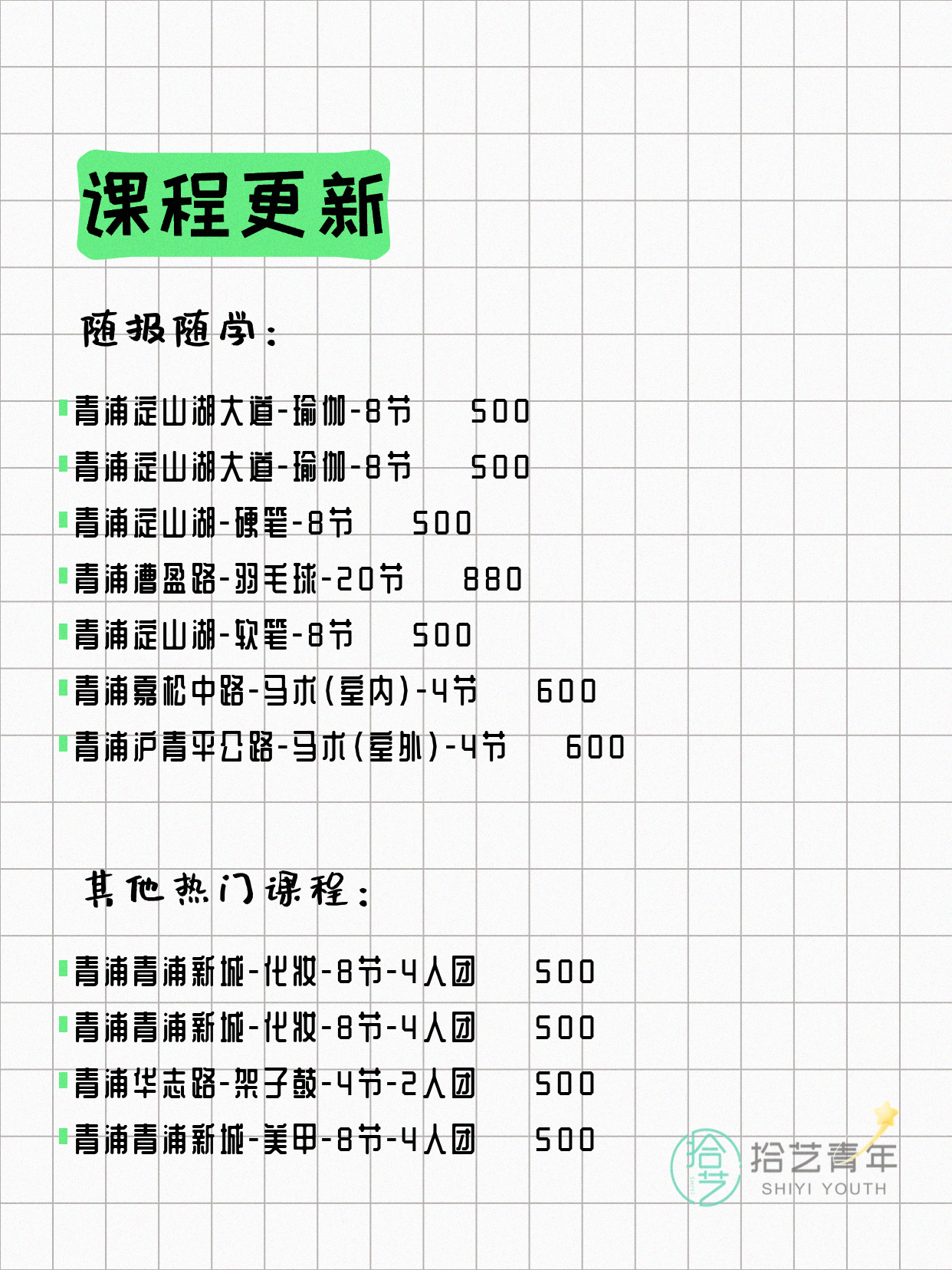 💡 提示:以上课程信息来自拾艺青年小程序,课程可能随报名动态变化,具体以小程序实时信息为准。