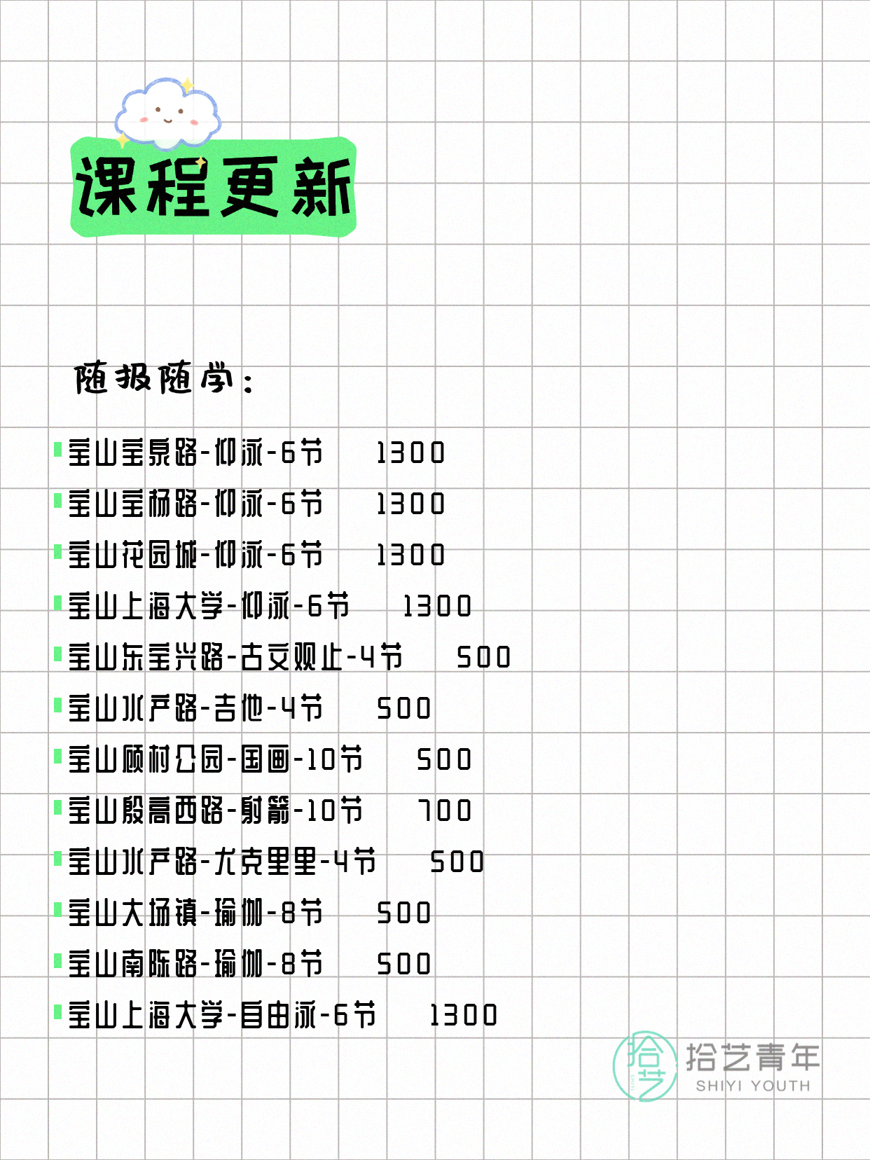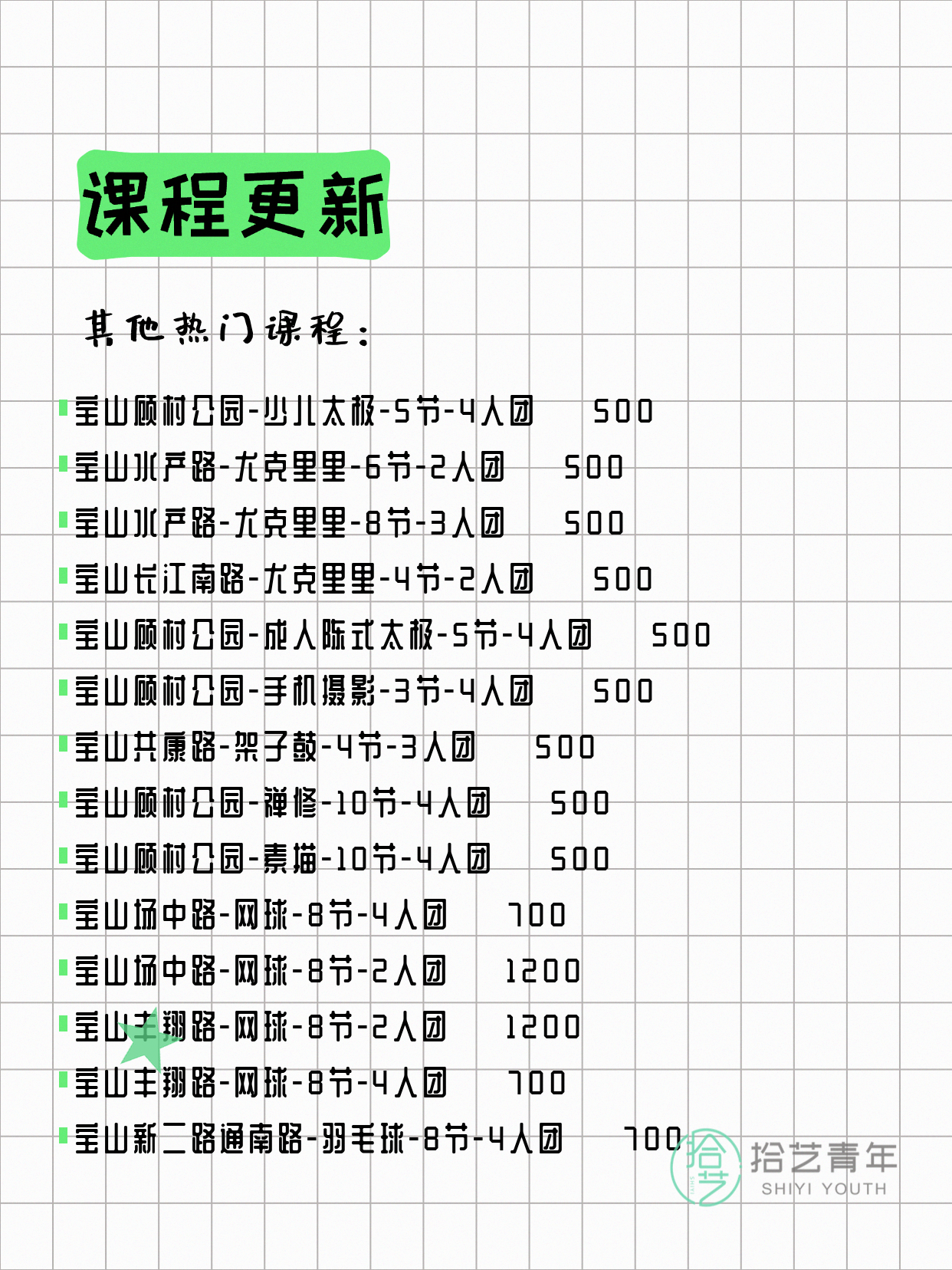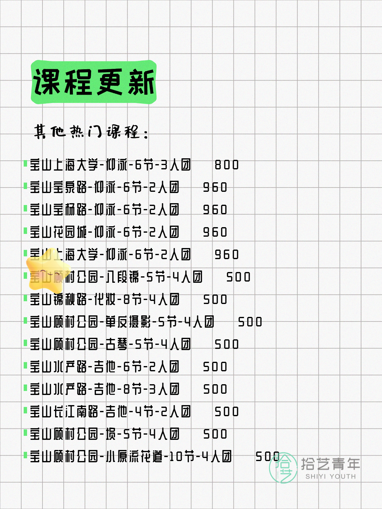 💡 提示:以上课程信息来自拾艺青年小程序,课程可能随报名动态变化,具体以小程序实时信息为准。