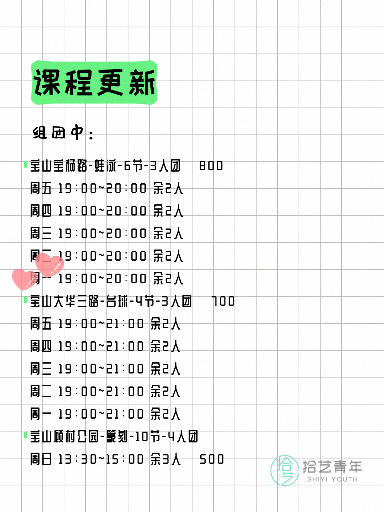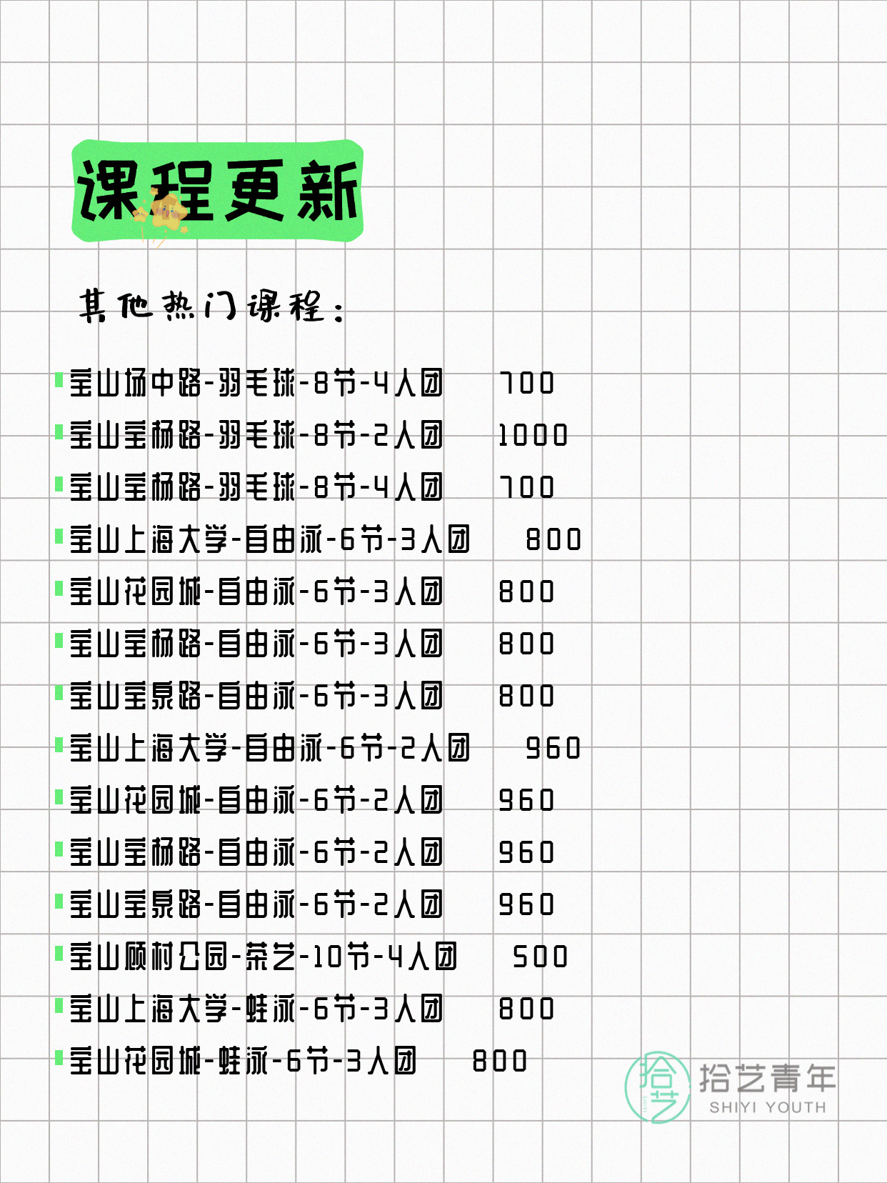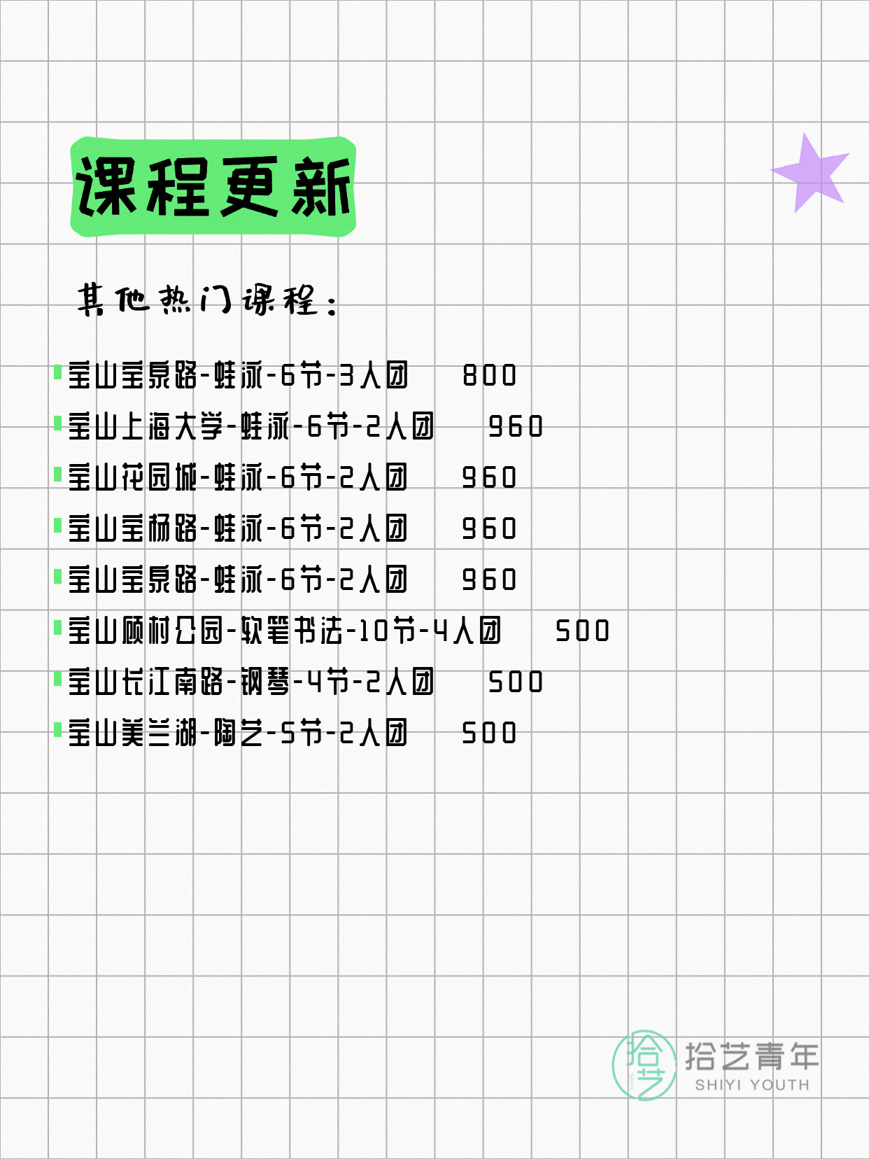 💡 提示:以上课程信息来自拾艺青年小程序,课程可能随报名动态变化,具体以小程序实时信息为准。