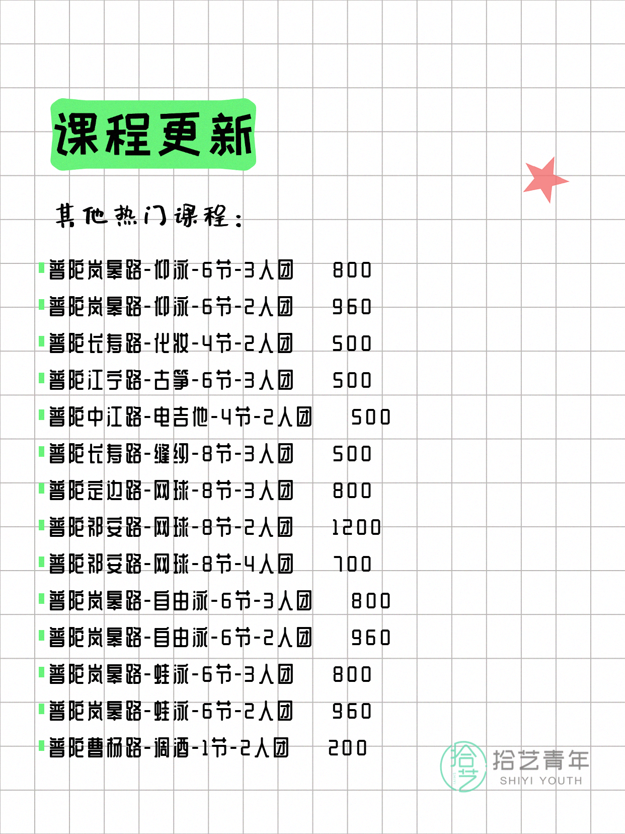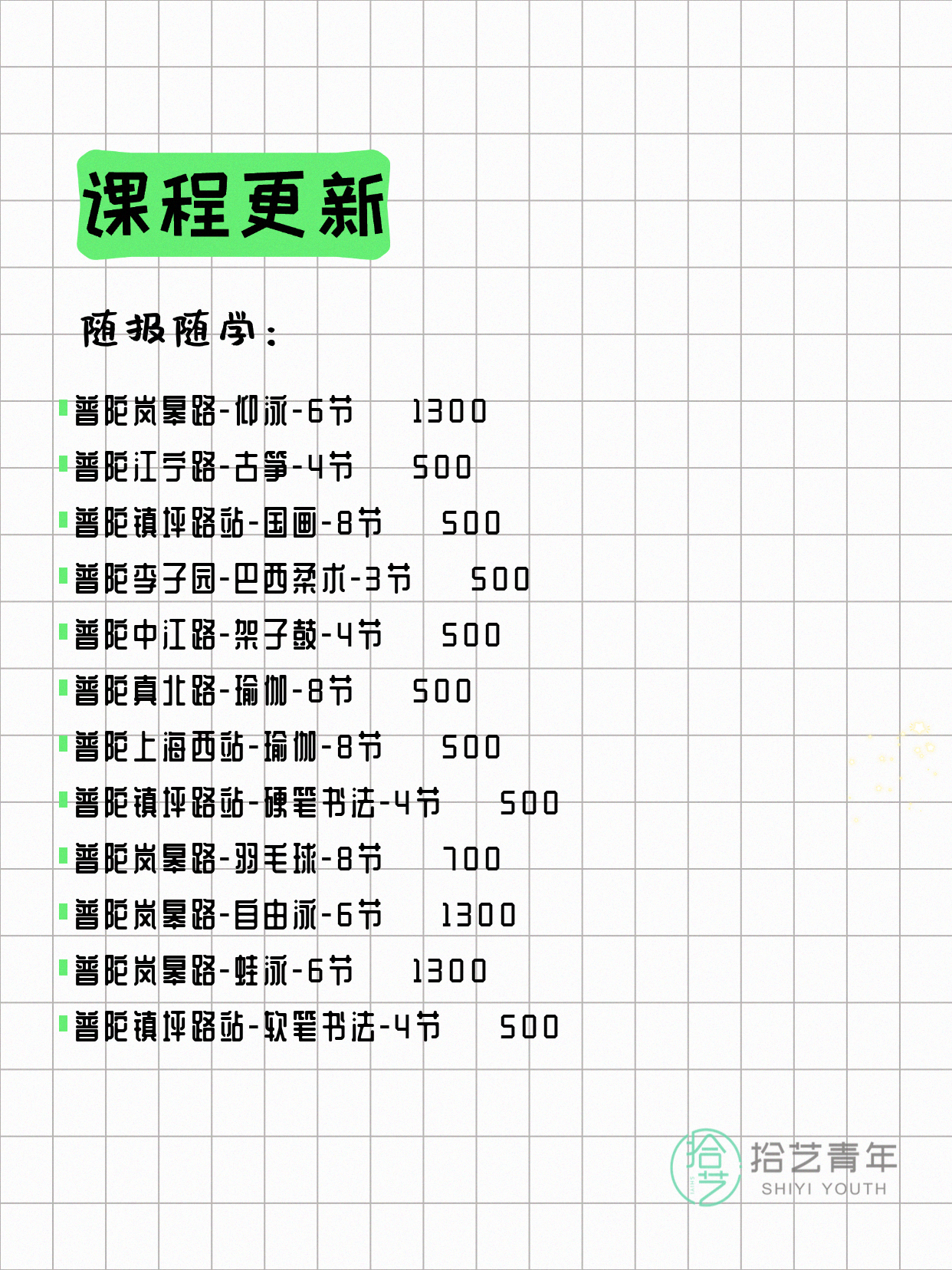 💡 提示:以上课程信息来自拾艺青年小程序,课程可能随报名动态变化,具体以小程序实时信息为准。