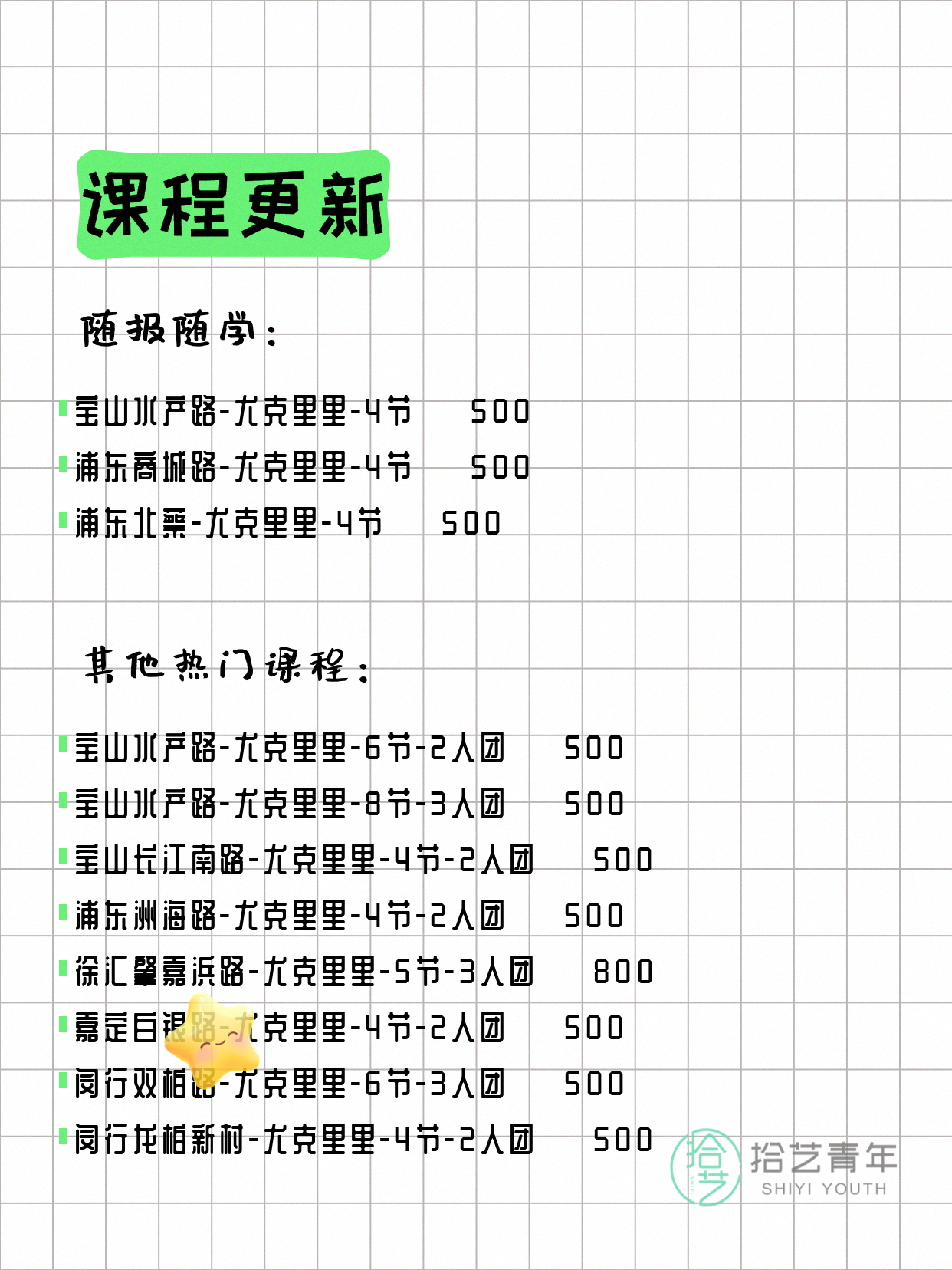 💡 提示:以上课程信息来自拾艺青年小程序,课程可能随报名动态变化,具体以小程序实时信息为准。
