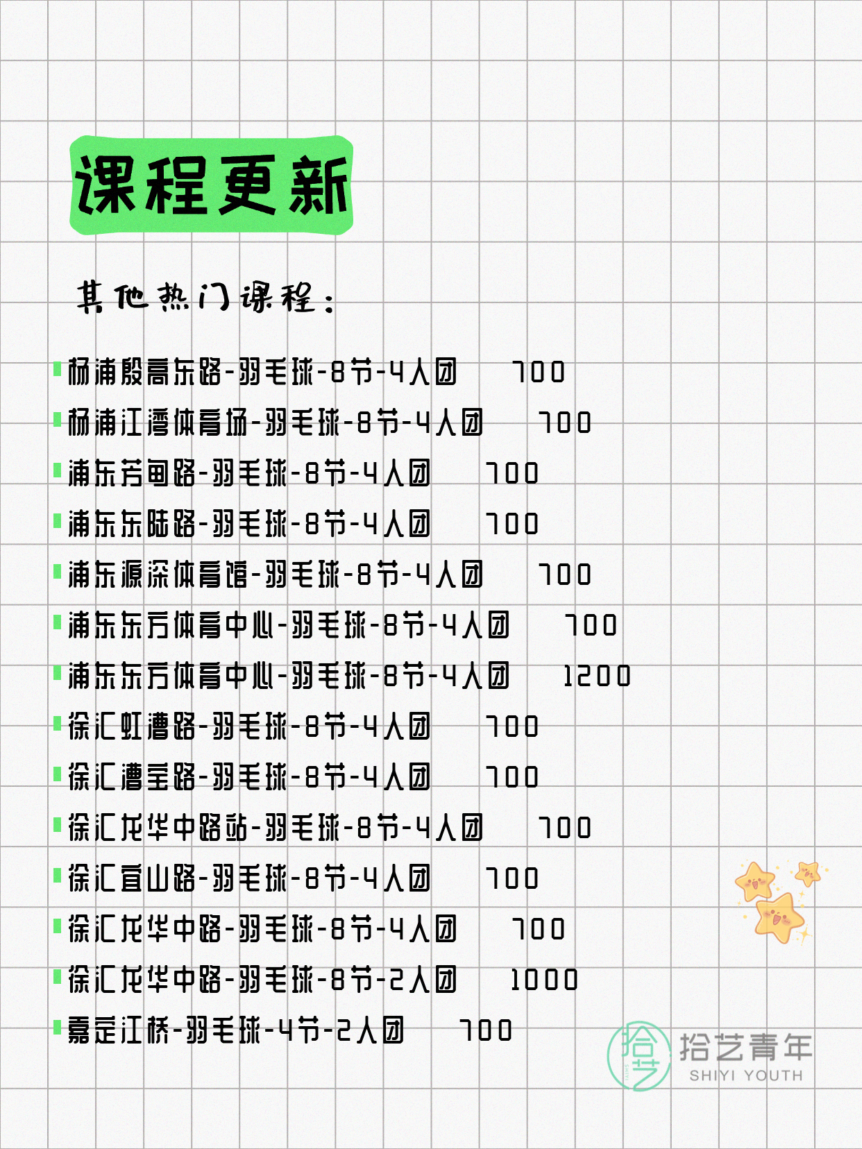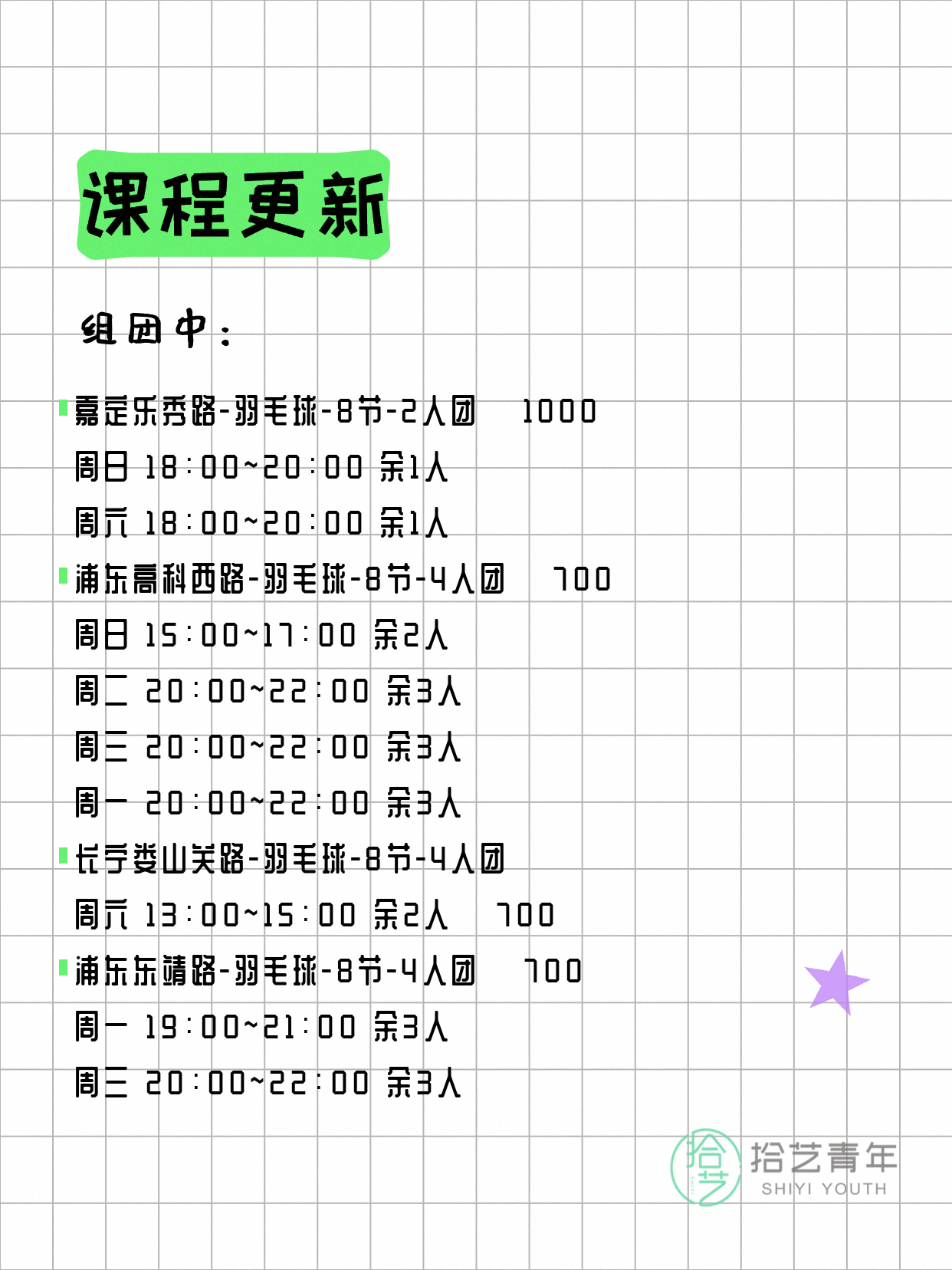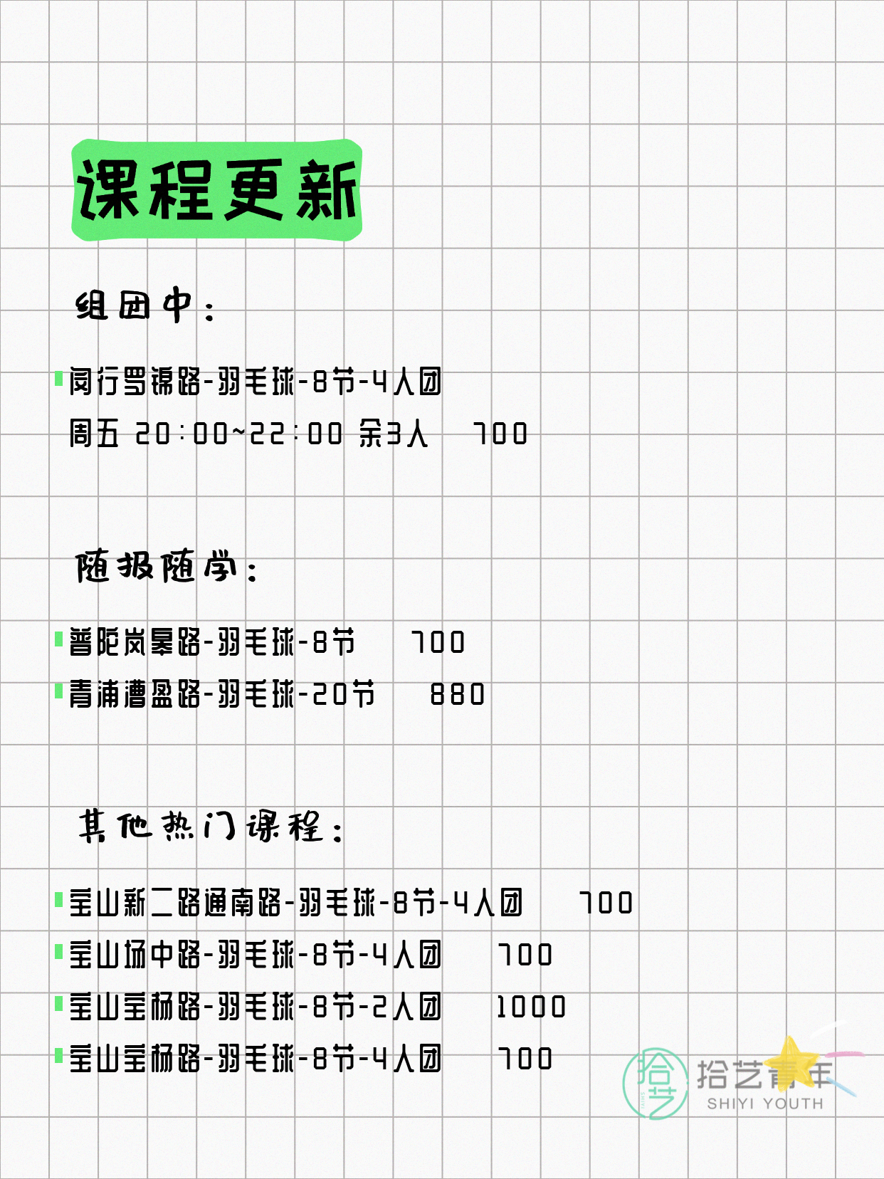 ⭐ 羽毛球-宝山宝杨路-8节-4人团 💰700
