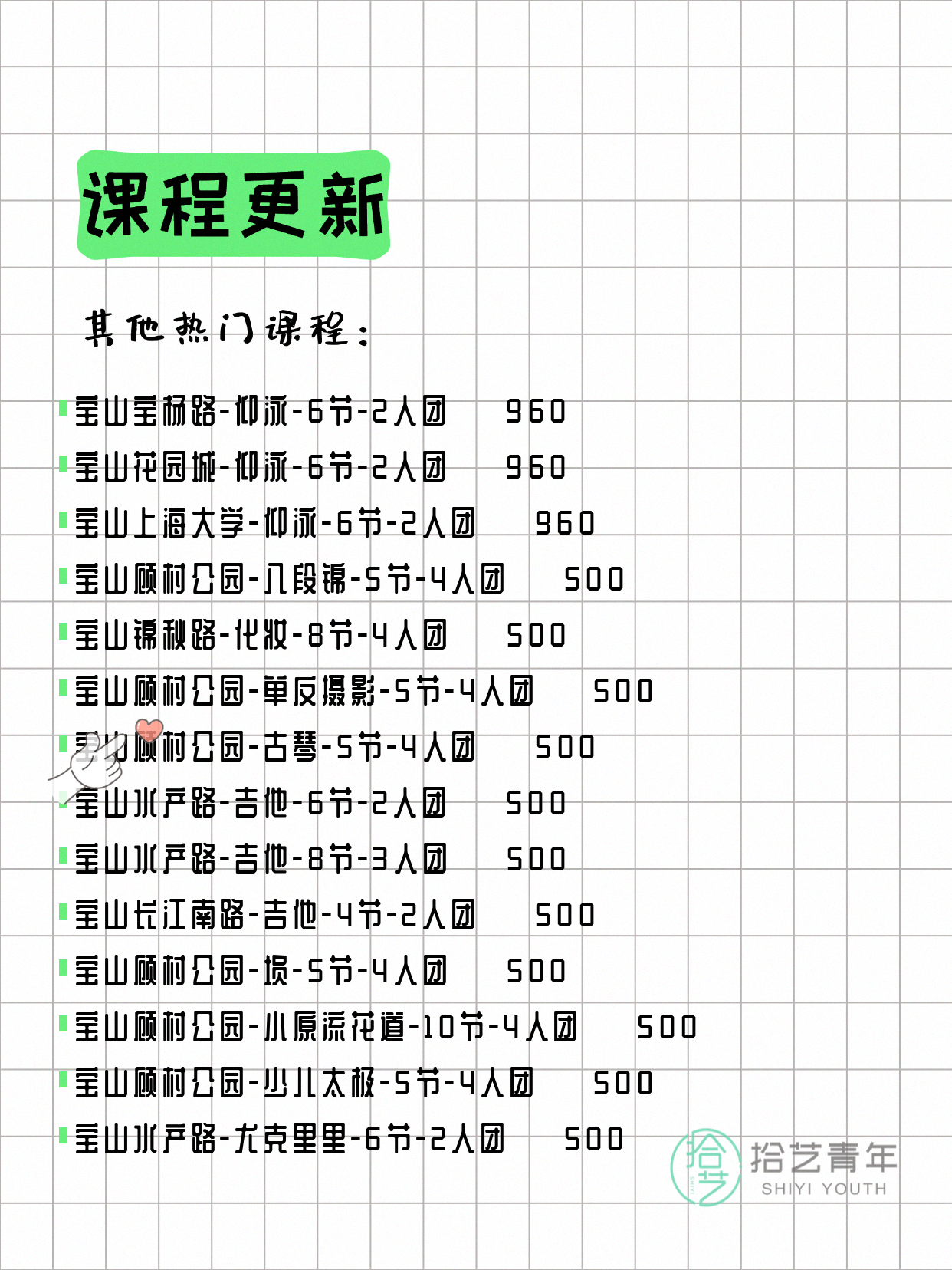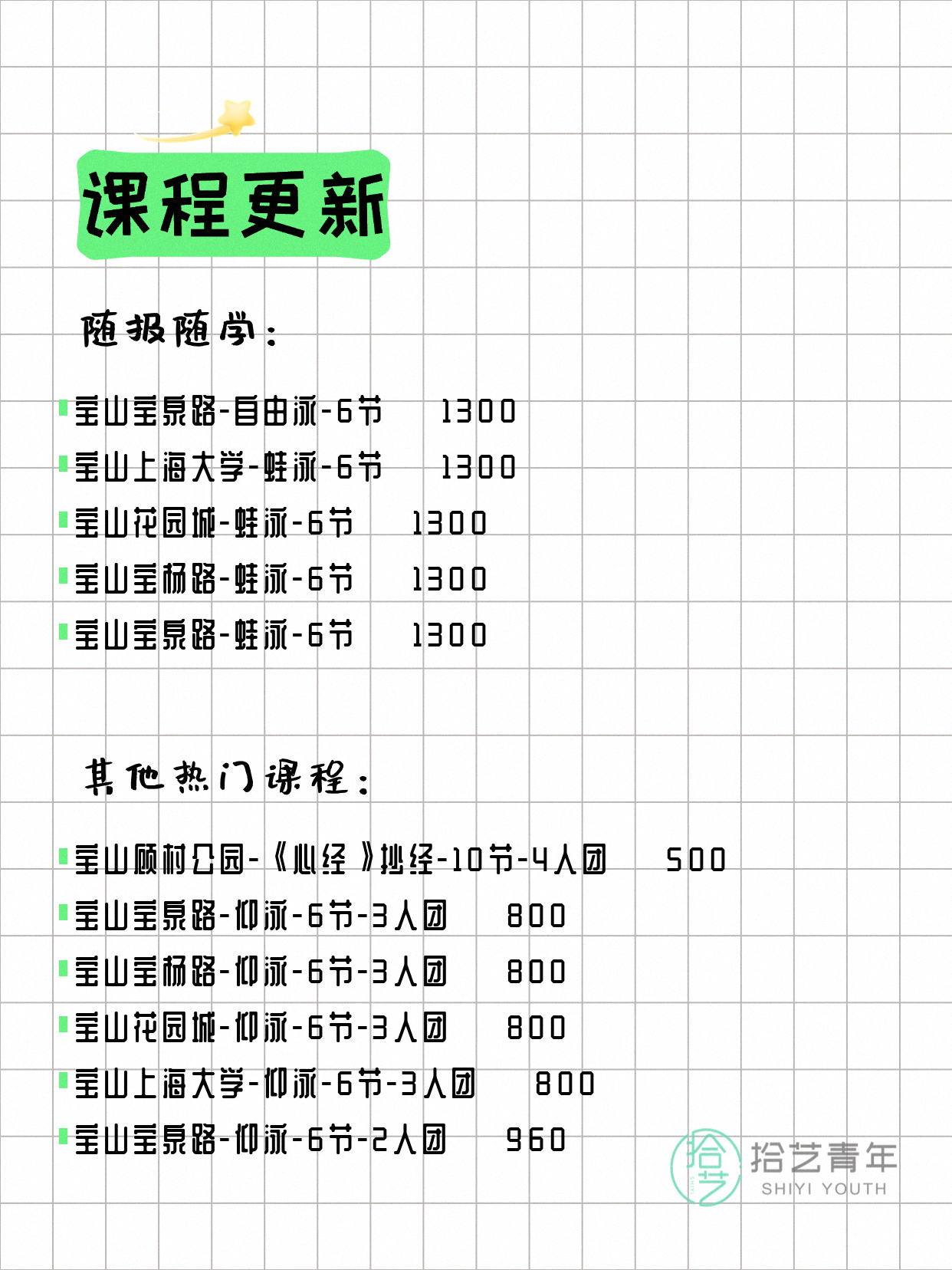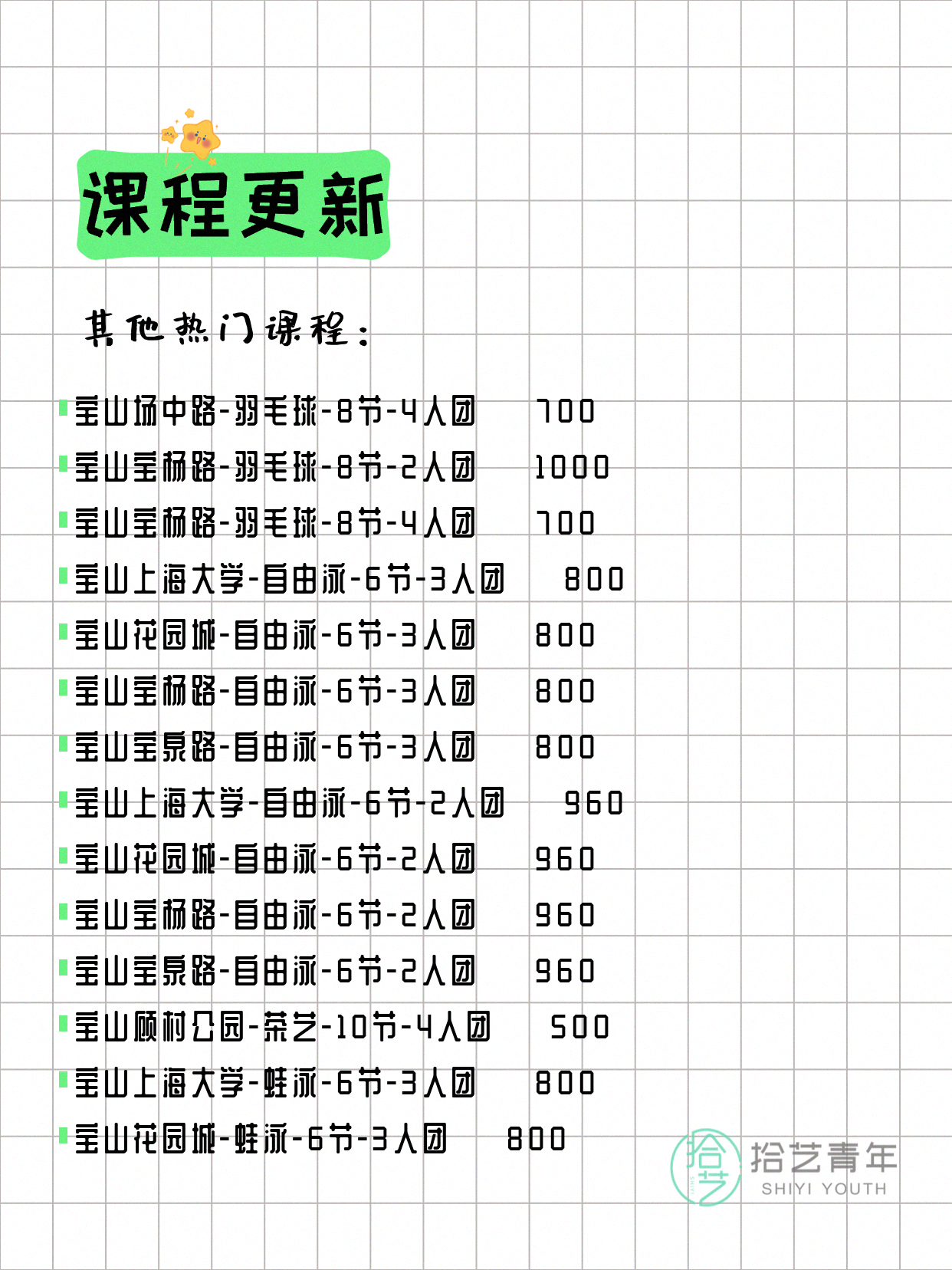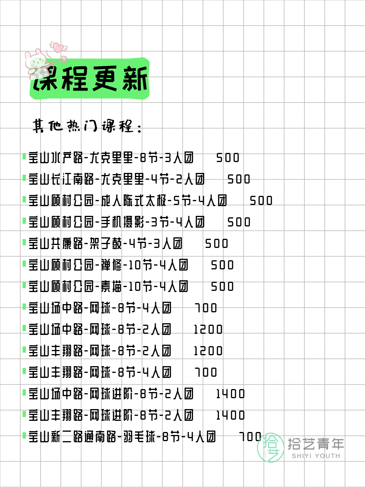 💡 提示:以上课程信息来自拾艺青年小程序,课程可能随报名动态变化,具体以小程序实时信息为准。