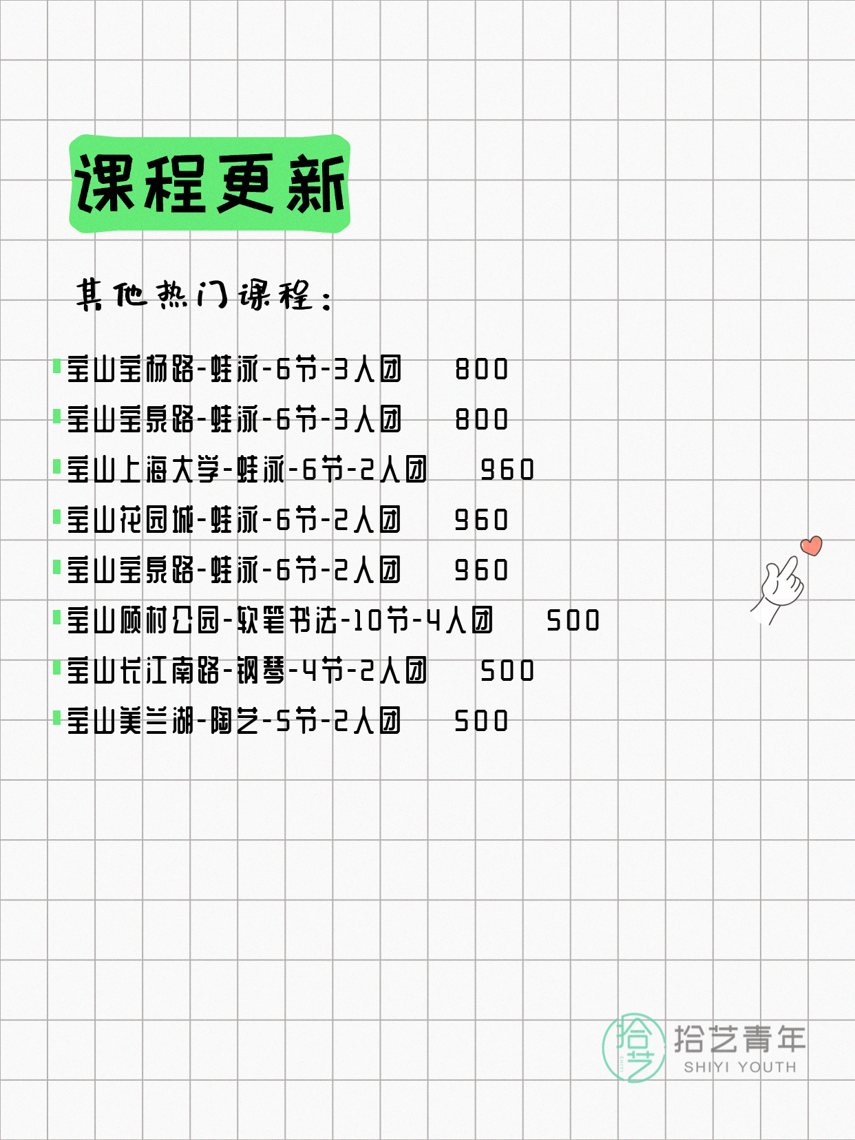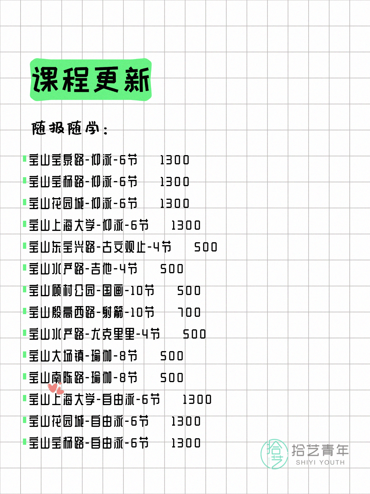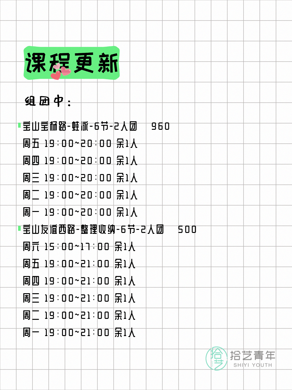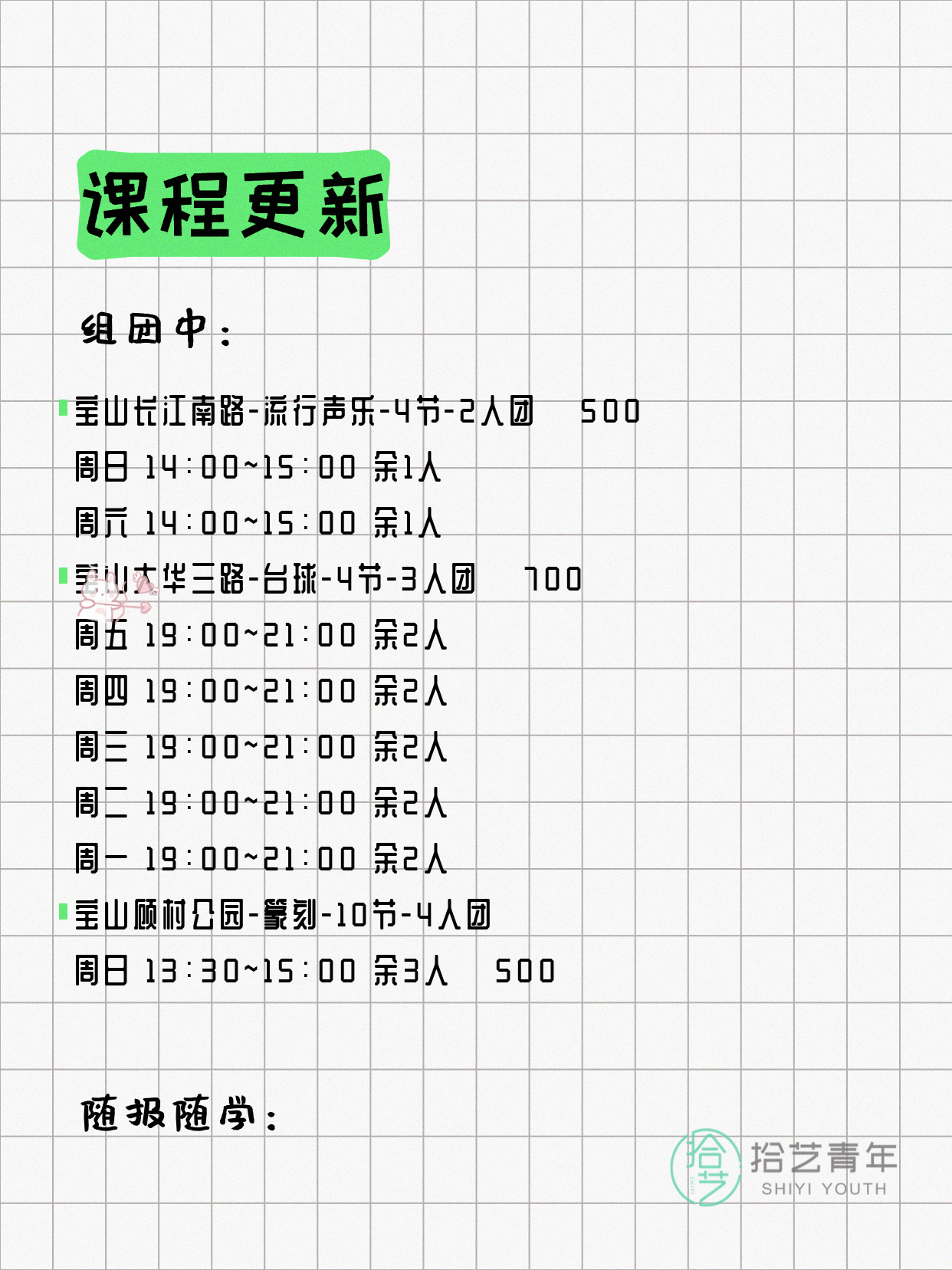 💡 提示:以上课程信息来自拾艺青年小程序,课程可能随报名动态变化,具体以小程序实时信息为准。