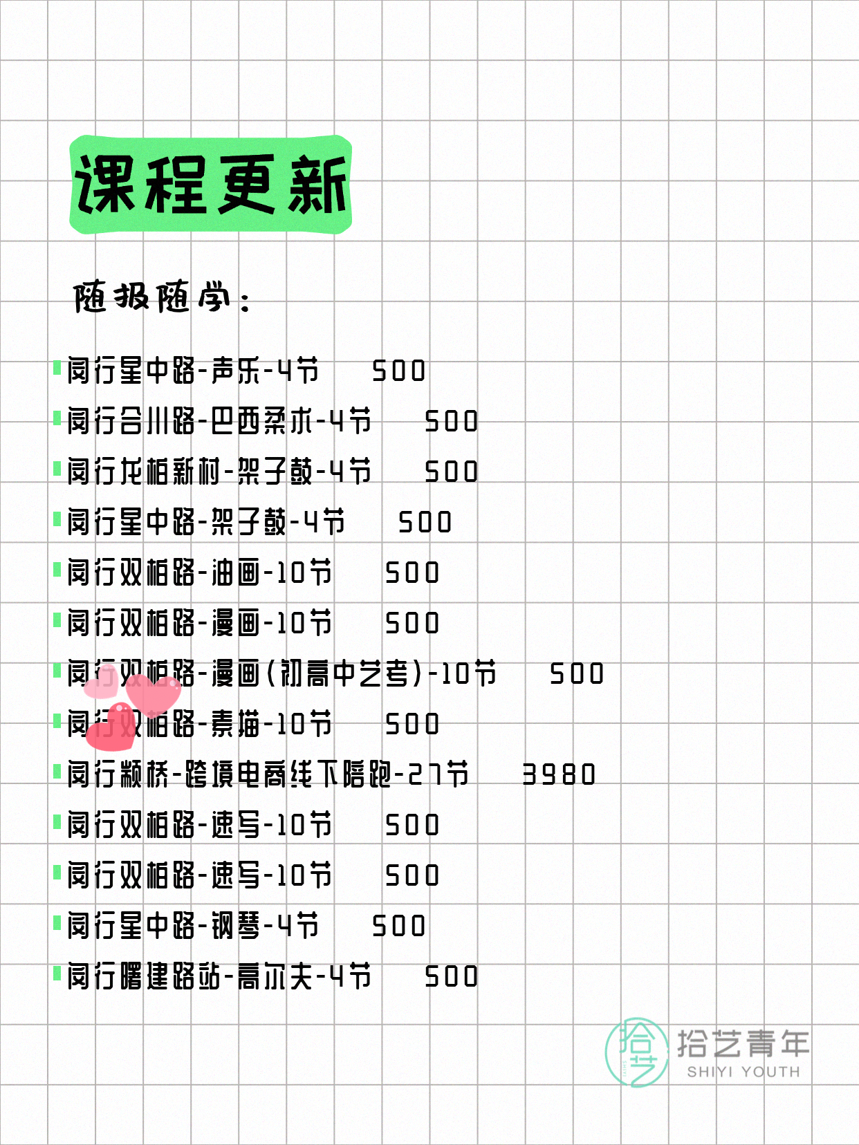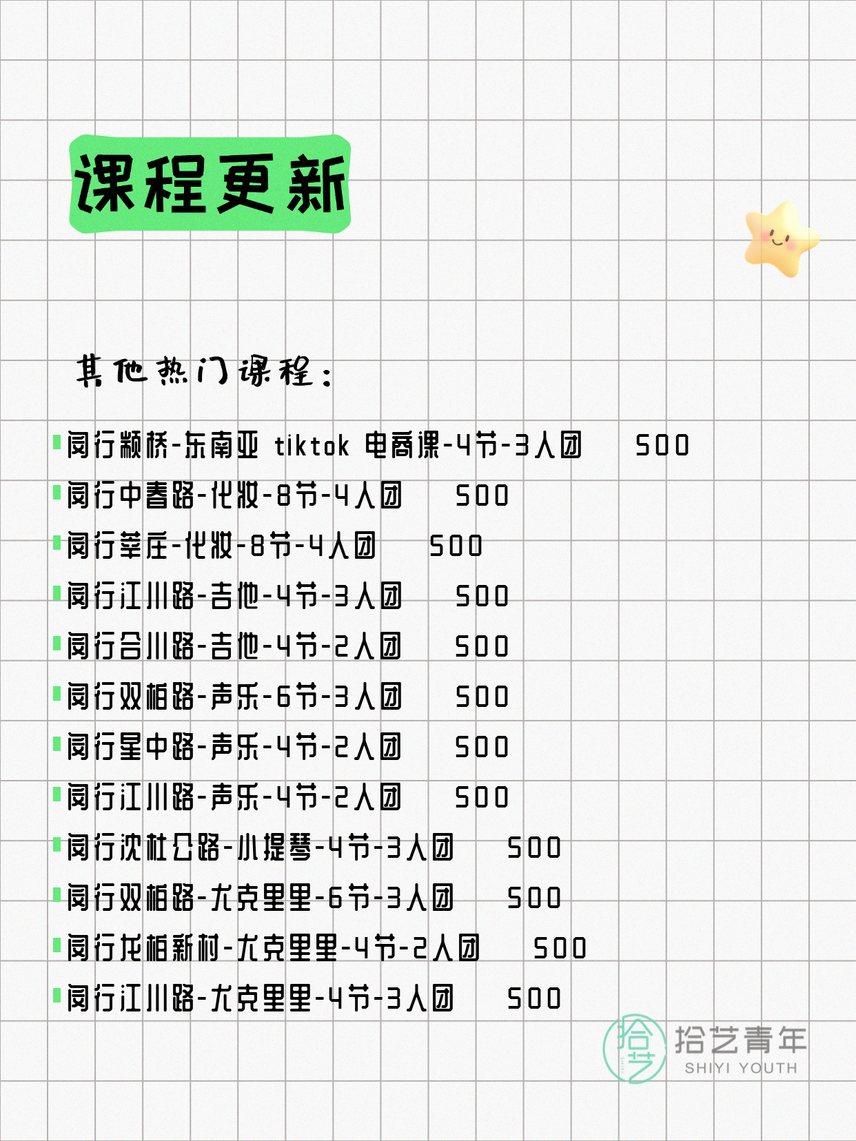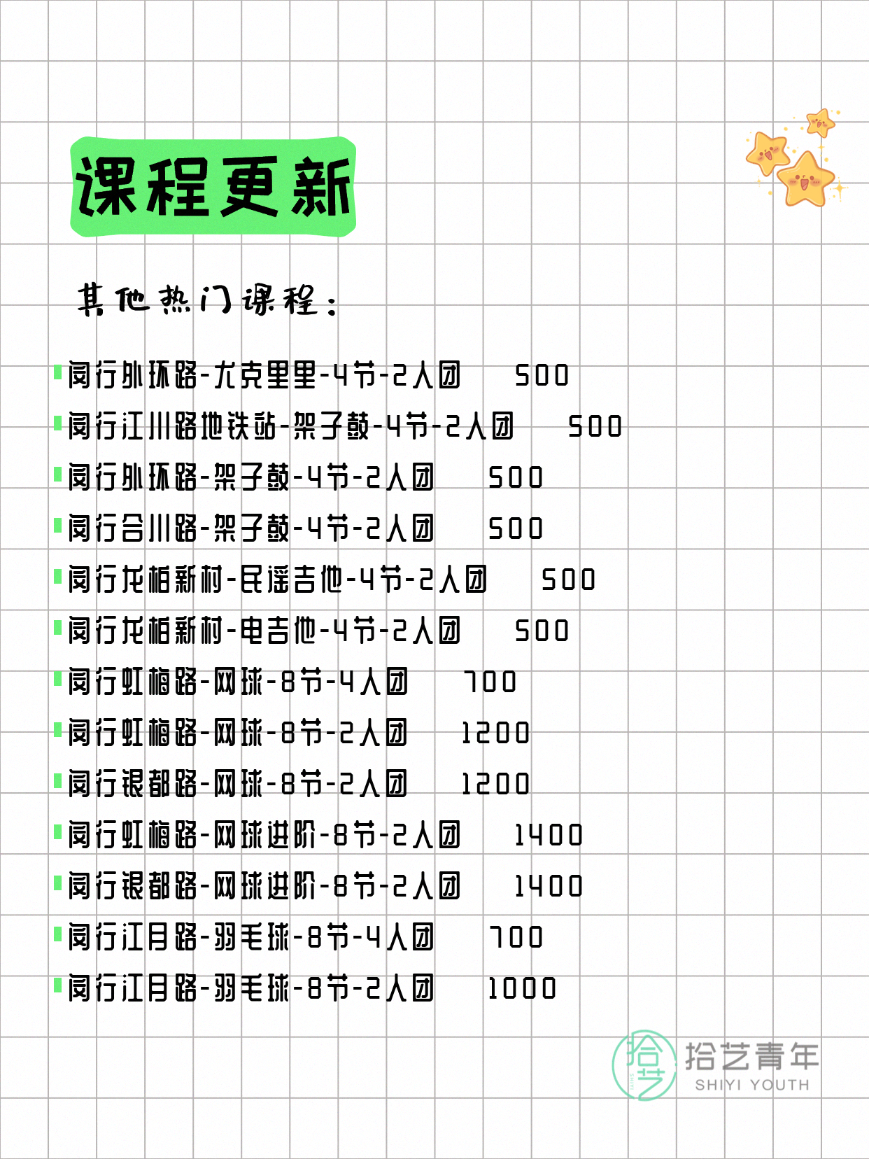 💡 提示:以上课程信息来自拾艺青年小程序,课程可能随报名动态变化,具体以小程序实时信息为准。