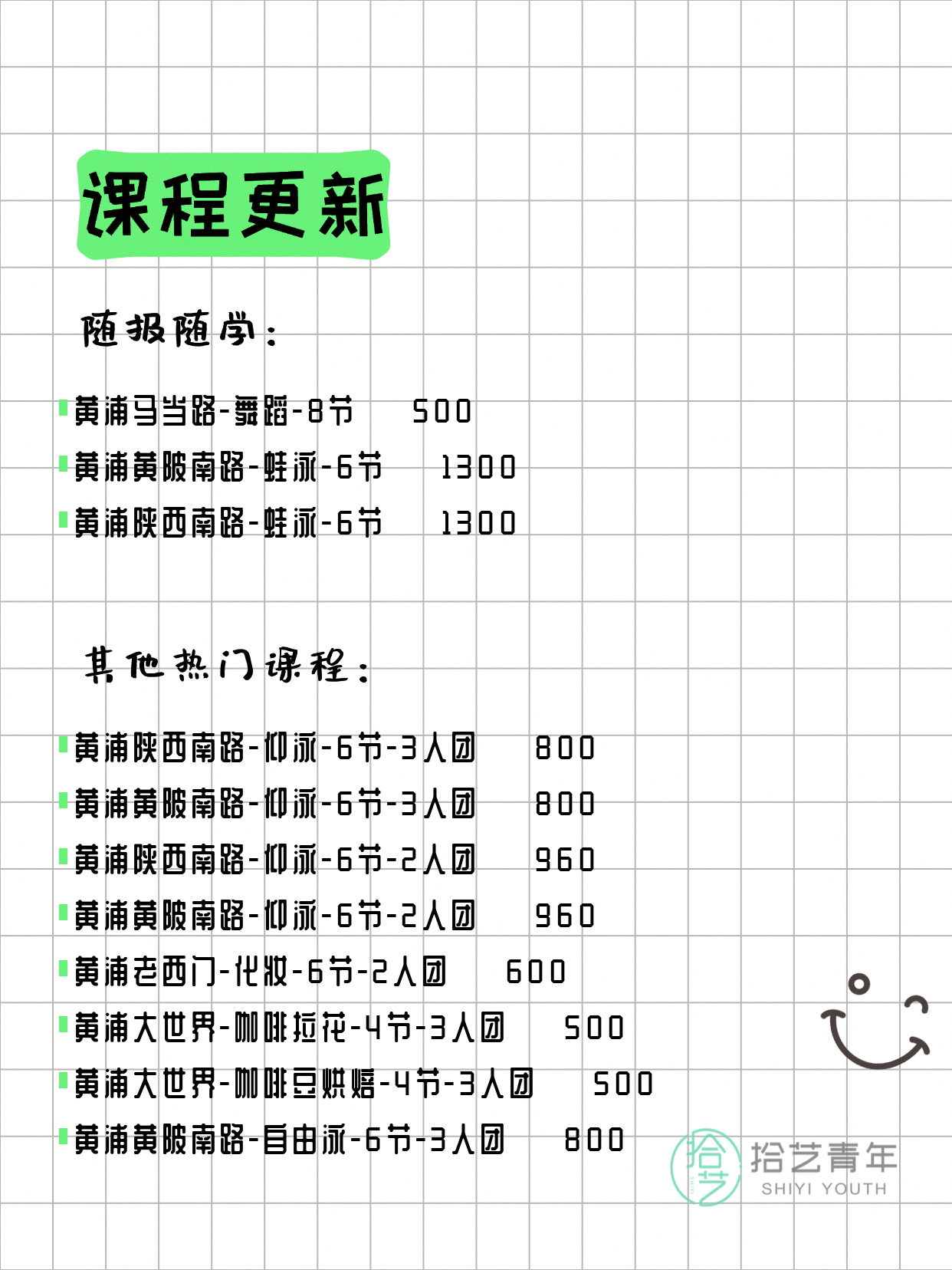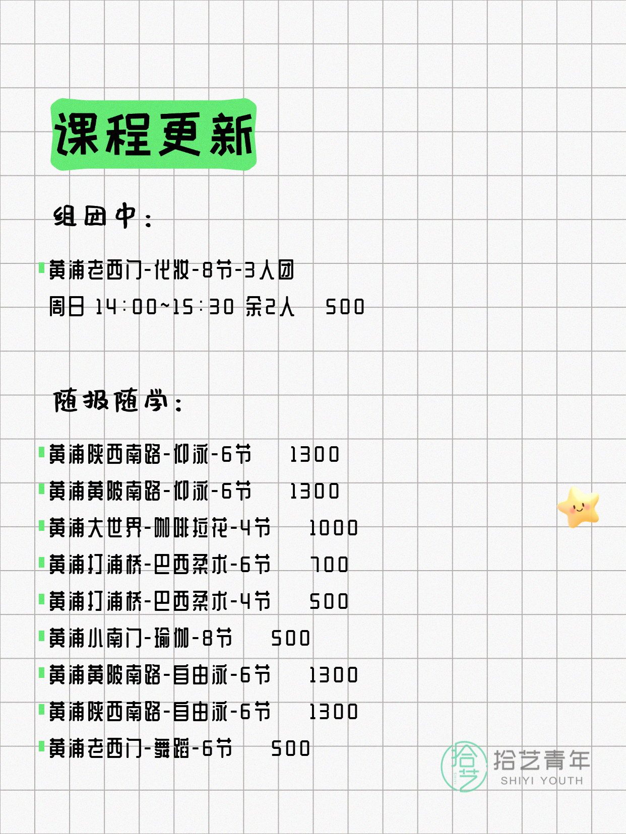 💡 提示:以上课程信息来自拾艺青年小程序,课程可能随报名动态变化,具体以小程序实时信息为准。