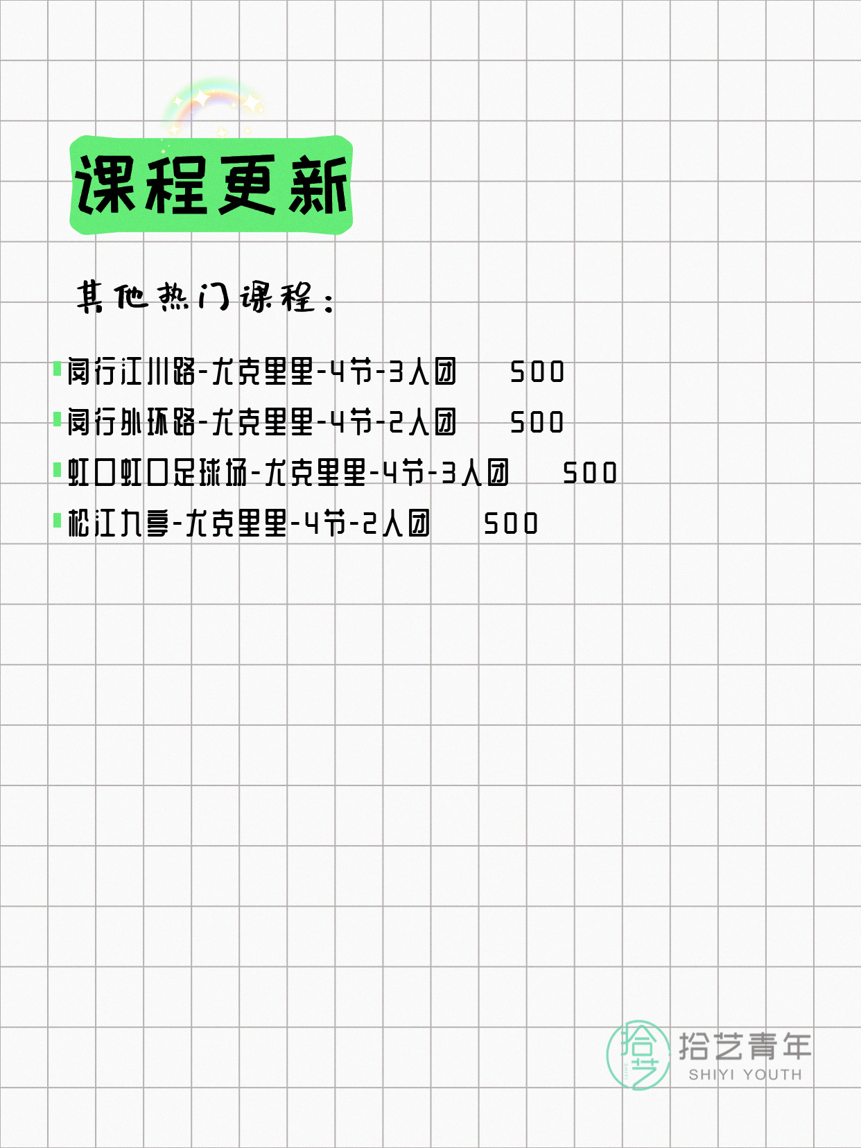 💡 提示:以上课程信息来自拾艺青年小程序,课程可能随报名动态变化,具体以小程序实时信息为准。