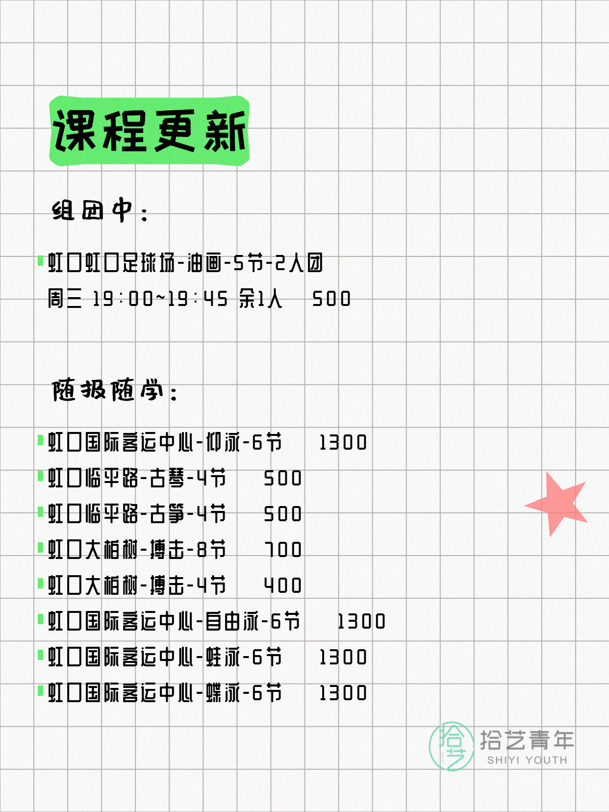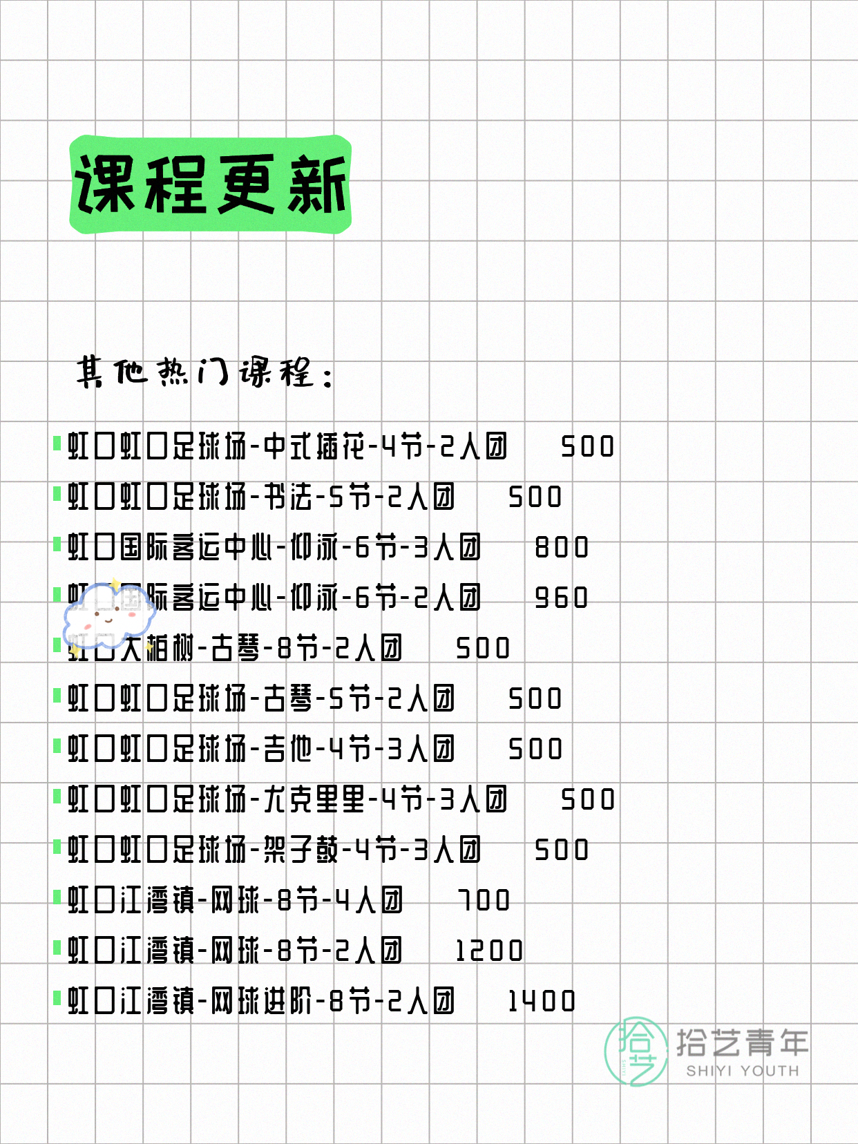 💡 提示:以上课程信息来自拾艺青年小程序,课程可能随报名动态变化,具体以小程序实时信息为准。