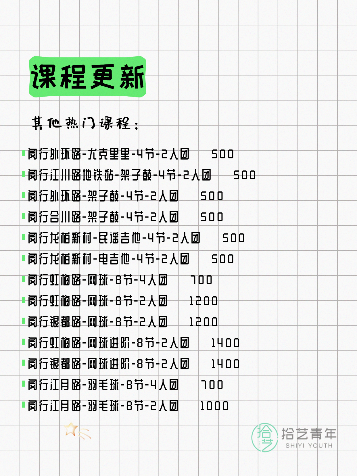 💡 提示:以上课程信息来自拾艺青年小程序,课程可能随报名动态变化,具体以小程序实时信息为准。