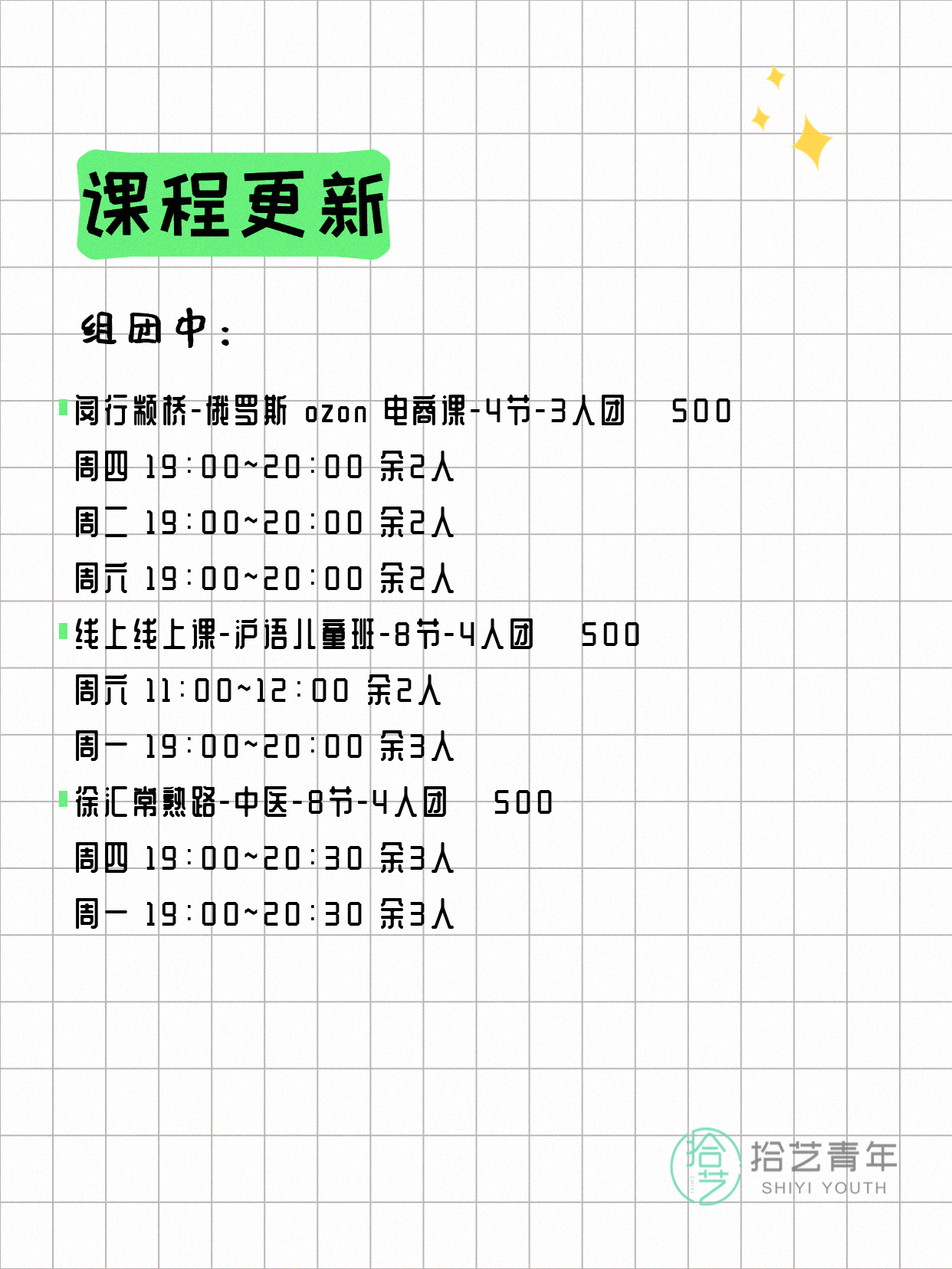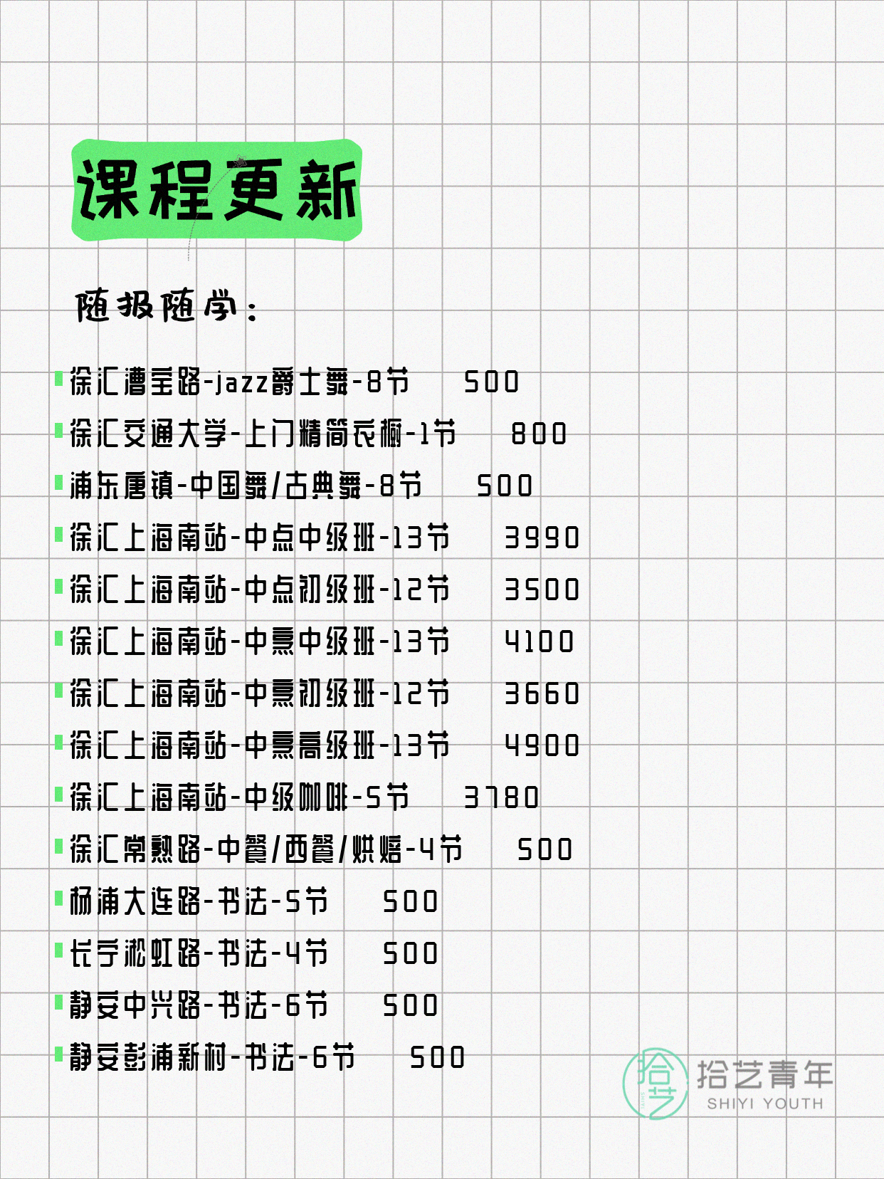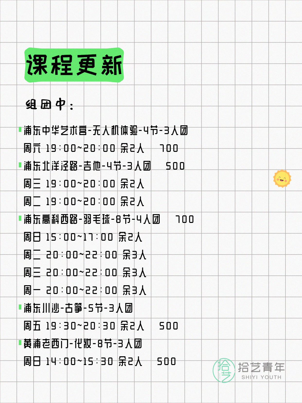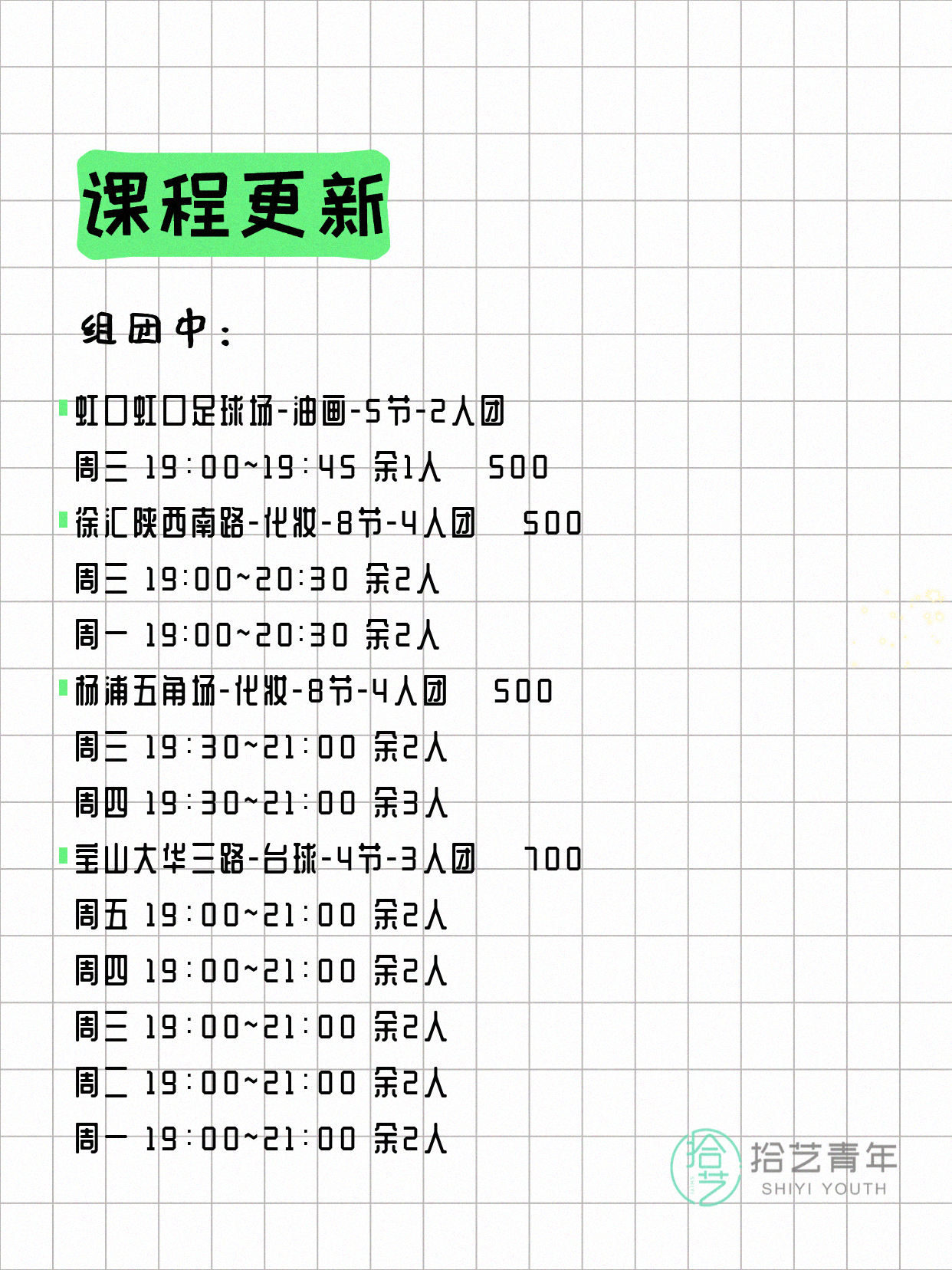资讯>综合>正文4月29日上海夜校课程合集拾艺青年2026-04-291 / 17📊 本期课程概况• 总课程数:653门• 组团中课程:71门• 覆盖区域:15个区详见图片,欢迎报名咨询。💡 提示:以上课程信息来自拾艺青年小程序,课程可能随报名动态变化,具体以小程序实时信息为准。👉 微信小程序链接:#小程序://拾艺青年/WmfwH22mnQUxZwb
