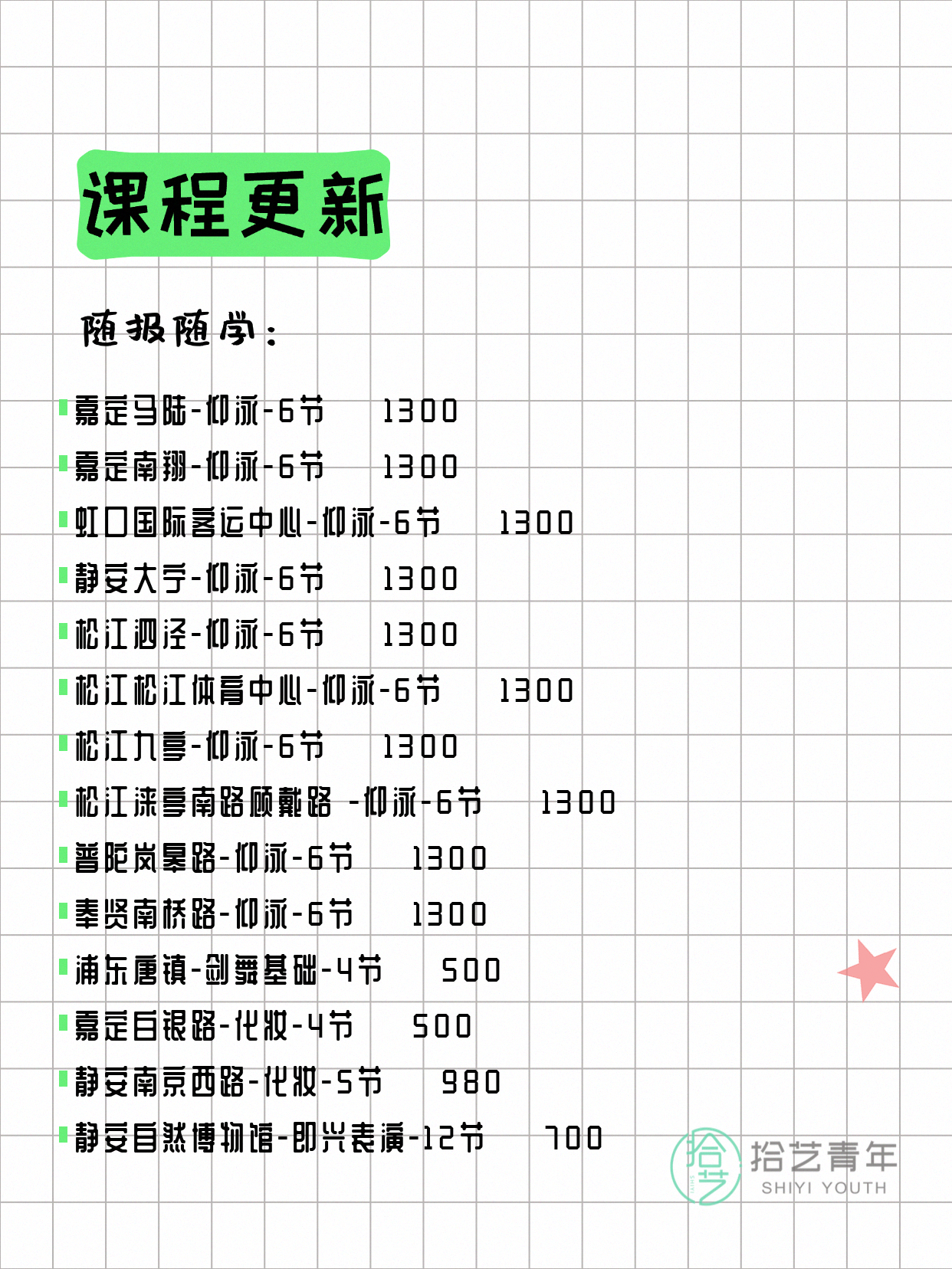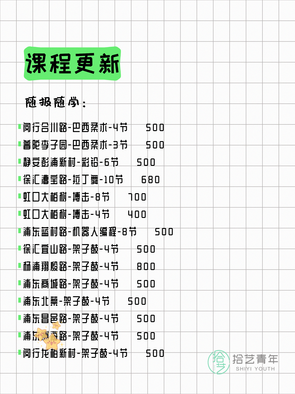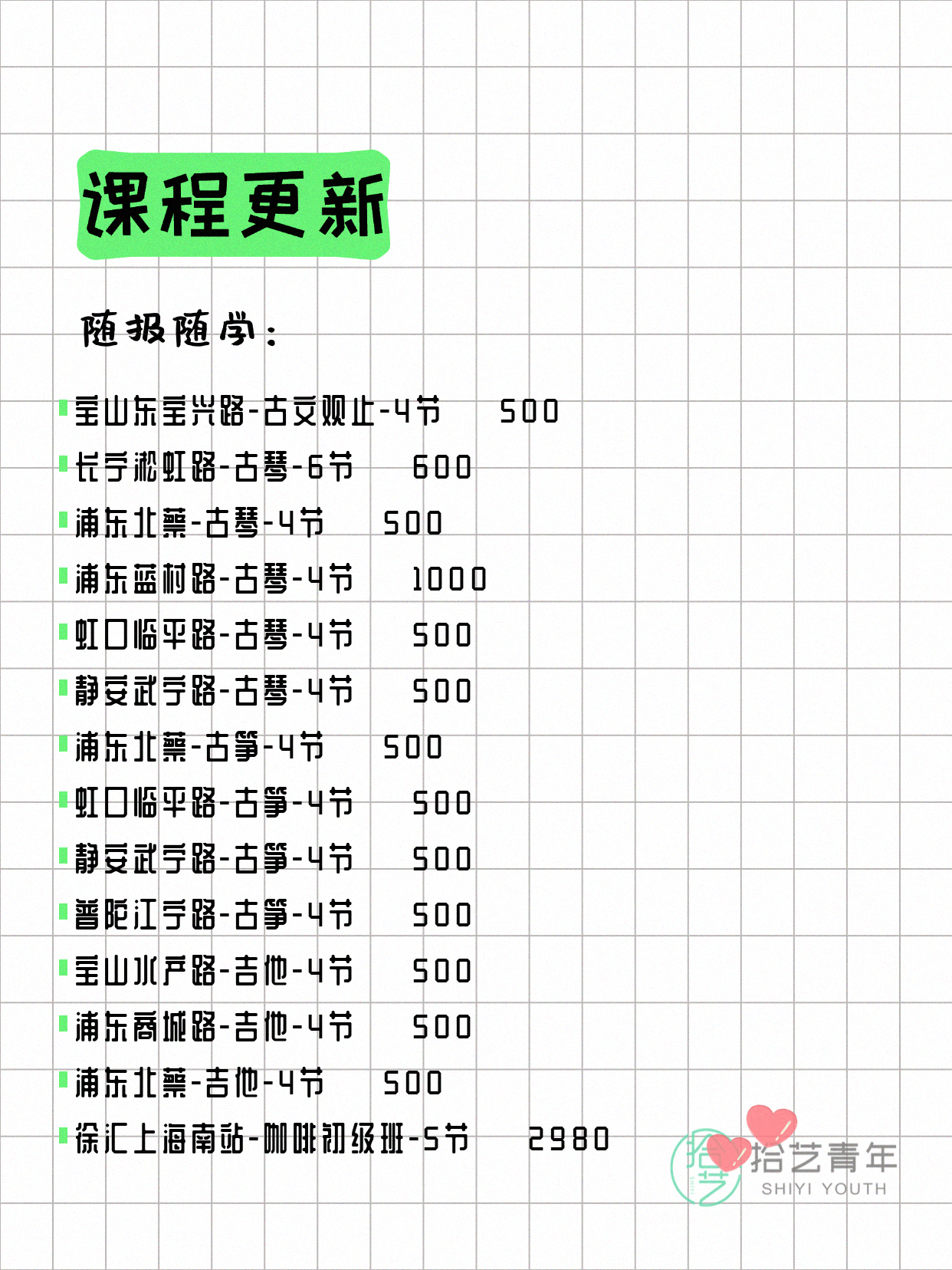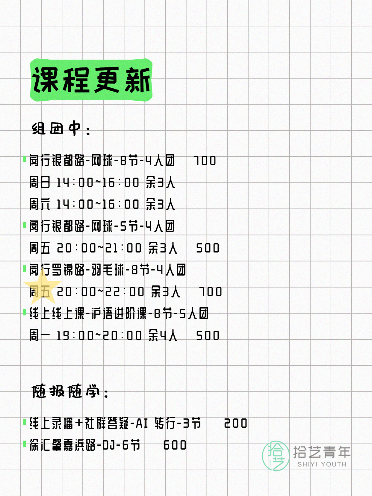 资讯>综合>正文4月29日上海夜校课程合集拾艺青年2026-04-291 / 17📊 本期课程概况• 总课程数:653门• 组团中课程:71门• 覆盖区域:15个区详见图片,欢迎报名咨询。💡 提示:以上课程信息来自拾艺青年小程序,课程可能随报名动态变化,具体以小程序实时信息为准。👉 微信小程序链接:#小程序://拾艺青年/WmfwH22mnQUxZwb