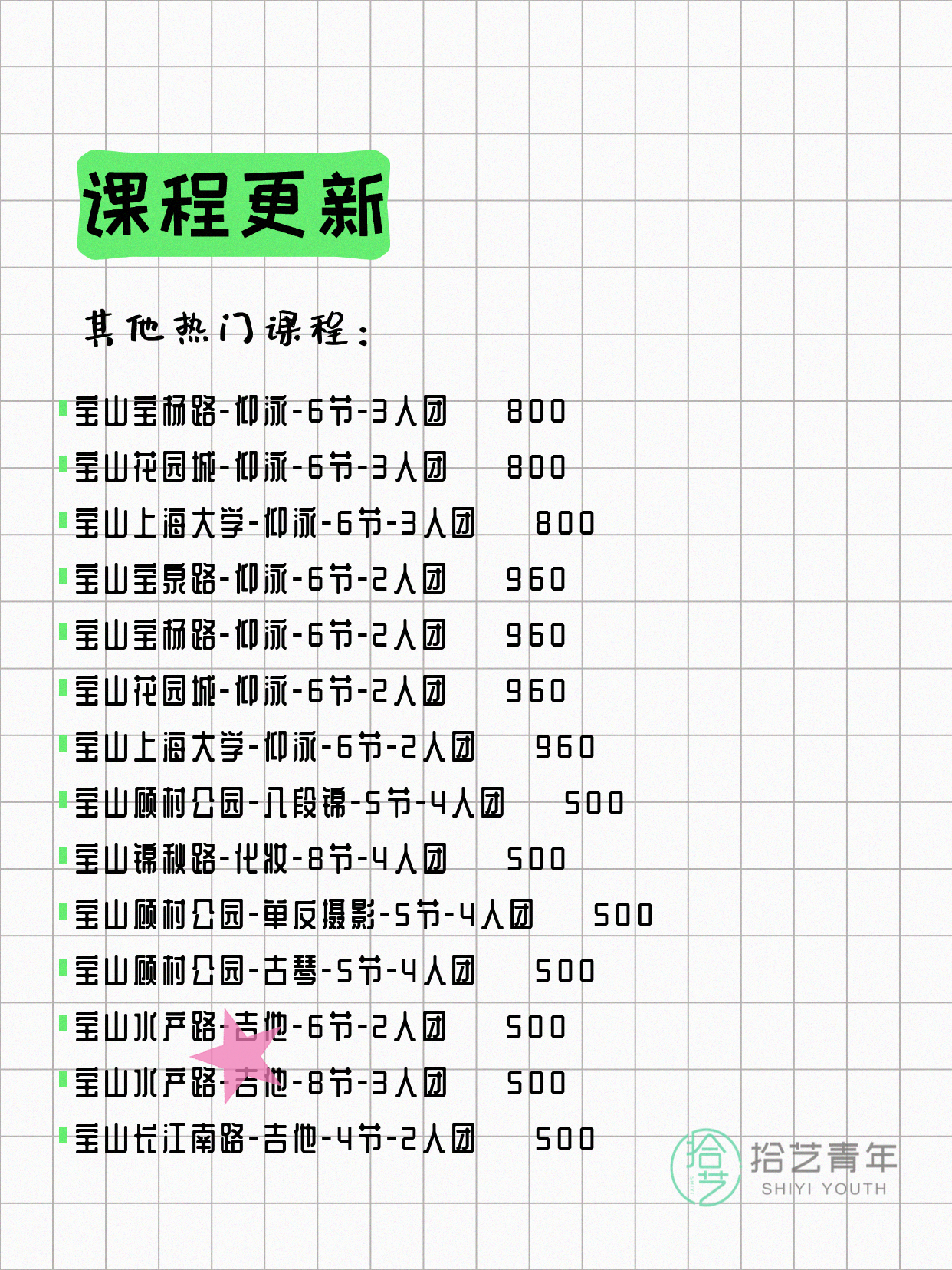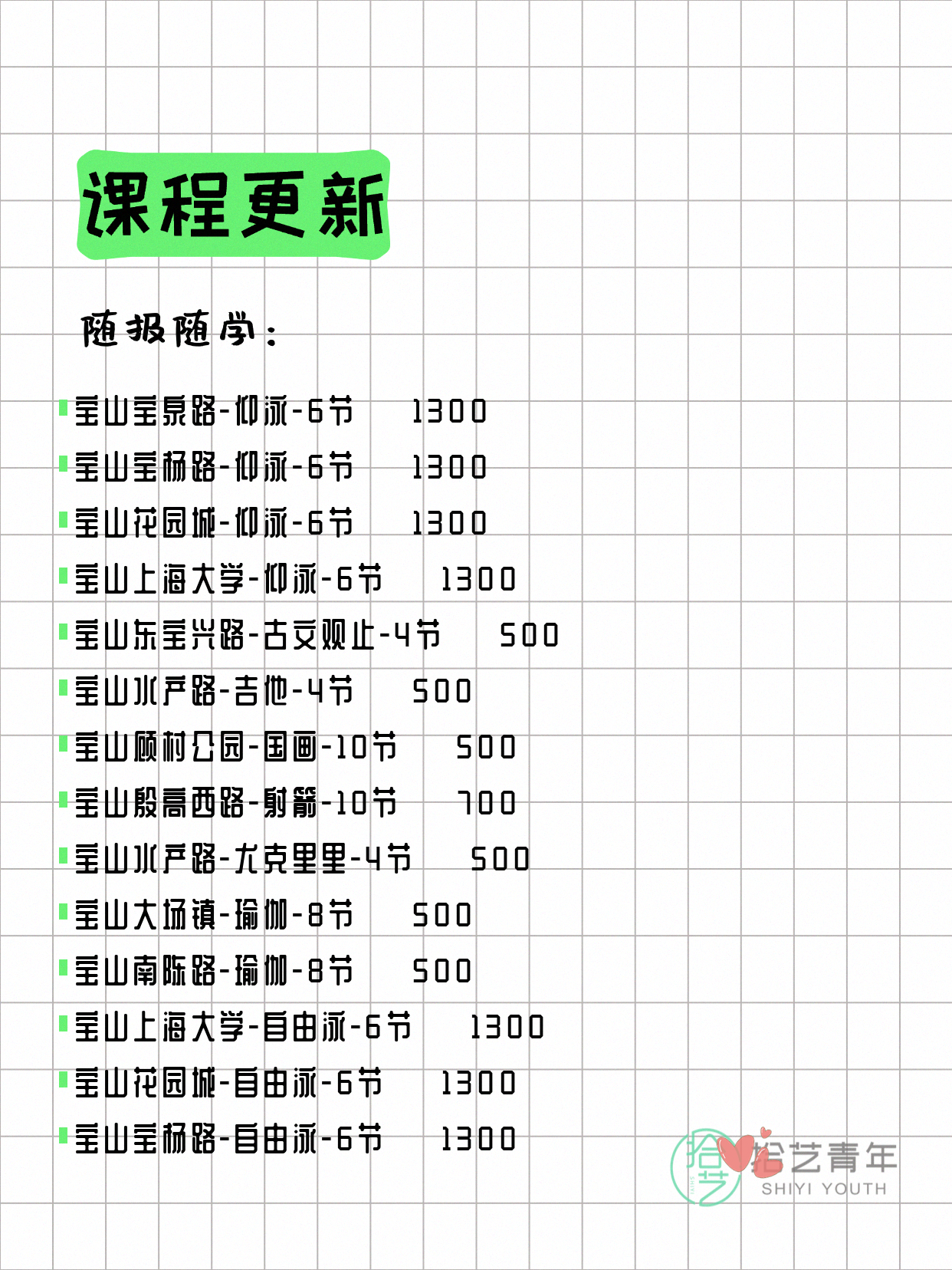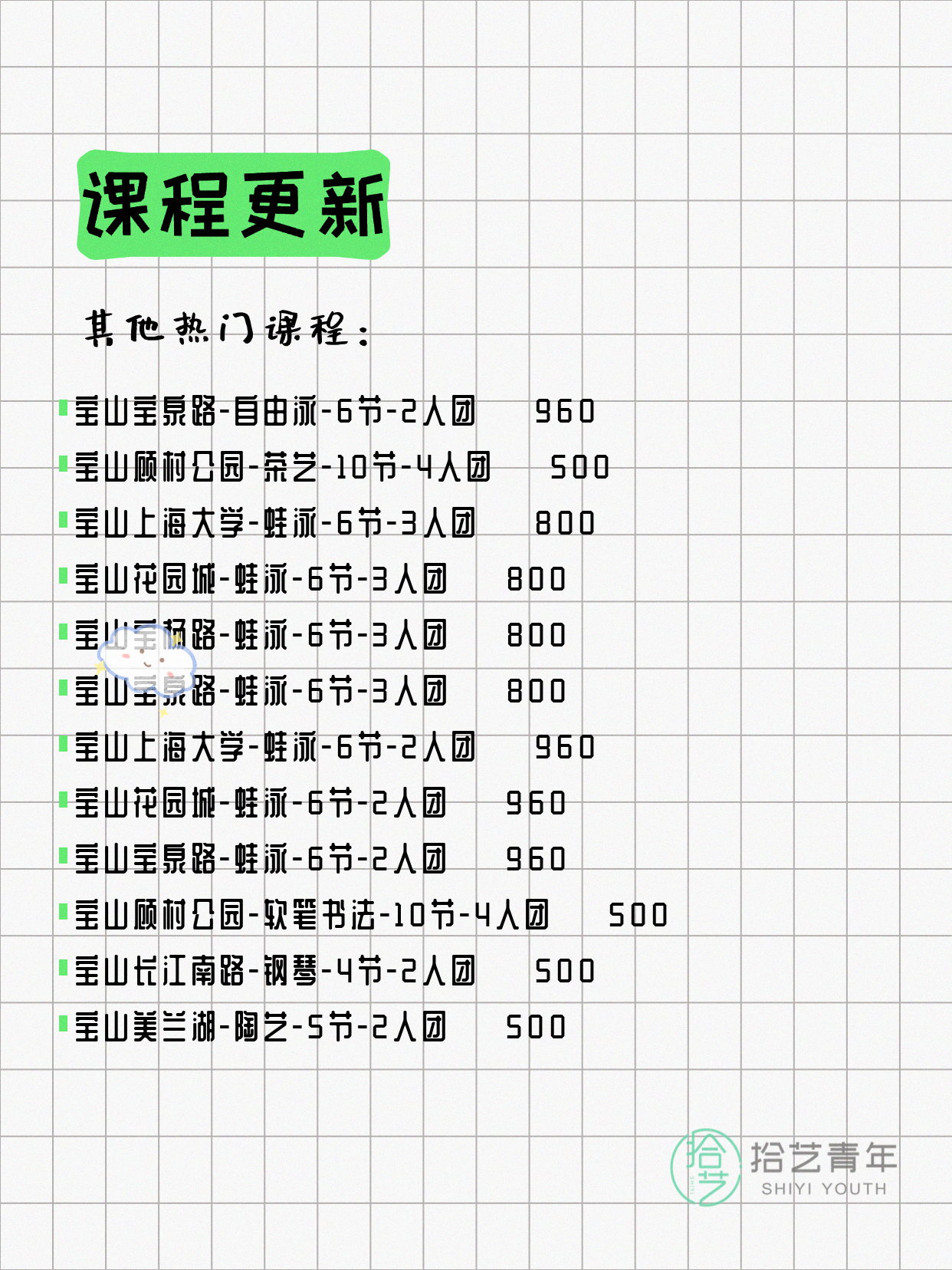 💡 提示:以上课程信息来自拾艺青年小程序,课程可能随报名动态变化,具体以小程序实时信息为准。