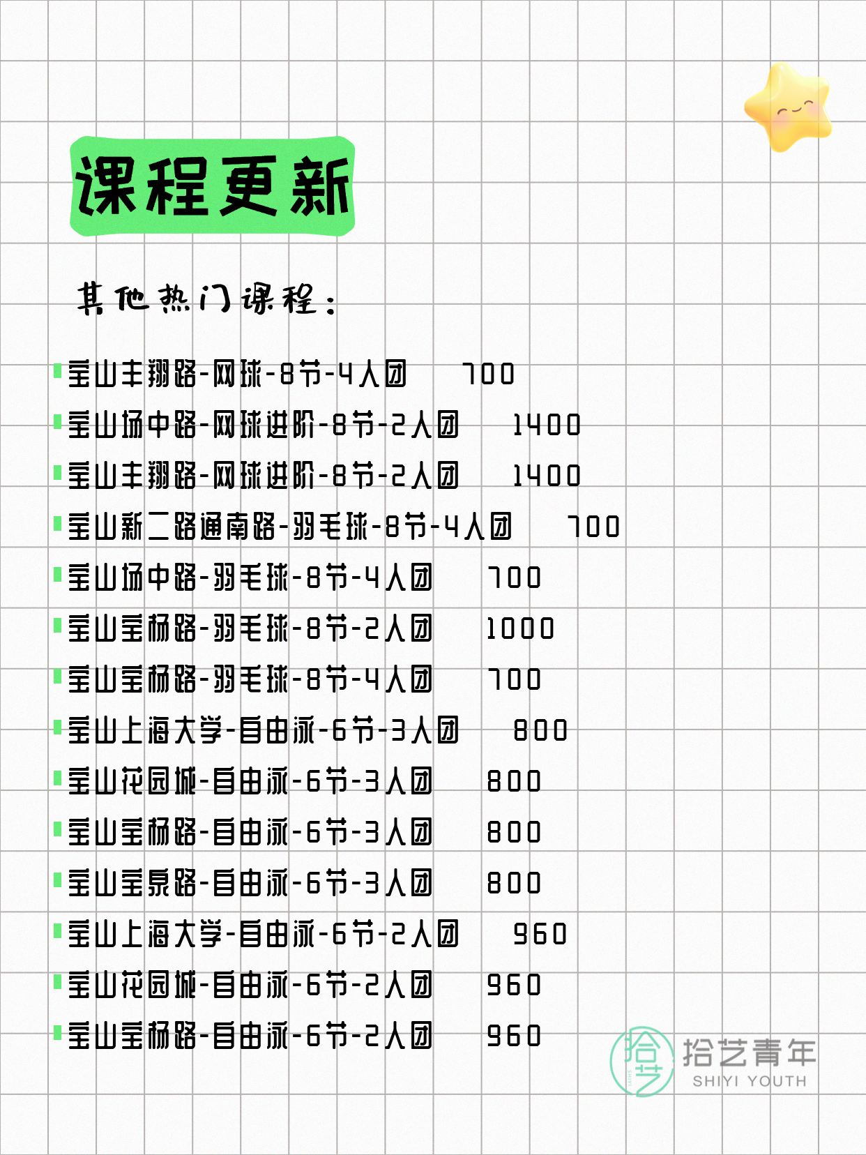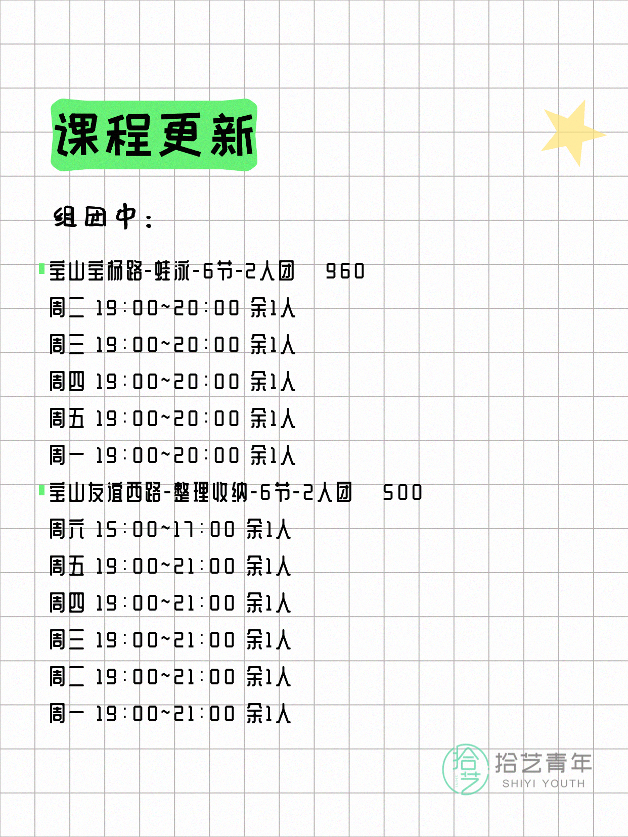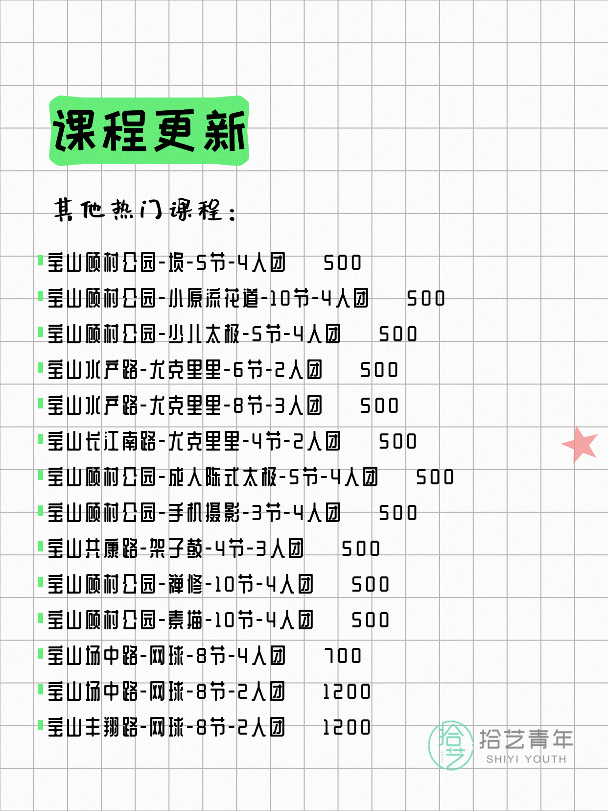 💡 提示:以上课程信息来自拾艺青年小程序,课程可能随报名动态变化,具体以小程序实时信息为准。