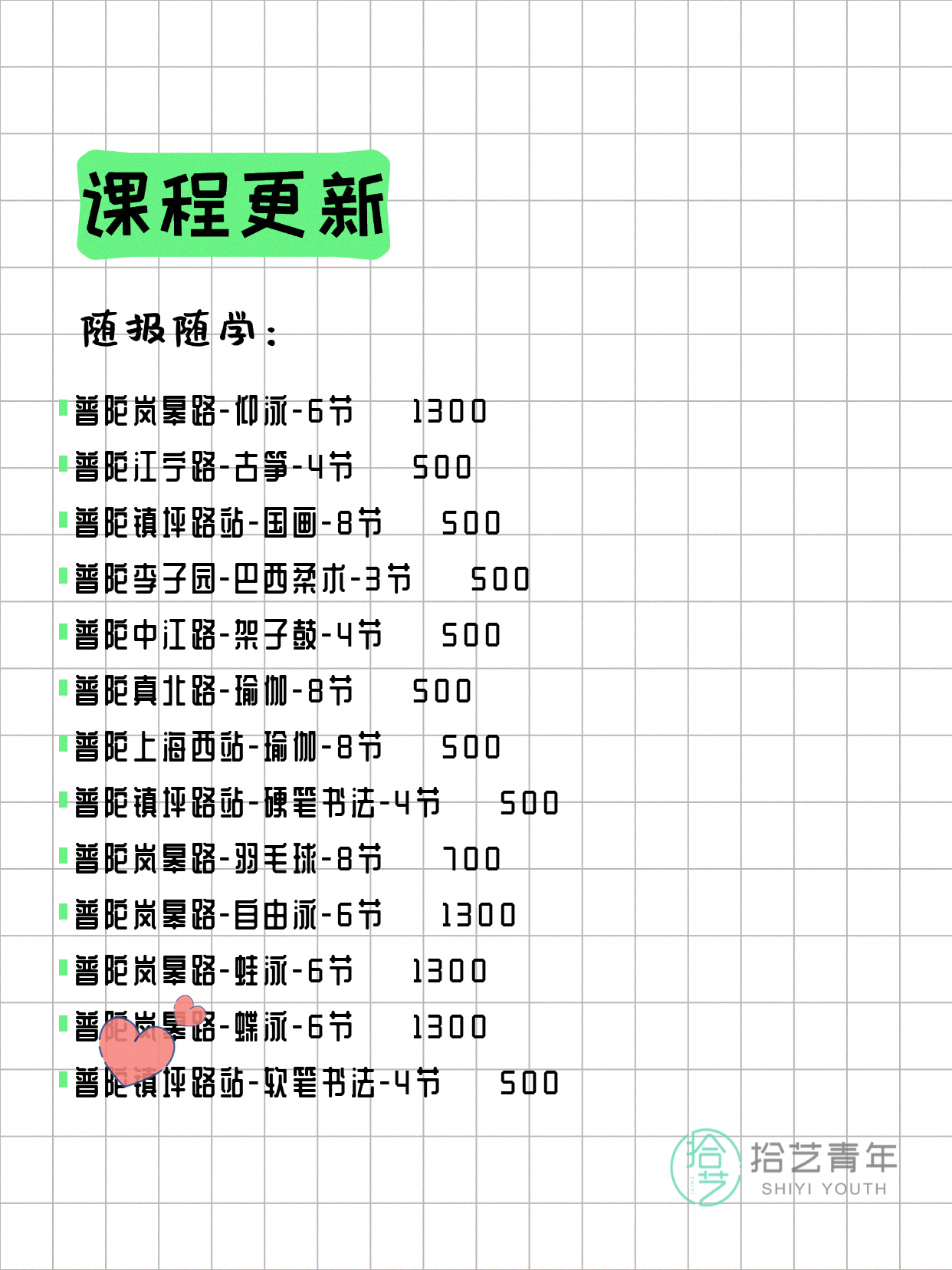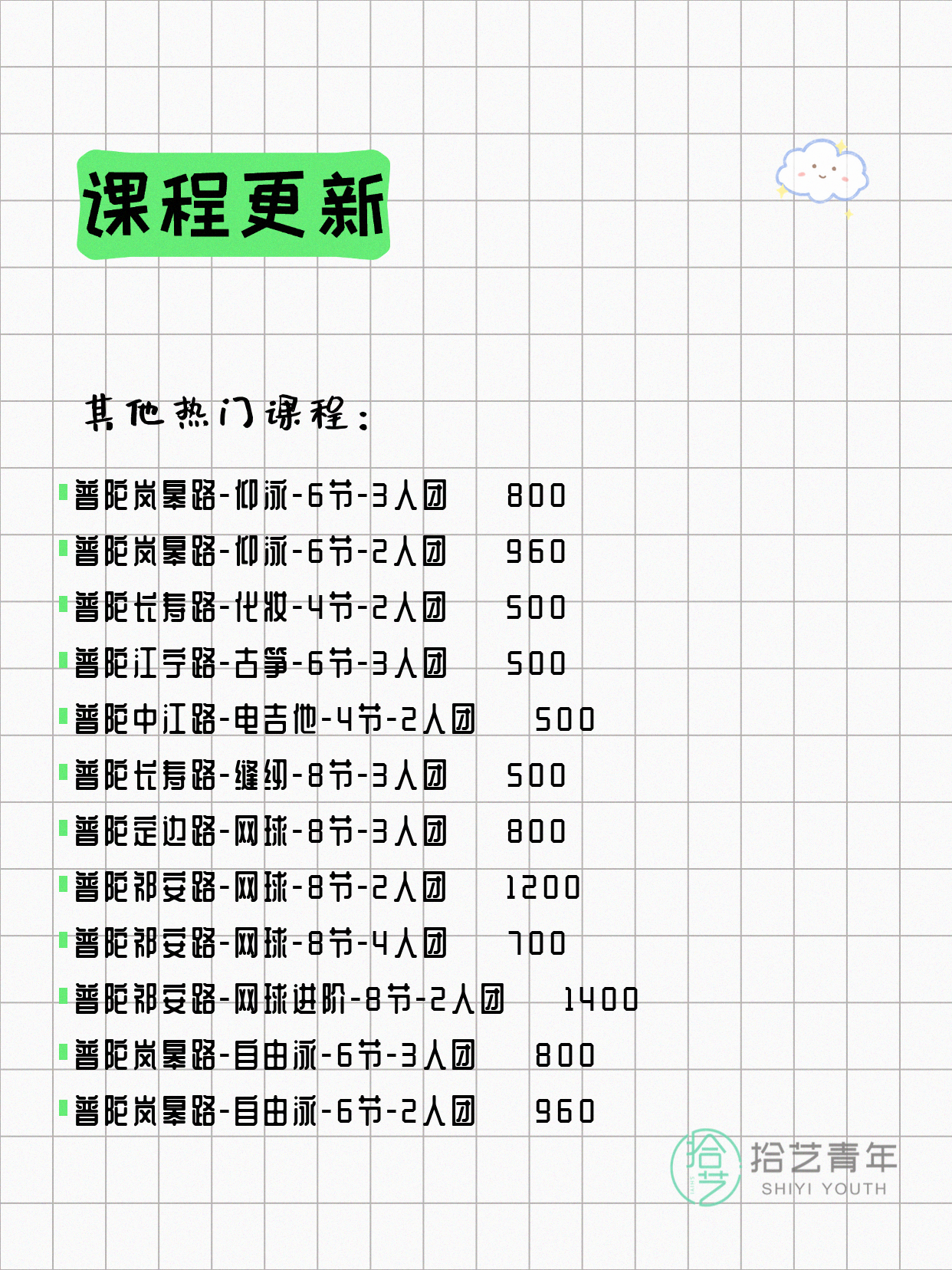 💡 提示:以上课程信息来自拾艺青年小程序,课程可能随报名动态变化,具体以小程序实时信息为准。