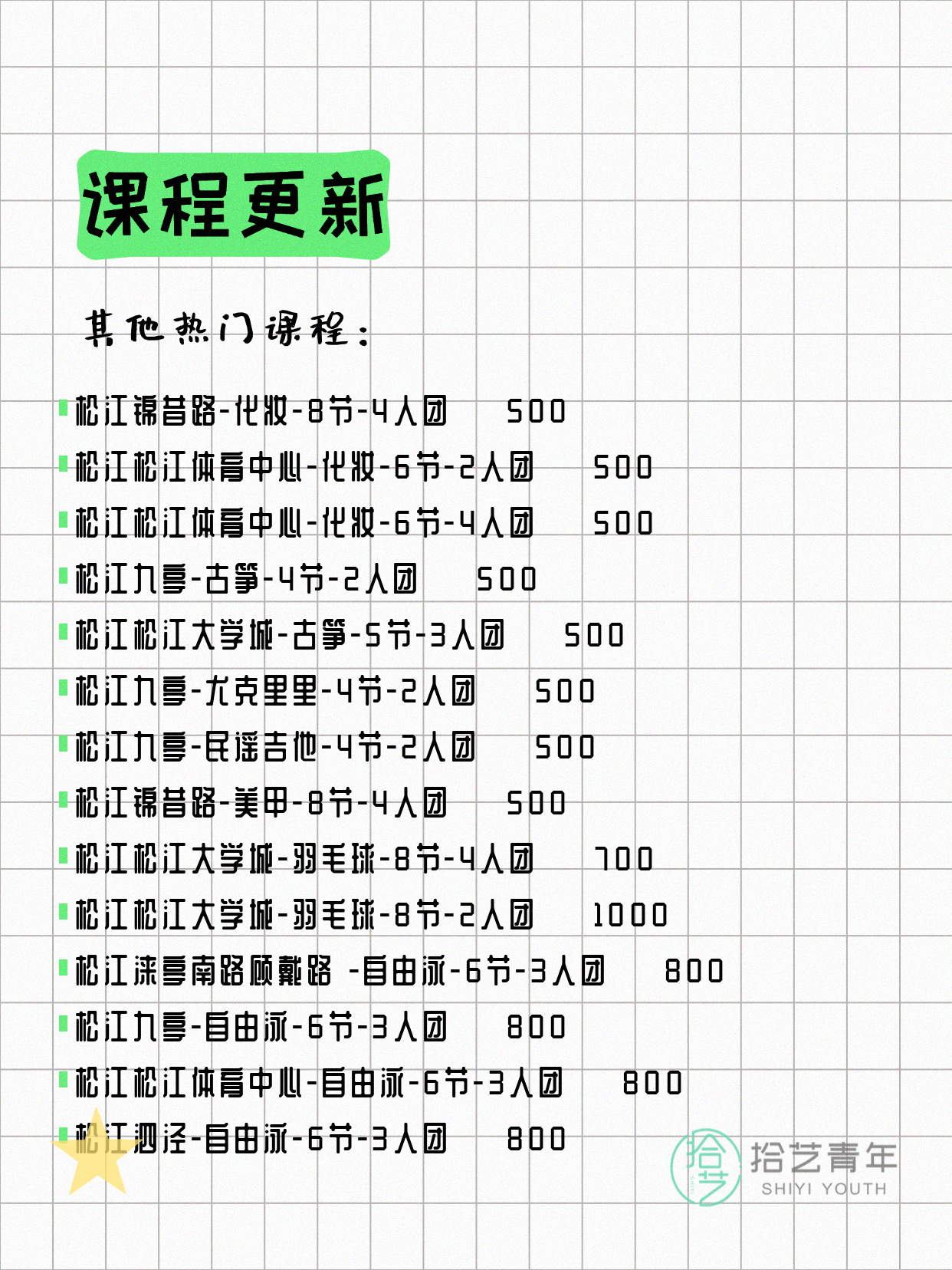 💡 提示:以上课程信息来自拾艺青年小程序,课程可能随报名动态变化,具体以小程序实时信息为准。