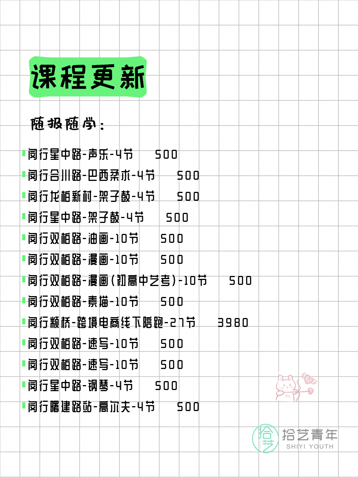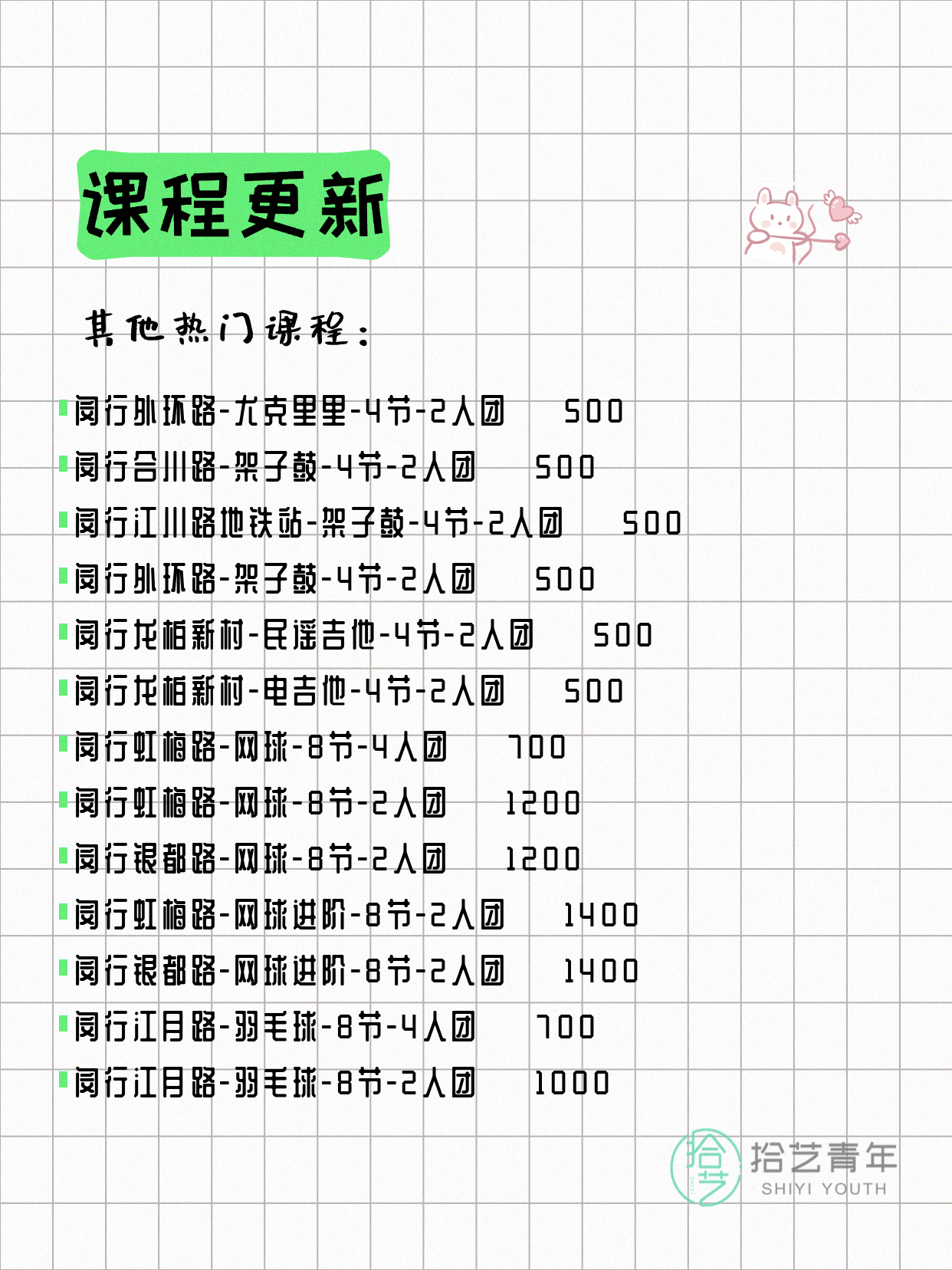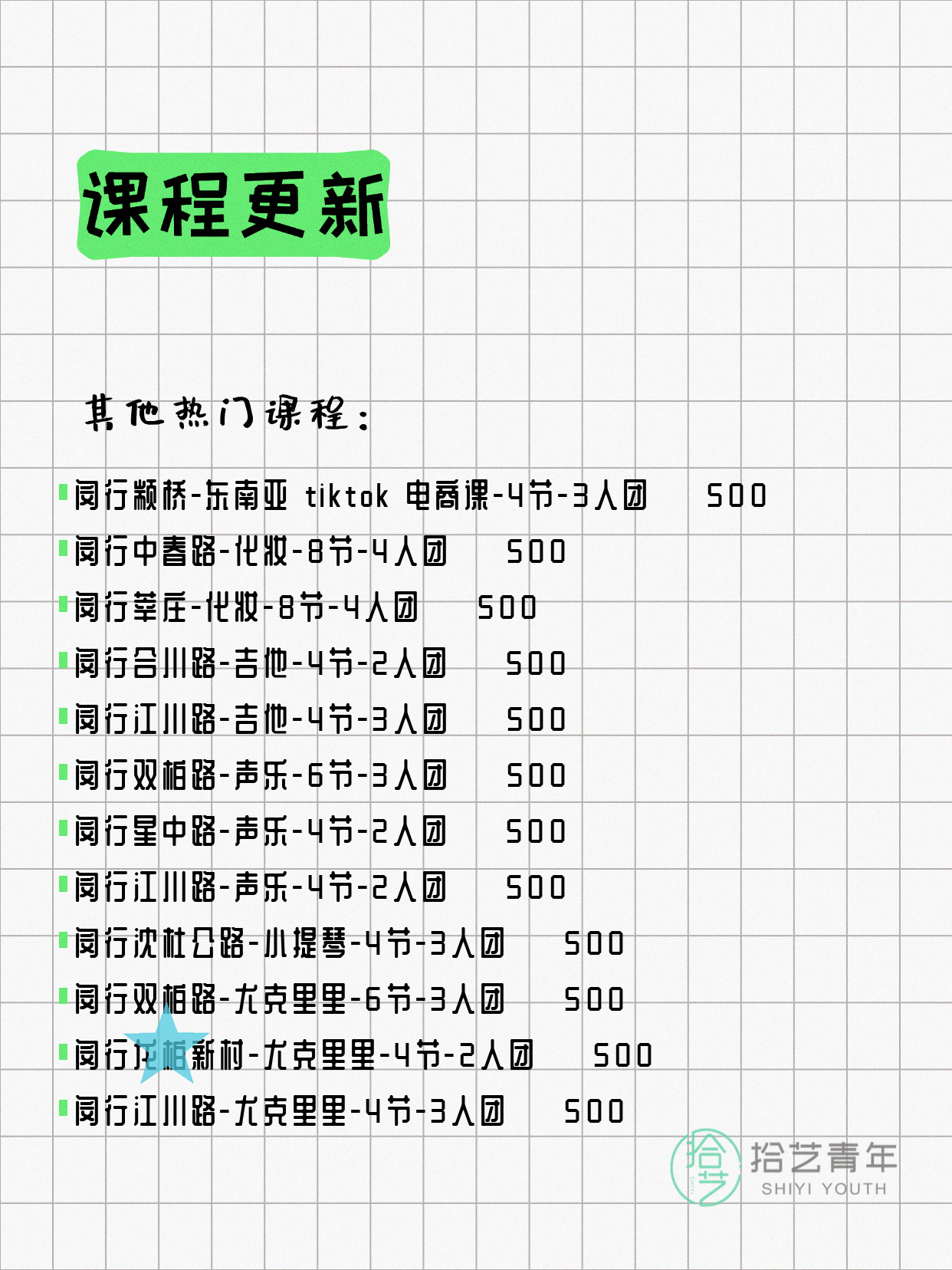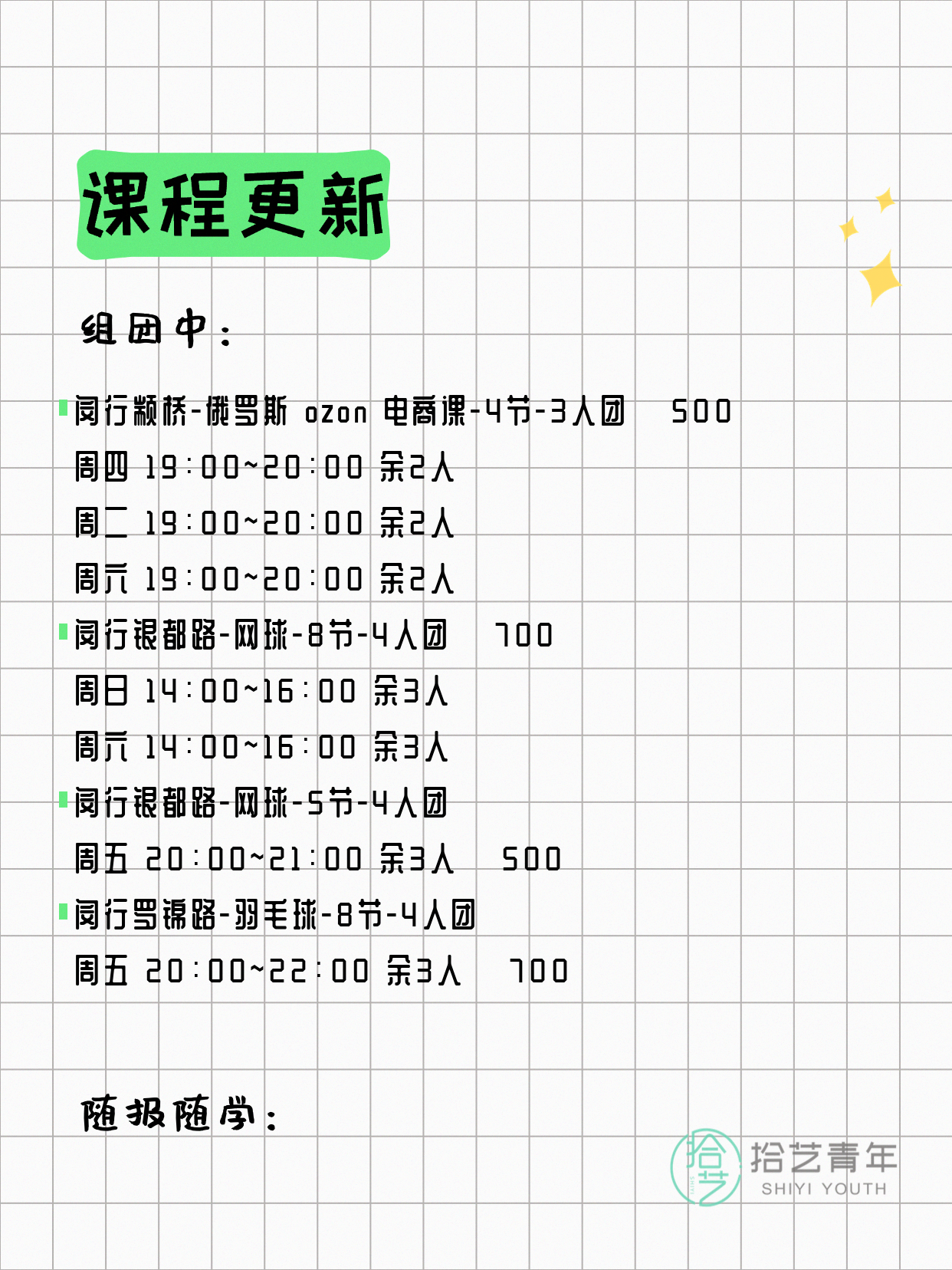 💡 提示:以上课程信息来自拾艺青年小程序,课程可能随报名动态变化,具体以小程序实时信息为准。