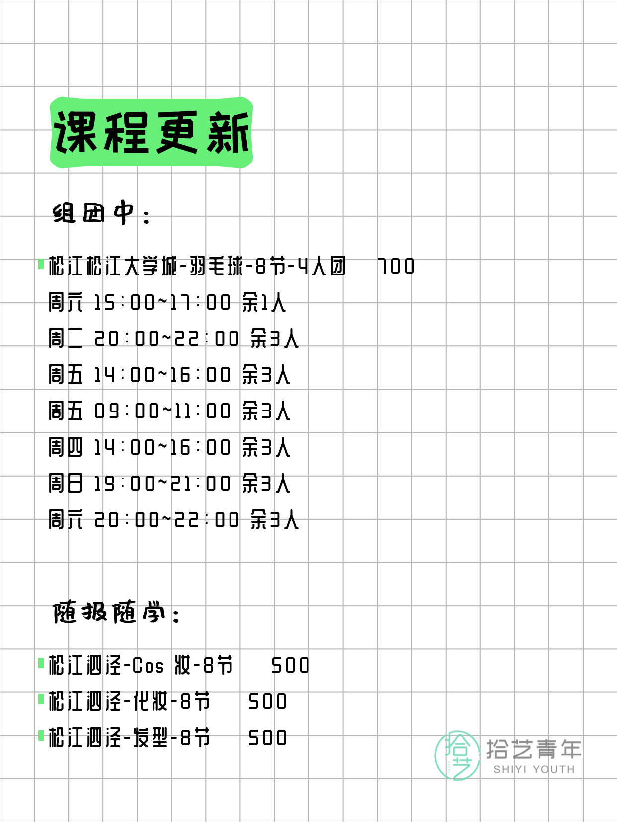💡 提示:以上课程信息来自拾艺青年小程序,课程可能随报名动态变化,具体以小程序实时信息为准。