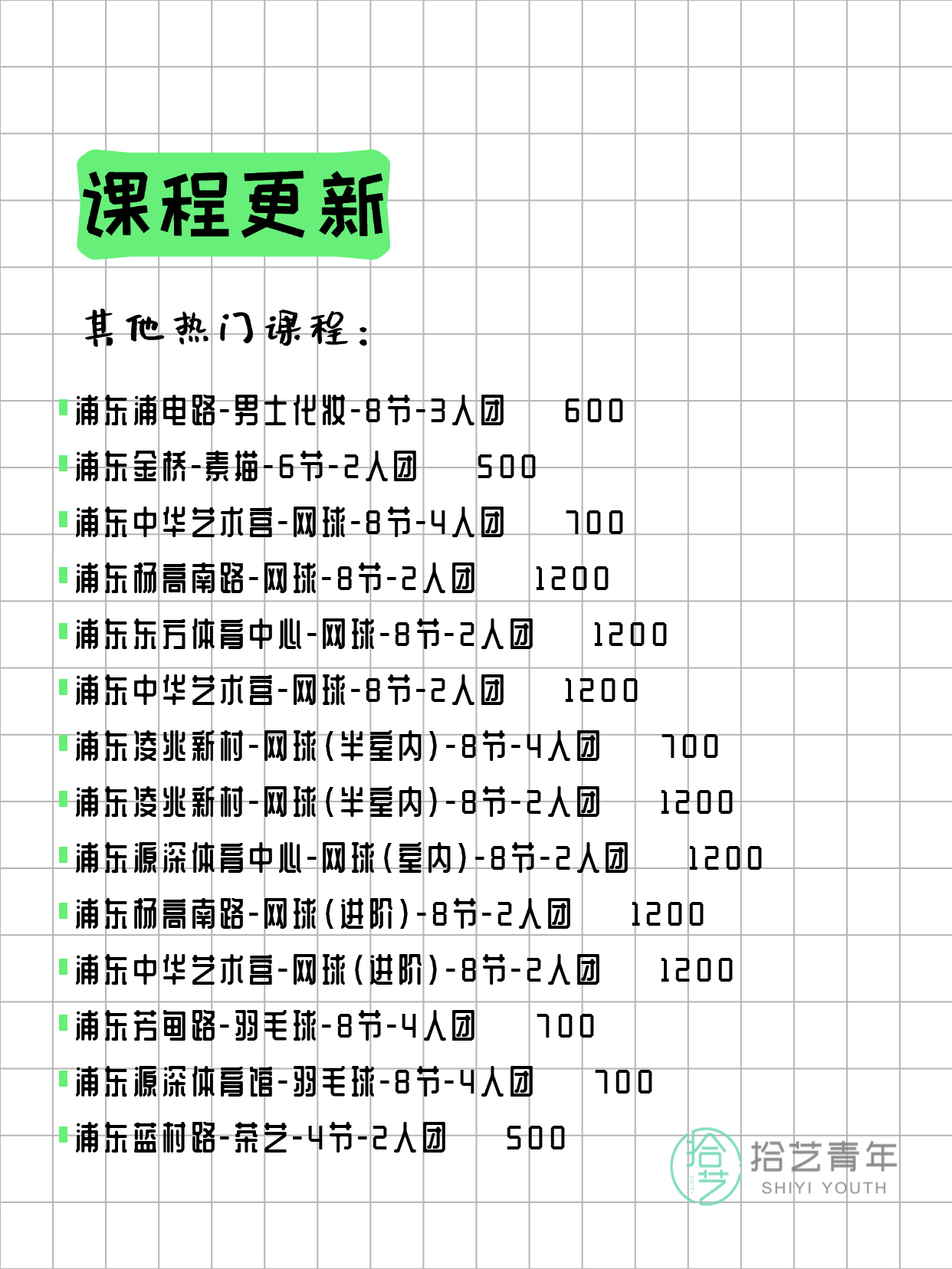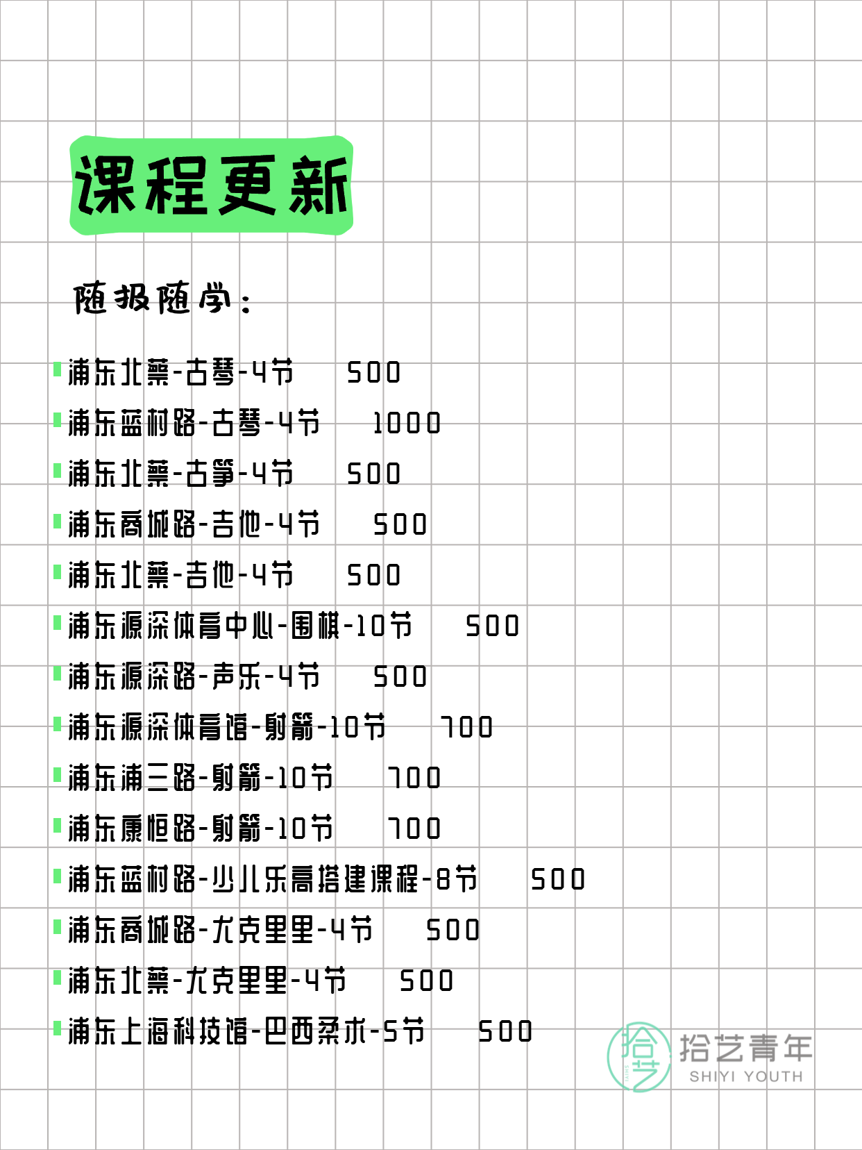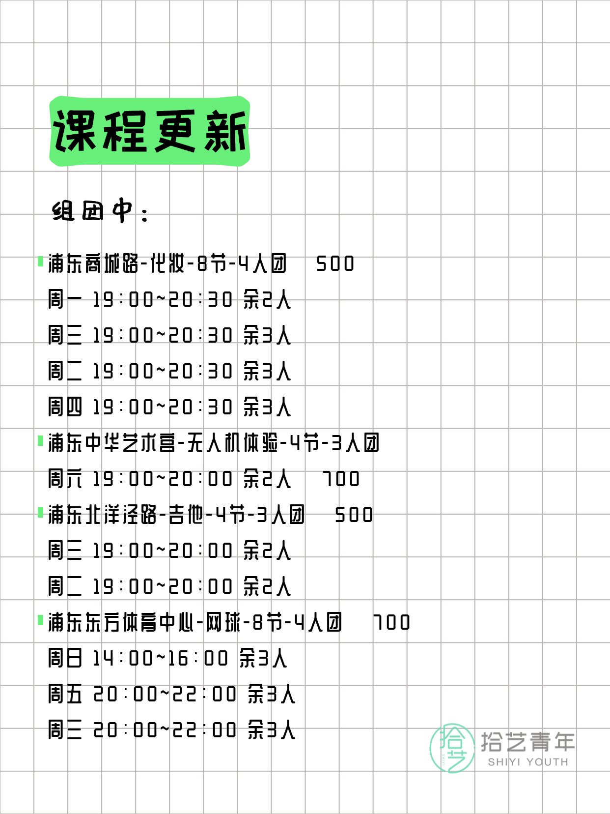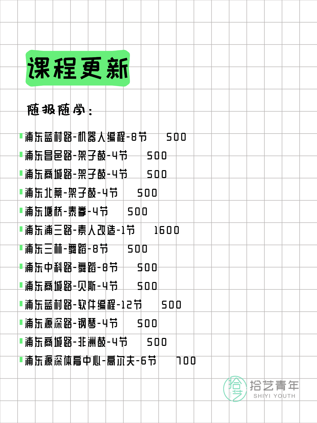 💡 提示:以上课程信息来自拾艺青年小程序,课程可能随报名动态变化,具体以小程序实时信息为准。