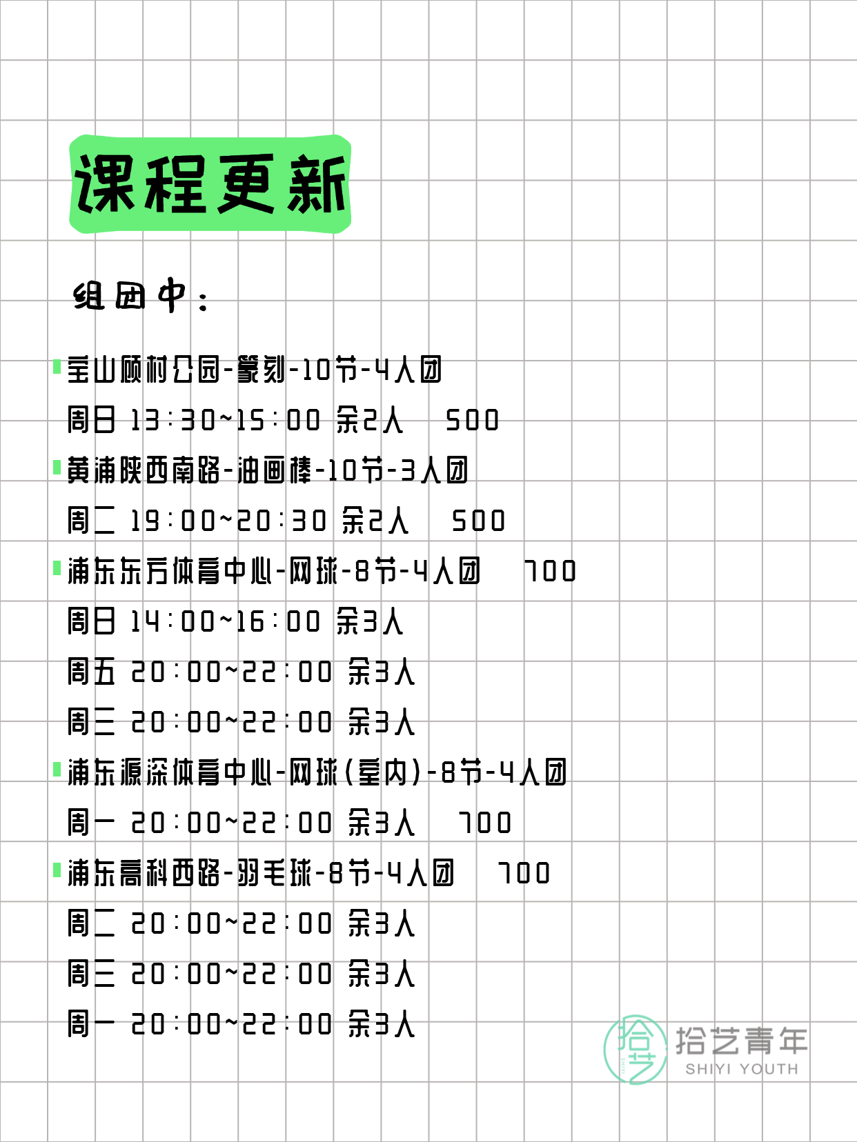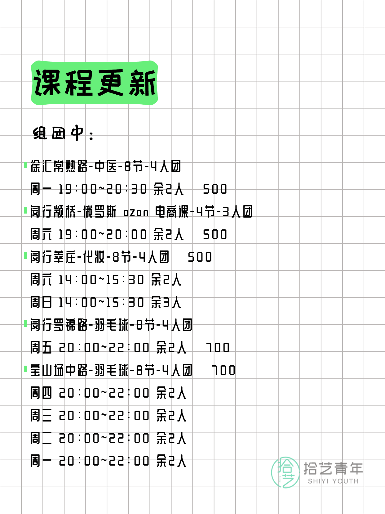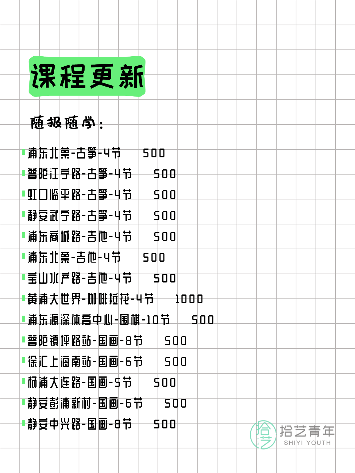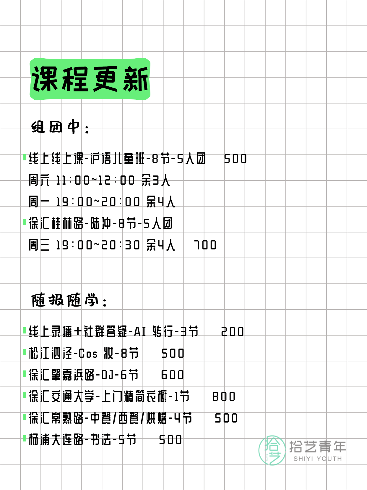 资讯>综合>正文3月17日上海夜校课程合集拾艺青年2026-03-171 / 17📊 本期课程概况• 总课程数:367门• 组团中课程:77门• 覆盖区域:15个区详见图片,欢迎报名咨询。💡 提示:以上课程信息来自拾艺青年小程序,课程可能随报名动态变化,具体以小程序实时信息为准。👉 微信小程序链接:#小程序://拾艺青年/WmfwH22mnQUxZwb