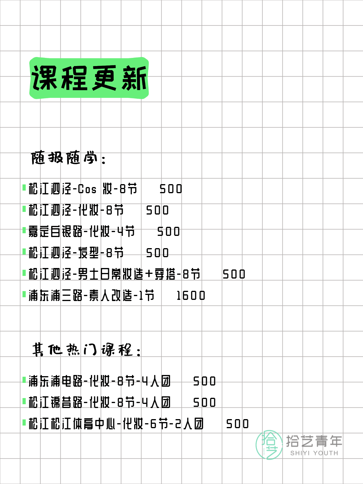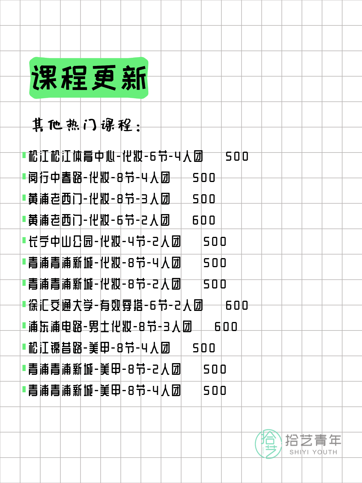 💡 提示:以上课程信息来自拾艺青年小程序,课程可能随报名动态变化,具体以小程序实时信息为准。