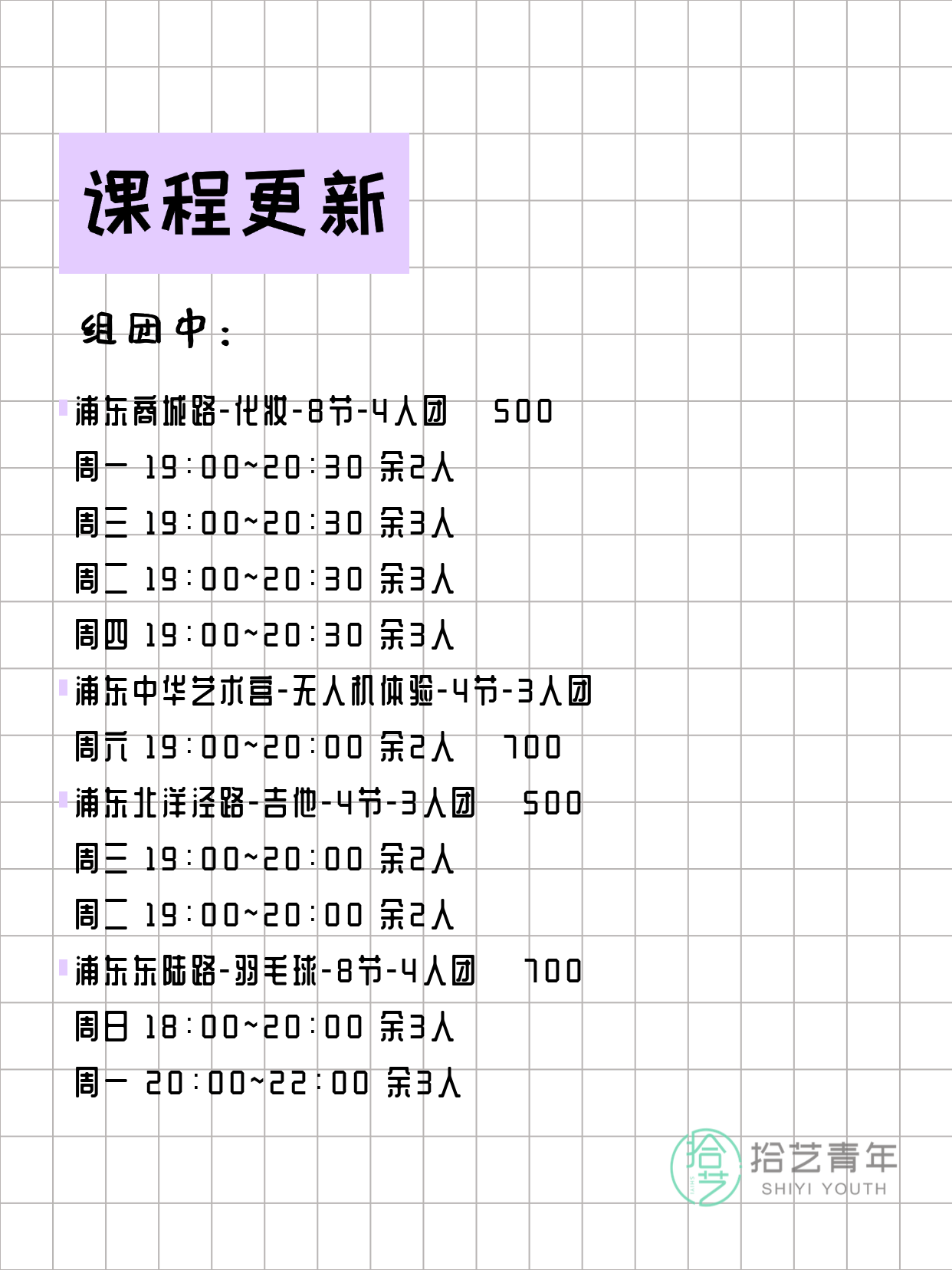 浦东夜校课表更新咯 化妆、无人机体验、吉他还差2人就凑满 快冲