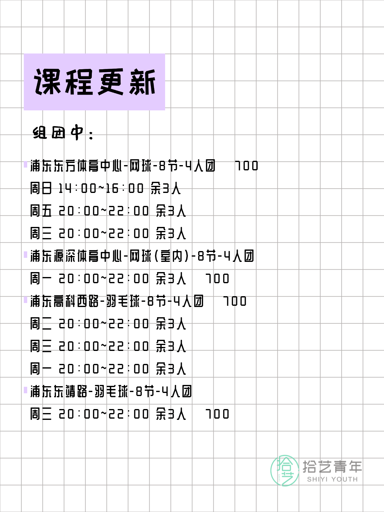 - 浦东东陆路-羽毛球-8节-4人团 周日 18:00-20:00 余3人 💰 700