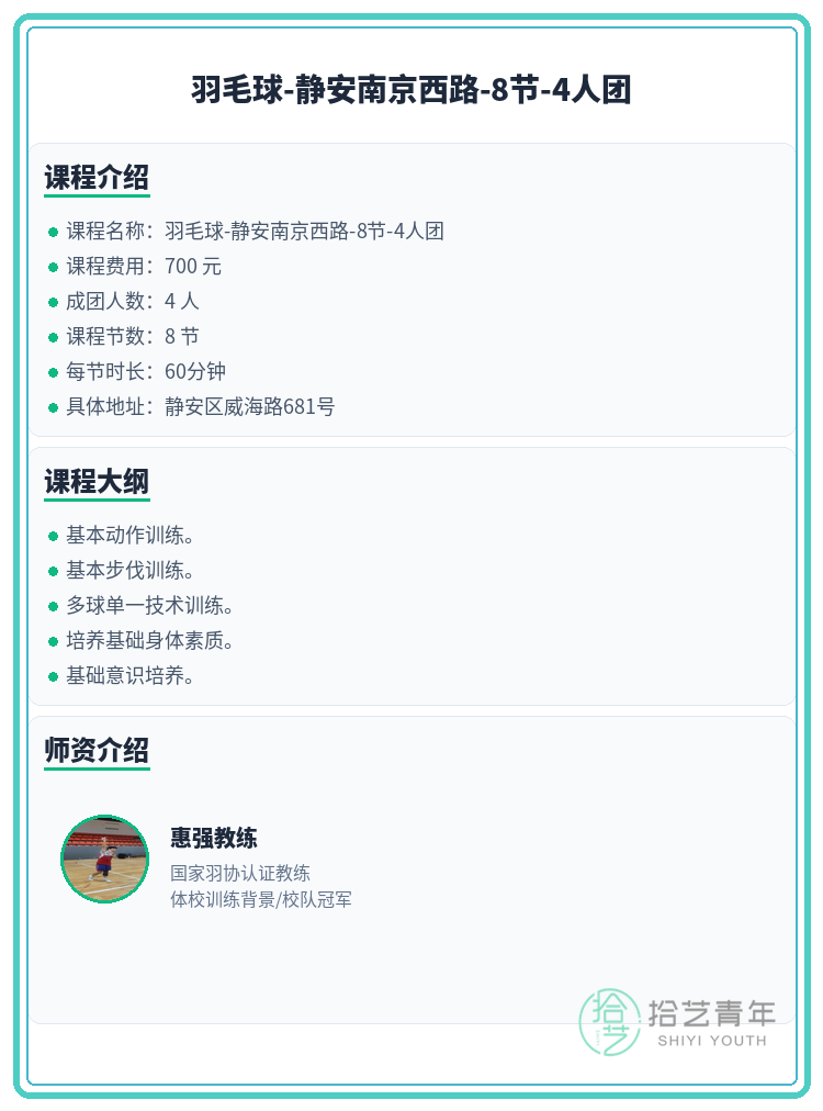 资讯>综合>正文静安羽毛球差1人就开课!拾艺青年2026-03-171 / 2南京西路羽毛球课差最后1位,快上车凑局🏸🏫 上课地点:静安区威海路681号📅 课程安排:共8节 | 周日 10:00-12:00📖 课程大纲:基本动作训练。基本步伐训练。多球单一技术训练。培养基础身体素质。基础意识培养。👥 4人团 | 已报3人 | 还差1人开课#上海夜校 #静安夜校 #羽毛球课程 #夜校拼团 #上海线下课相关标签#上海夜校#静安夜校#羽毛球课程#夜校拼团#上海线下课