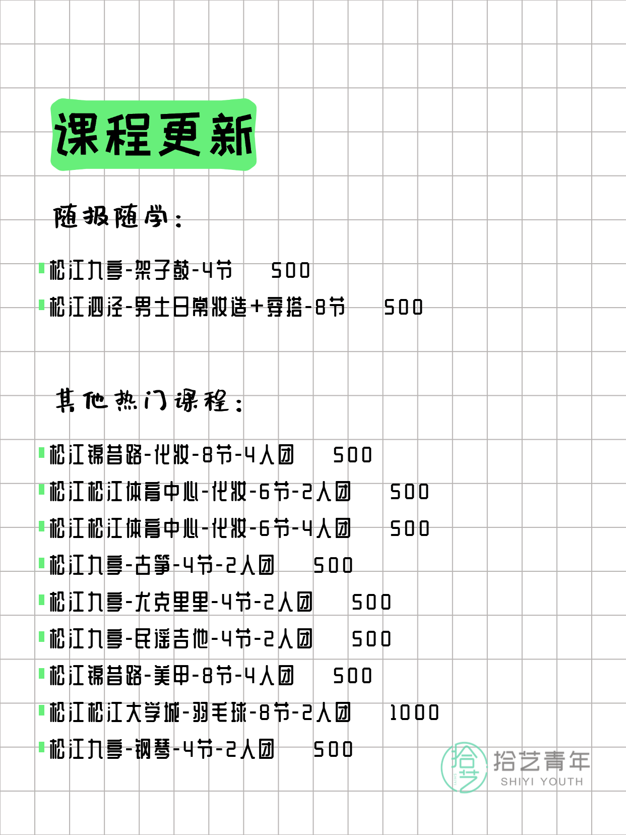 💡 提示:以上课程信息来自拾艺青年小程序,课程可能随报名动态变化,具体以小程序实时信息为准。