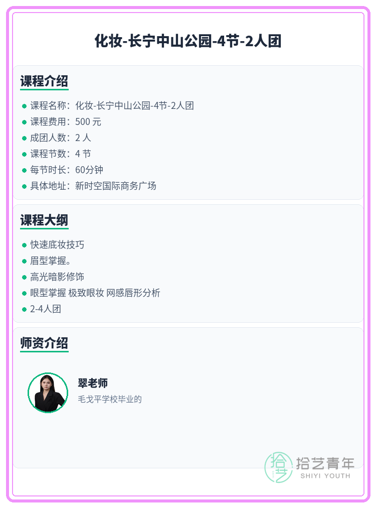 资讯>综合>正文中山公园化妆课差1人就开课拾艺青年2026-03-191 / 2长宁中山公园化妆课就差你啦!快搭上末班车💄🏫 上课地点:新时空国际商务广场📅 课程安排:共4节 | 周四 19:30-20:30📖 课程大纲:快速底妆技巧眉型掌握。高光暗影修饰眼型掌握 极致眼妆 网感唇形分析2-4人团👥 2人团 | 已报1人 | 还差1人开课#上海夜校 #长宁夜校 #化妆课程 #夜校拼团 #上海线下课相关标签#上海夜校#长宁夜校#化妆课程#夜校拼团#上海线下课