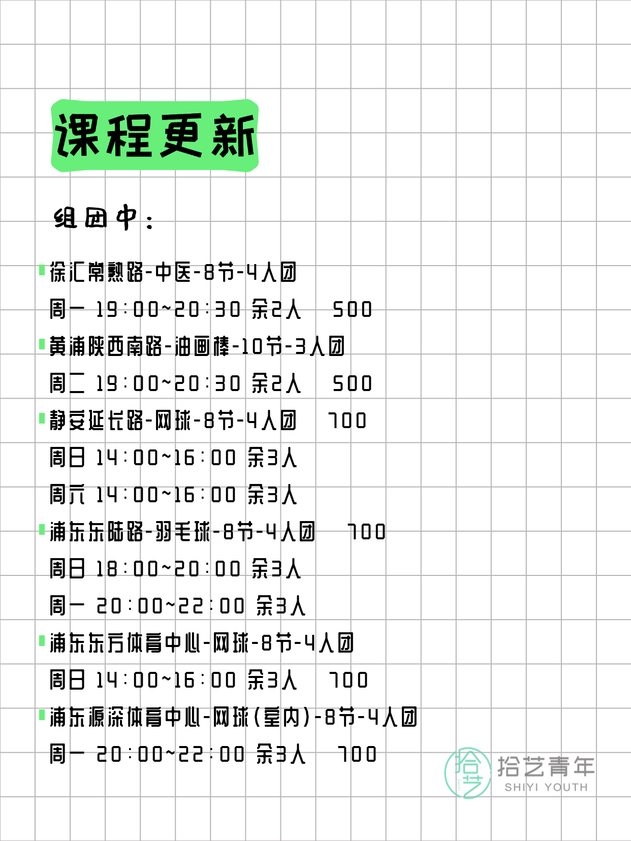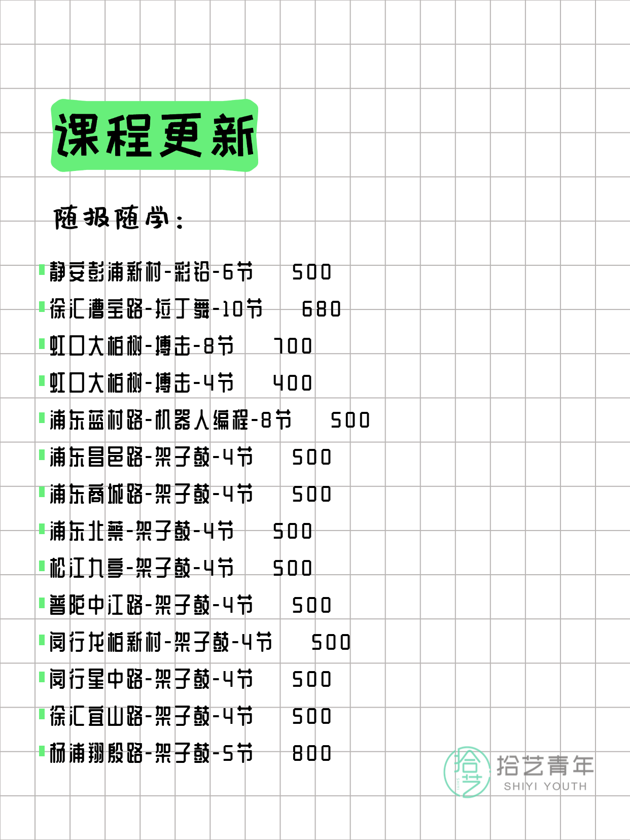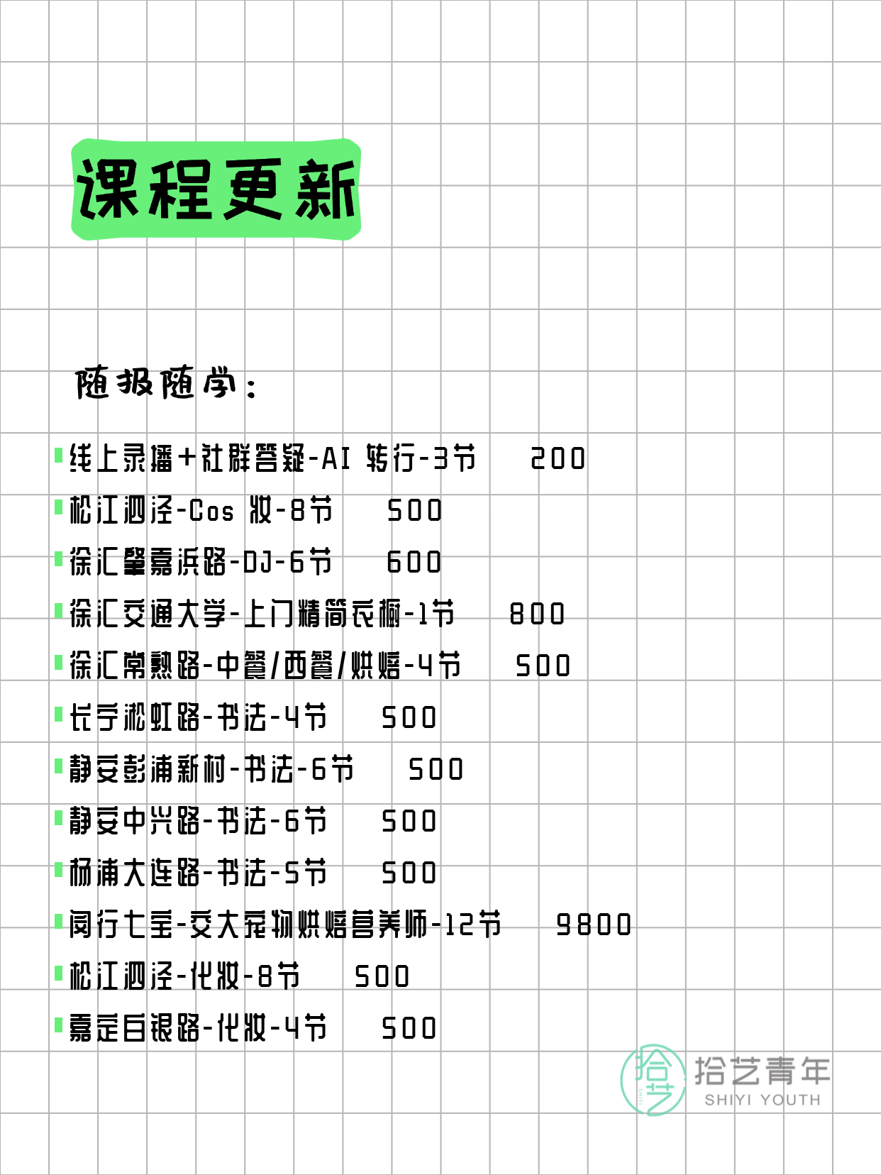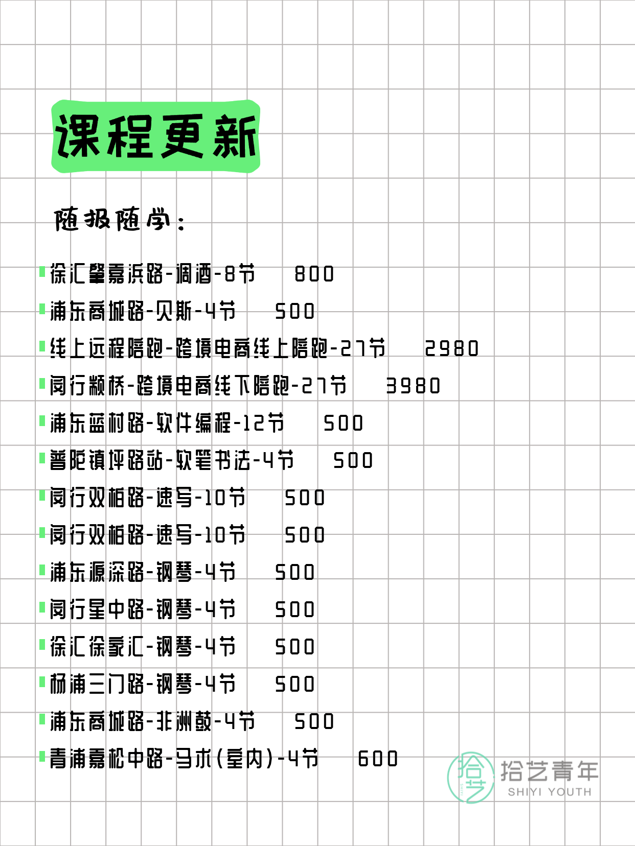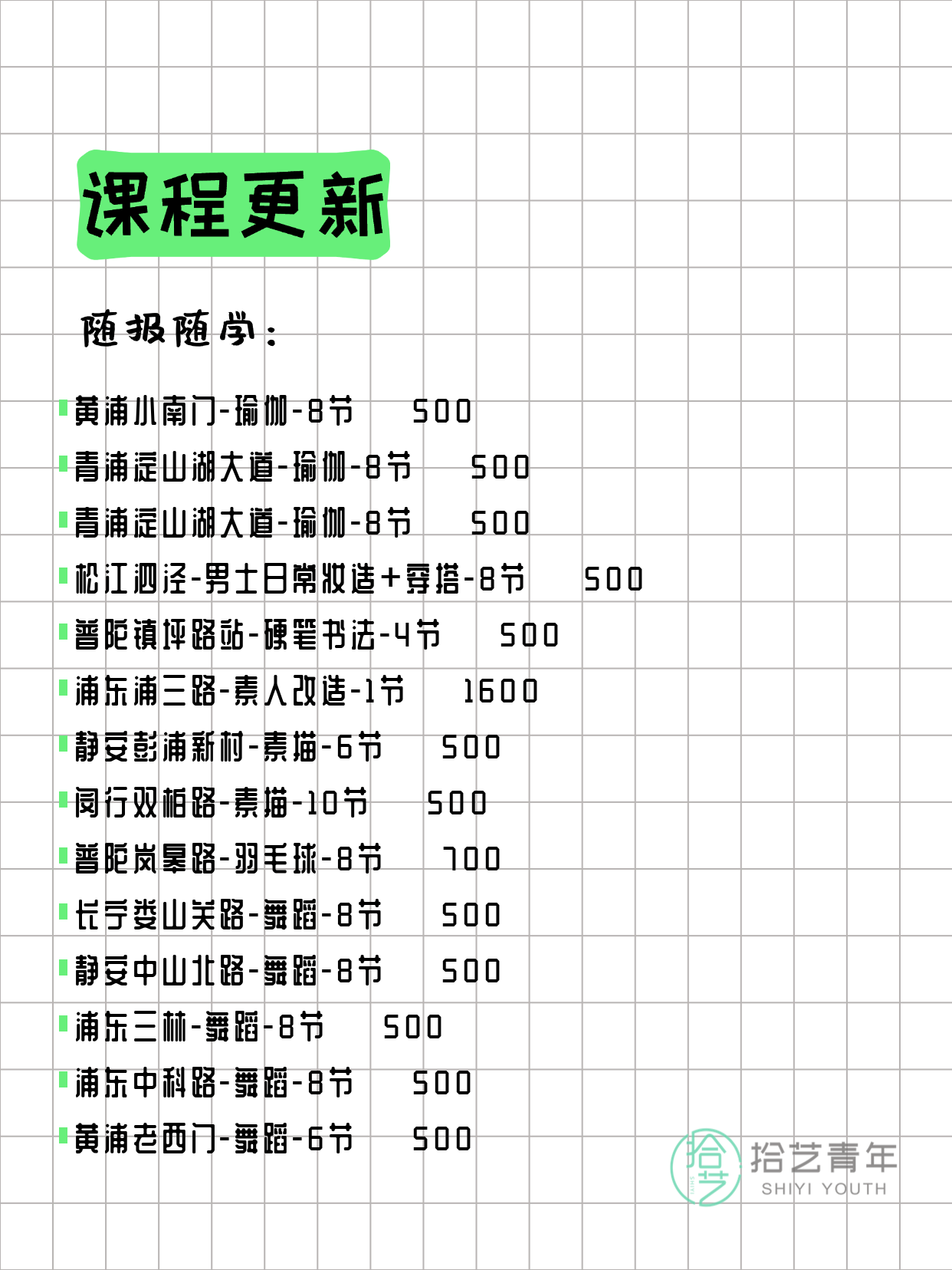 资讯>综合>正文3月20日上海夜校课程合集拾艺青年2026-03-201 / 17📊 本期课程概况• 总课程数:357门• 组团中课程:68门• 覆盖区域:15个区详见图片,欢迎报名咨询。💡 提示:以上课程信息来自拾艺青年小程序,课程可能随报名动态变化,具体以小程序实时信息为准。👉 微信小程序链接:#小程序://拾艺青年/WmfwH22mnQUxZwb
