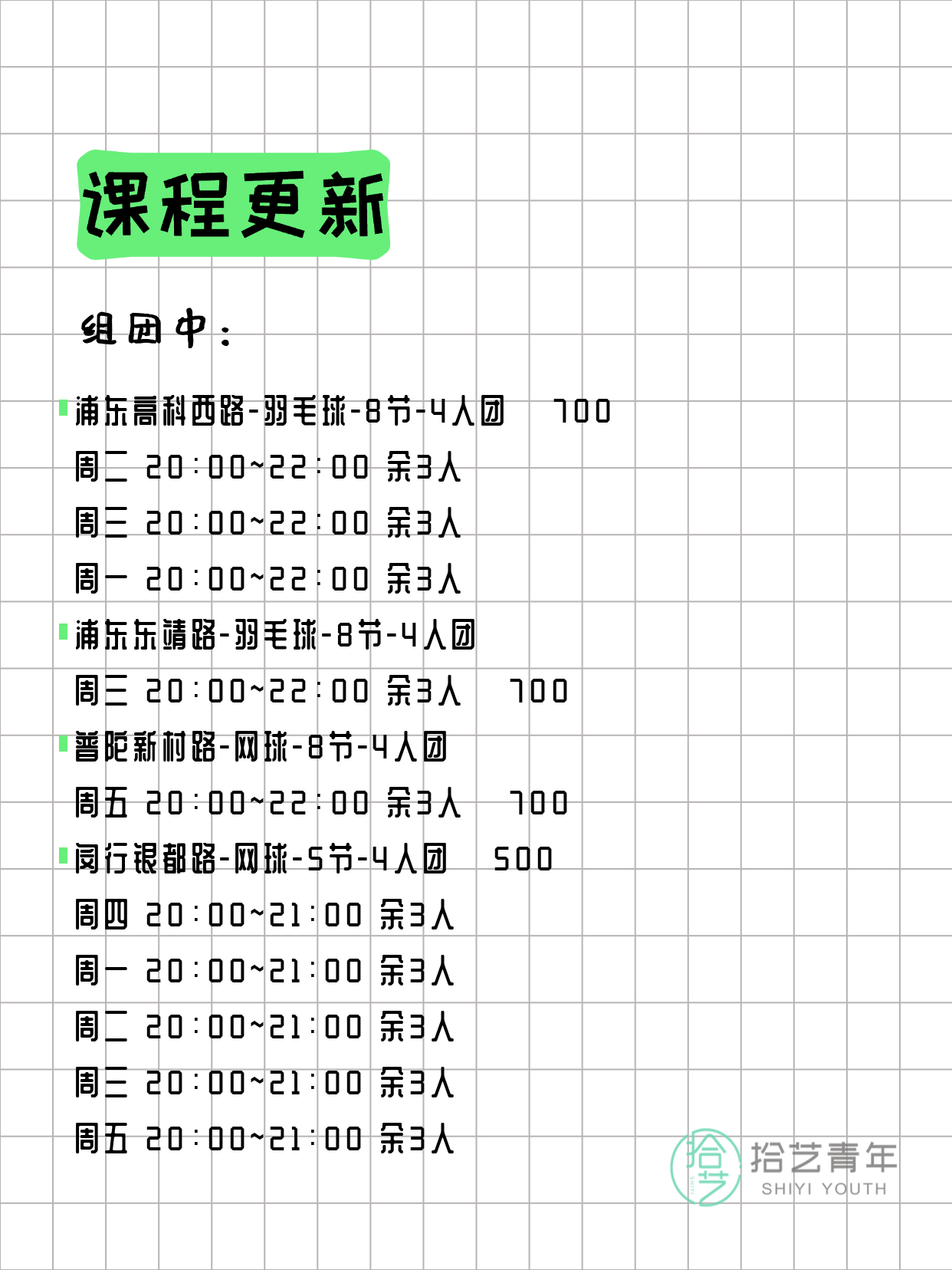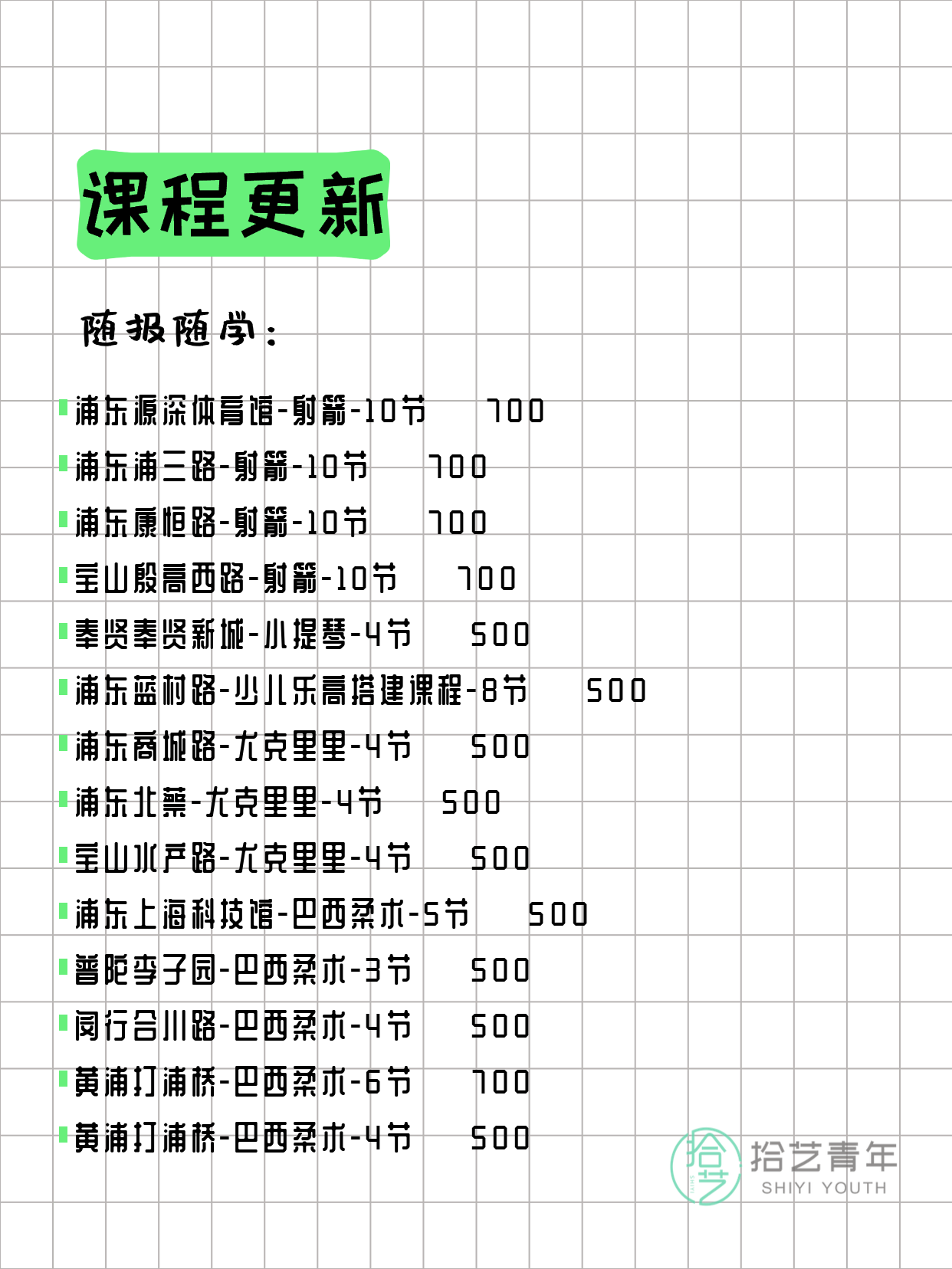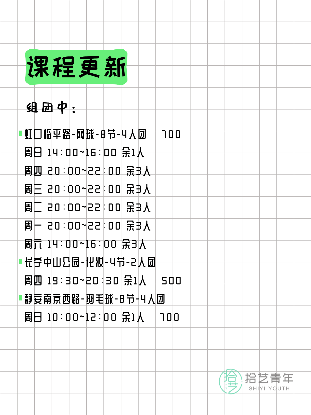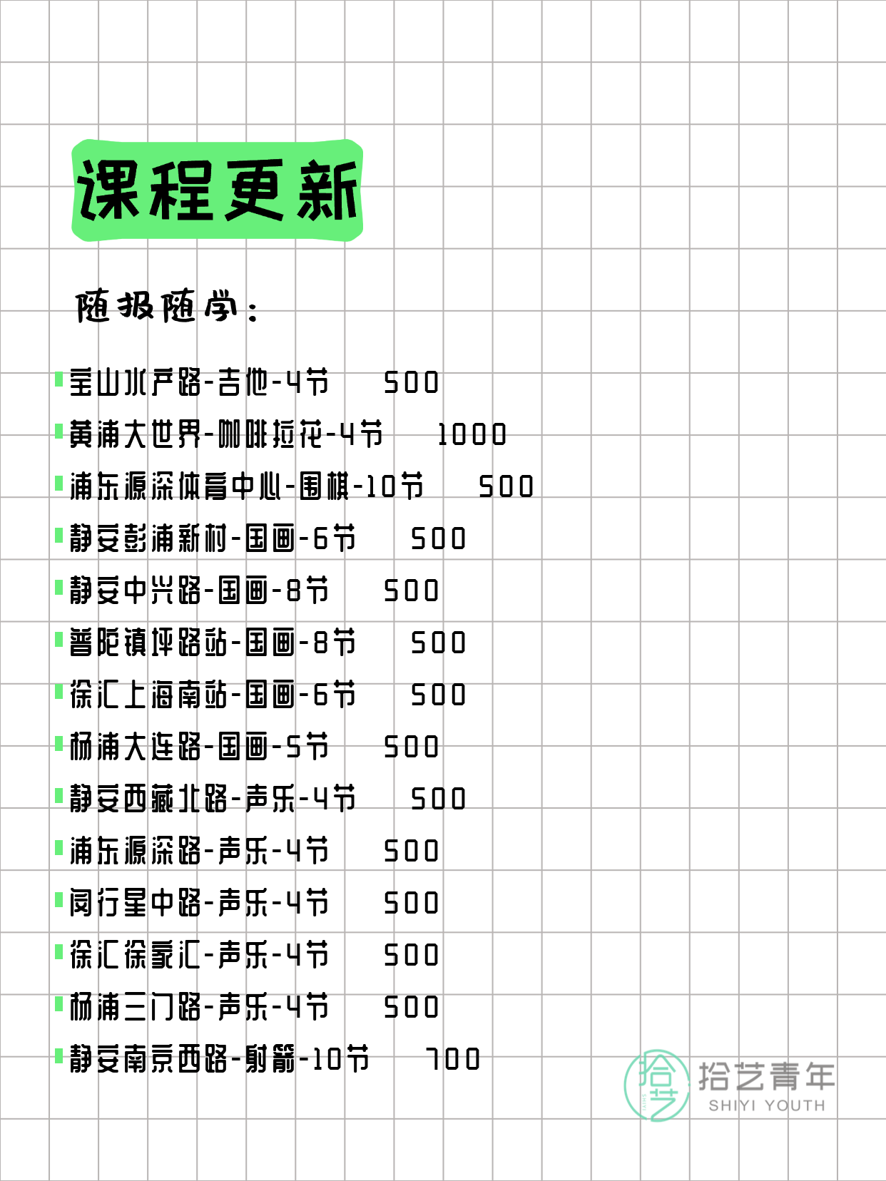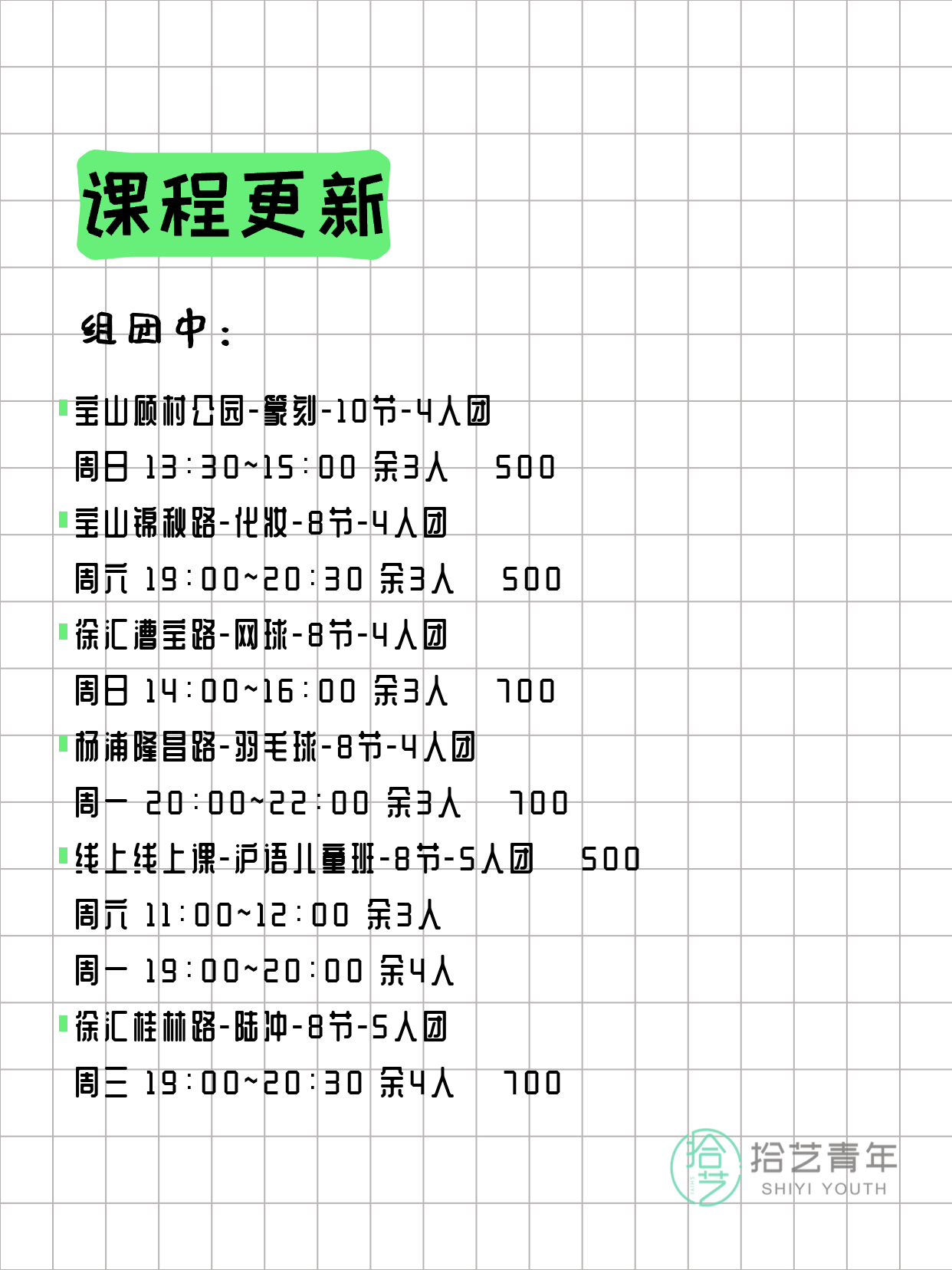 资讯>综合>正文3月20日上海夜校课程合集拾艺青年2026-03-201 / 17📊 本期课程概况• 总课程数:357门• 组团中课程:68门• 覆盖区域:15个区详见图片,欢迎报名咨询。💡 提示:以上课程信息来自拾艺青年小程序,课程可能随报名动态变化,具体以小程序实时信息为准。👉 微信小程序链接:#小程序://拾艺青年/WmfwH22mnQUxZwb