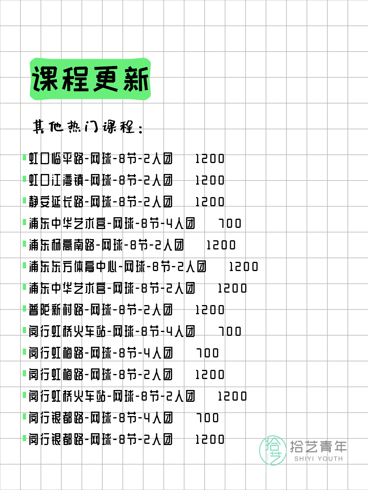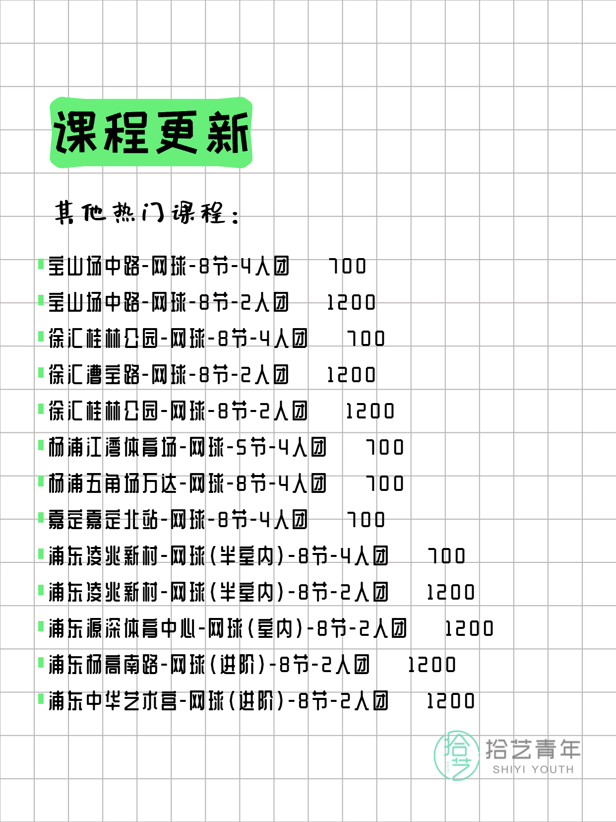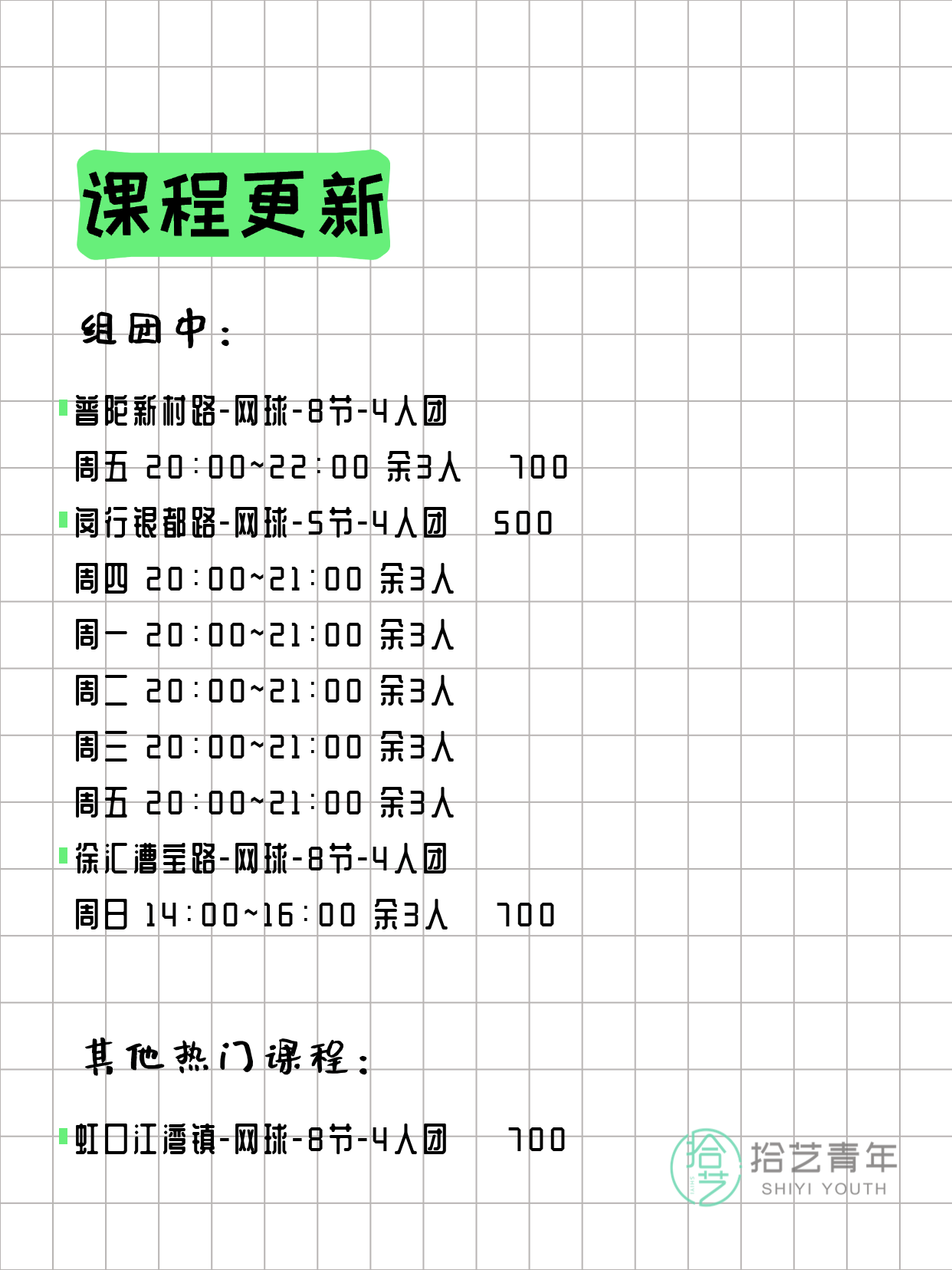 💡 提示:以上课程信息来自拾艺青年小程序,课程可能随报名动态变化,具体以小程序实时信息为准。
