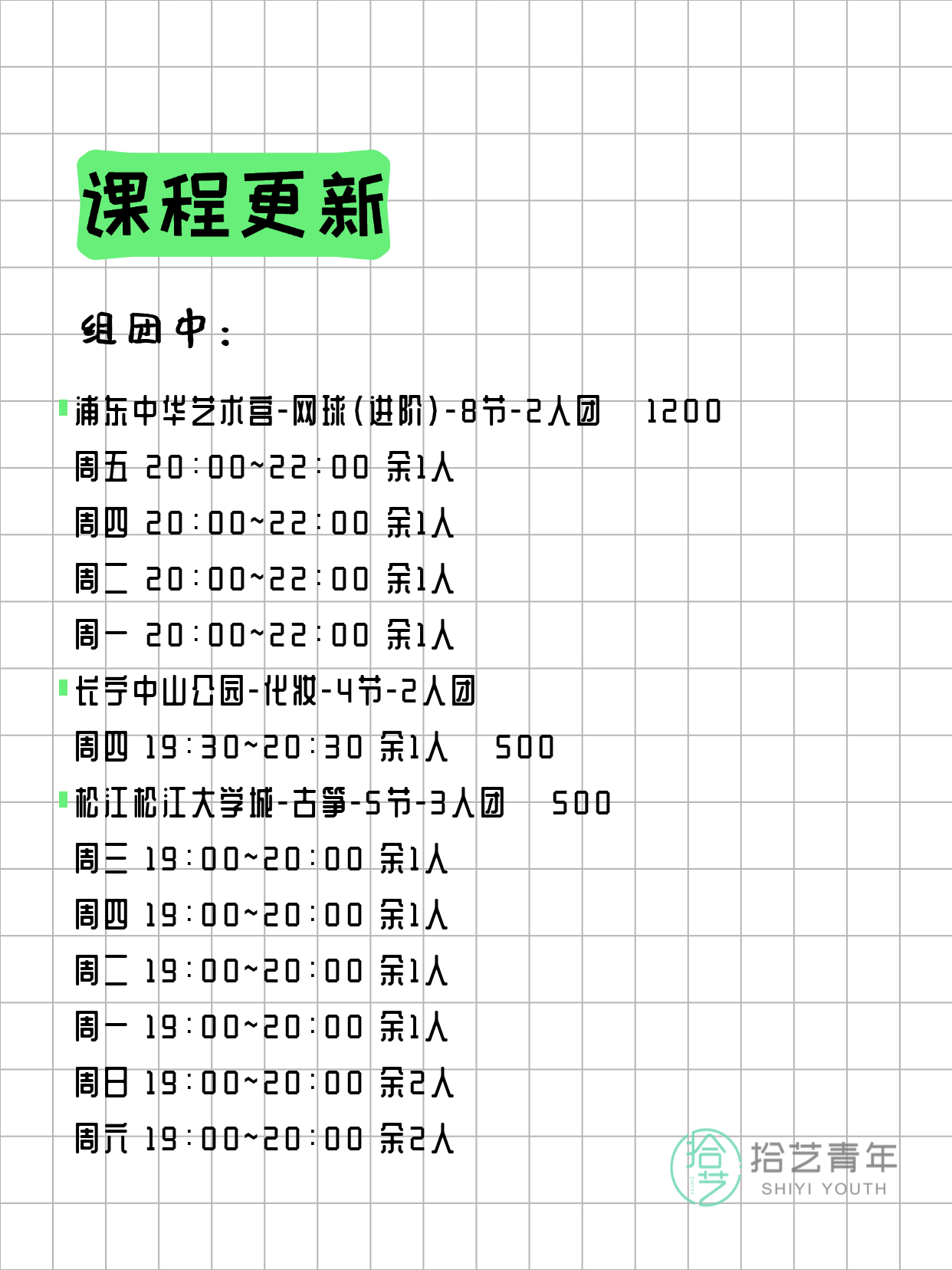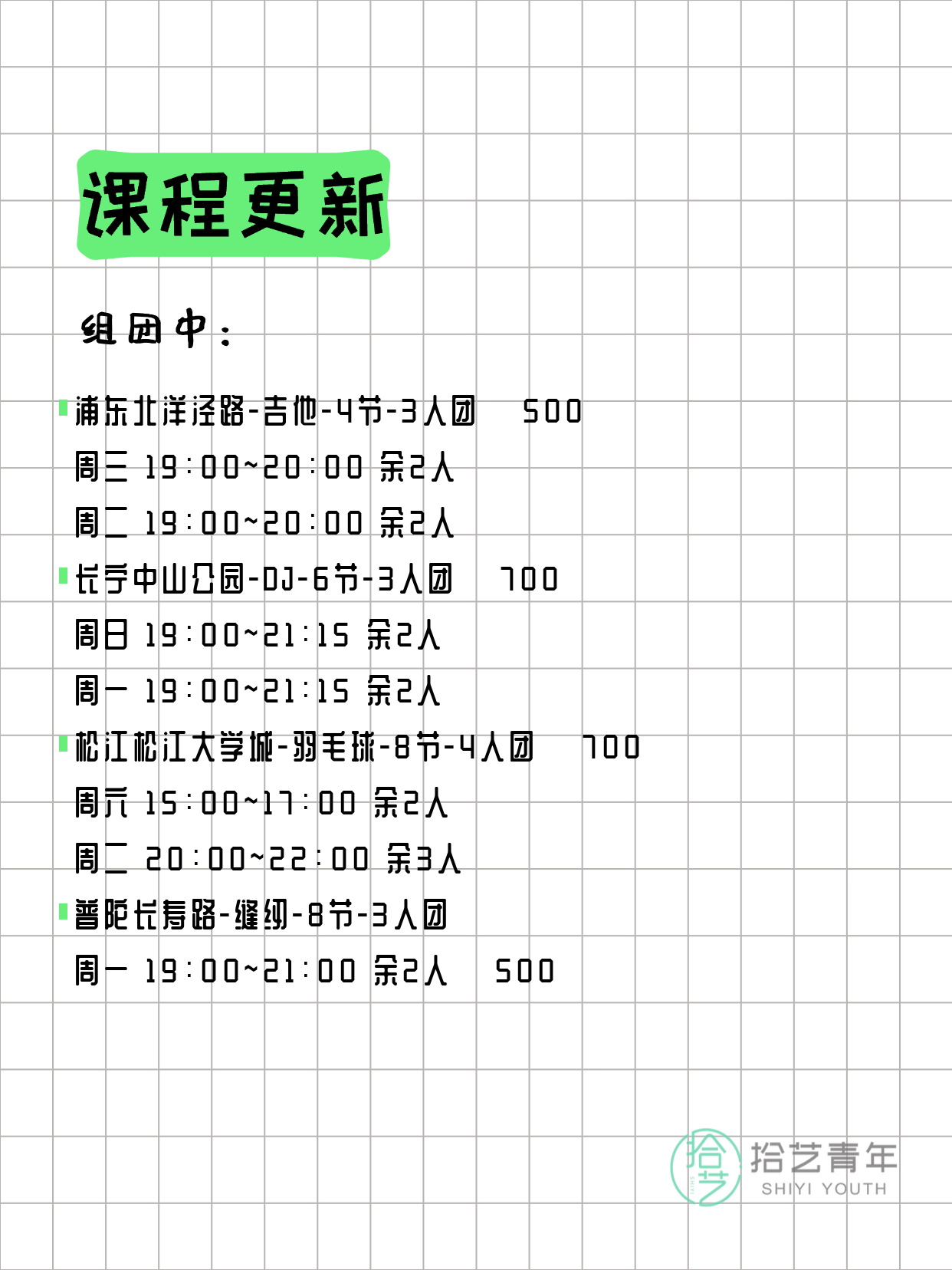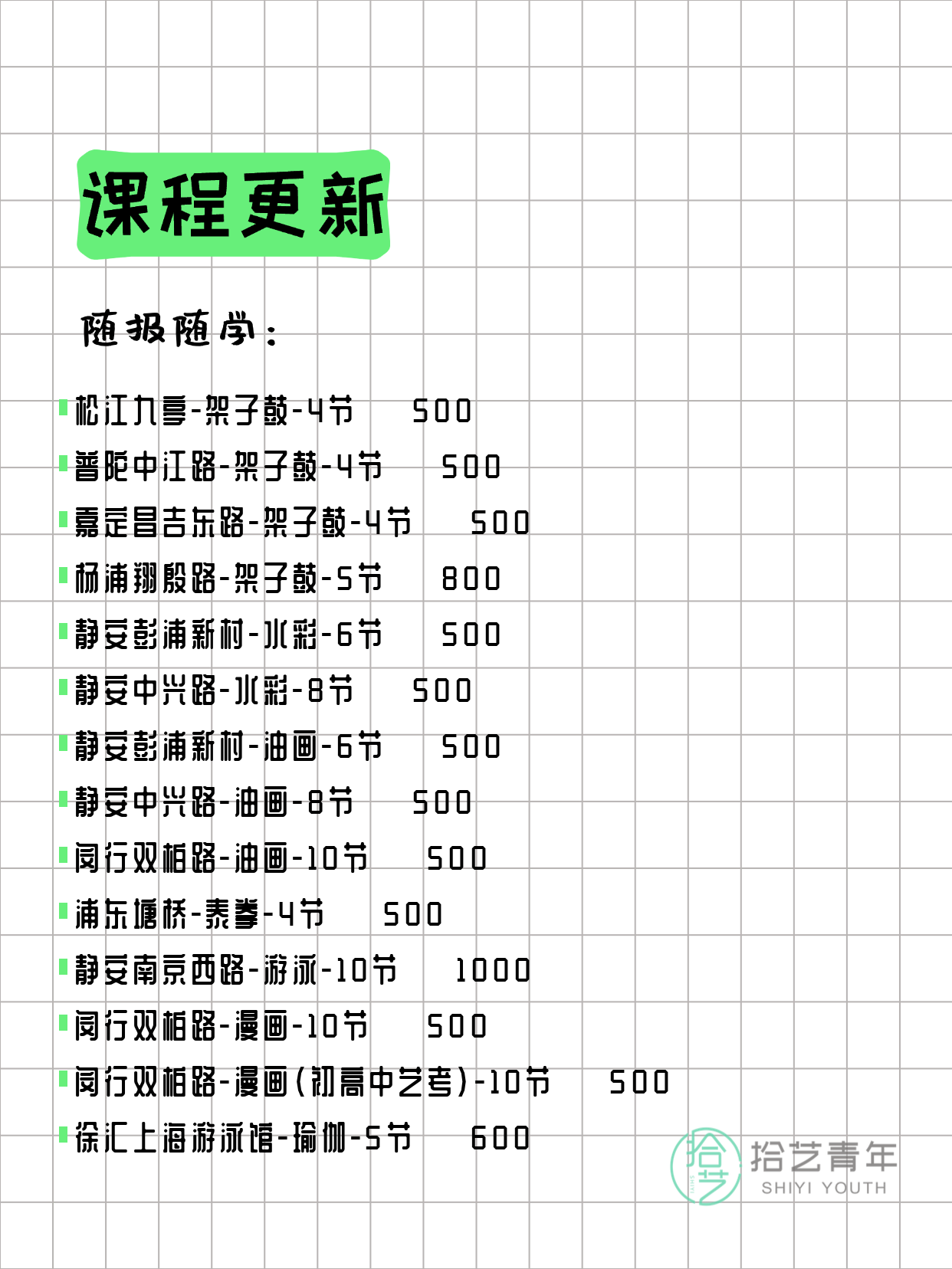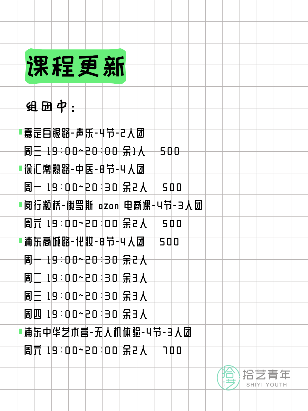 资讯>综合>正文3月23日上海夜校课程合集拾艺青年2026-03-231 / 17📊 本期课程概况• 总课程数:365门• 组团中课程:83门• 覆盖区域:15个区详见图片,欢迎报名咨询。💡 提示:以上课程信息来自拾艺青年小程序,课程可能随报名动态变化,具体以小程序实时信息为准。👉 微信小程序链接:#小程序://拾艺青年/WmfwH22mnQUxZwb