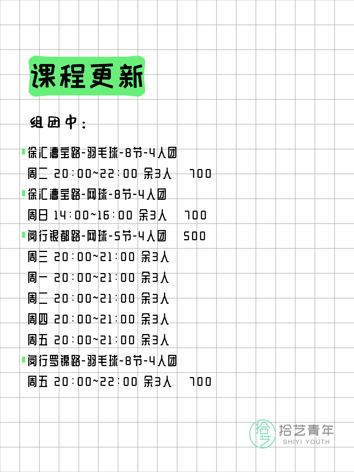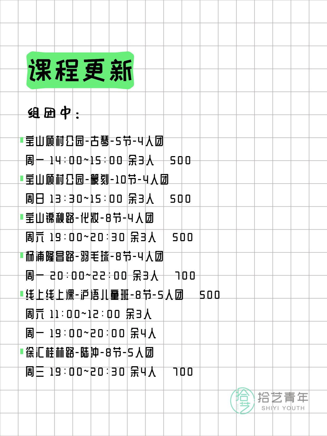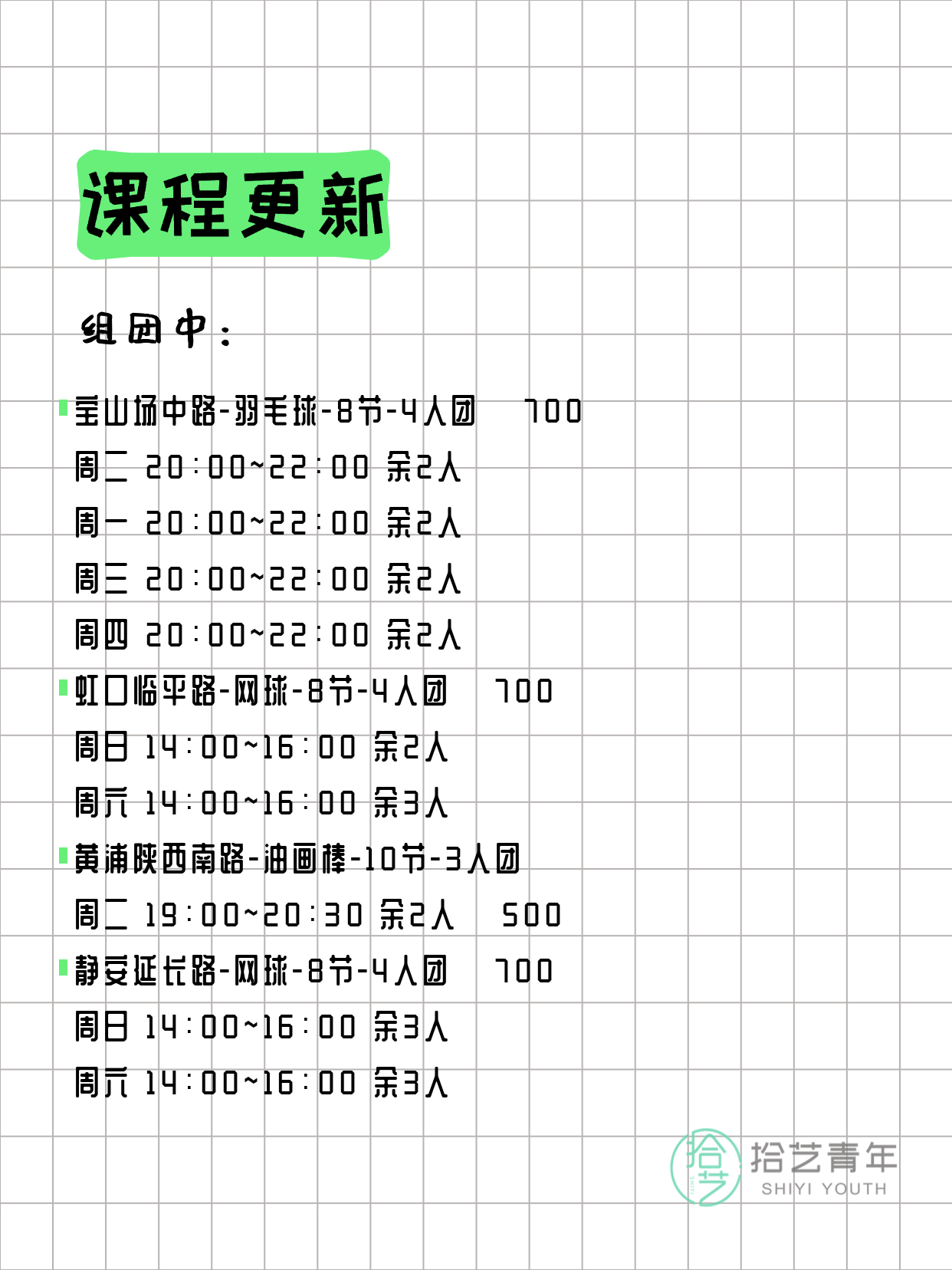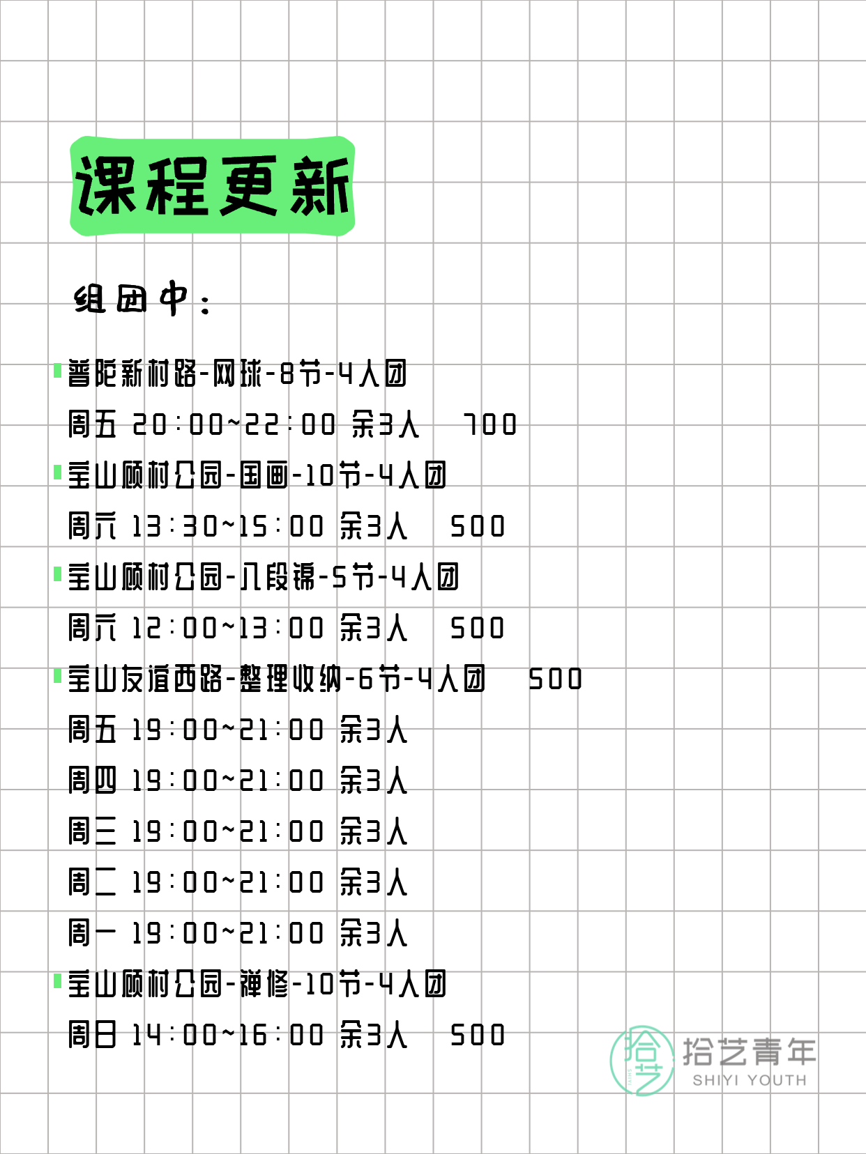资讯>综合>正文3月23日上海夜校课程合集拾艺青年2026-03-231 / 17📊 本期课程概况• 总课程数:365门• 组团中课程:83门• 覆盖区域:15个区详见图片,欢迎报名咨询。💡 提示:以上课程信息来自拾艺青年小程序,课程可能随报名动态变化,具体以小程序实时信息为准。👉 微信小程序链接:#小程序://拾艺青年/WmfwH22mnQUxZwb