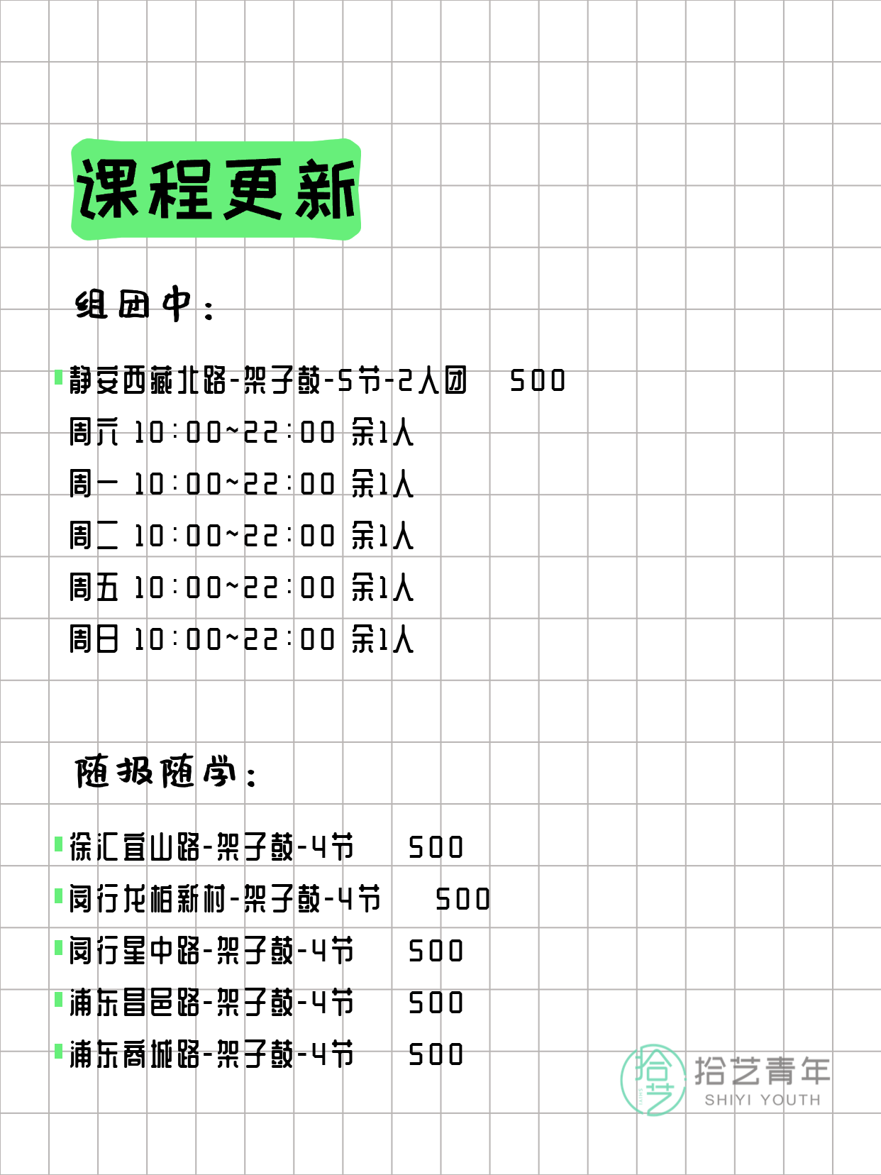 💡 提示:以上课程信息来自拾艺青年小程序,课程可能随报名动态变化,具体以小程序实时信息为准。