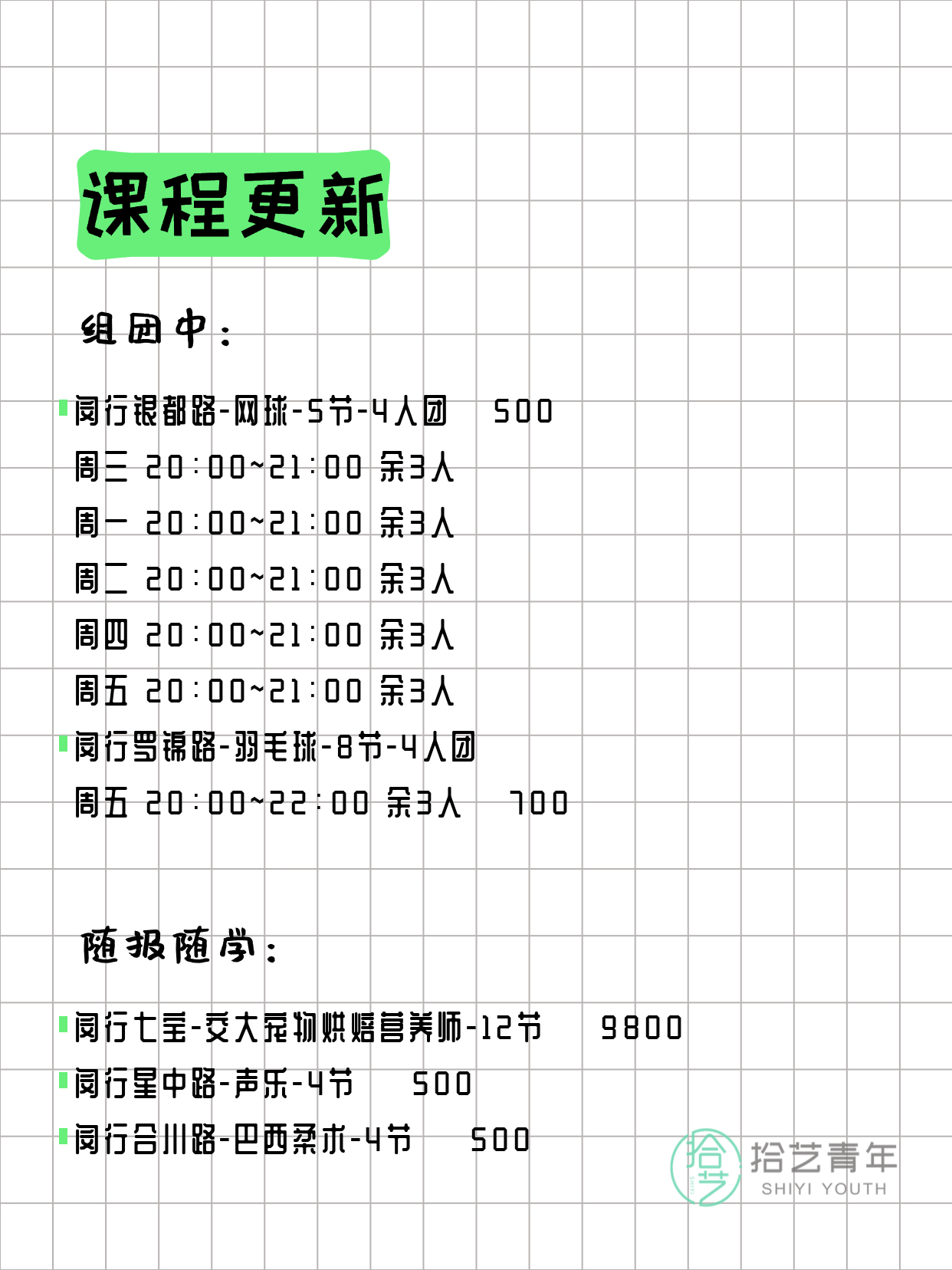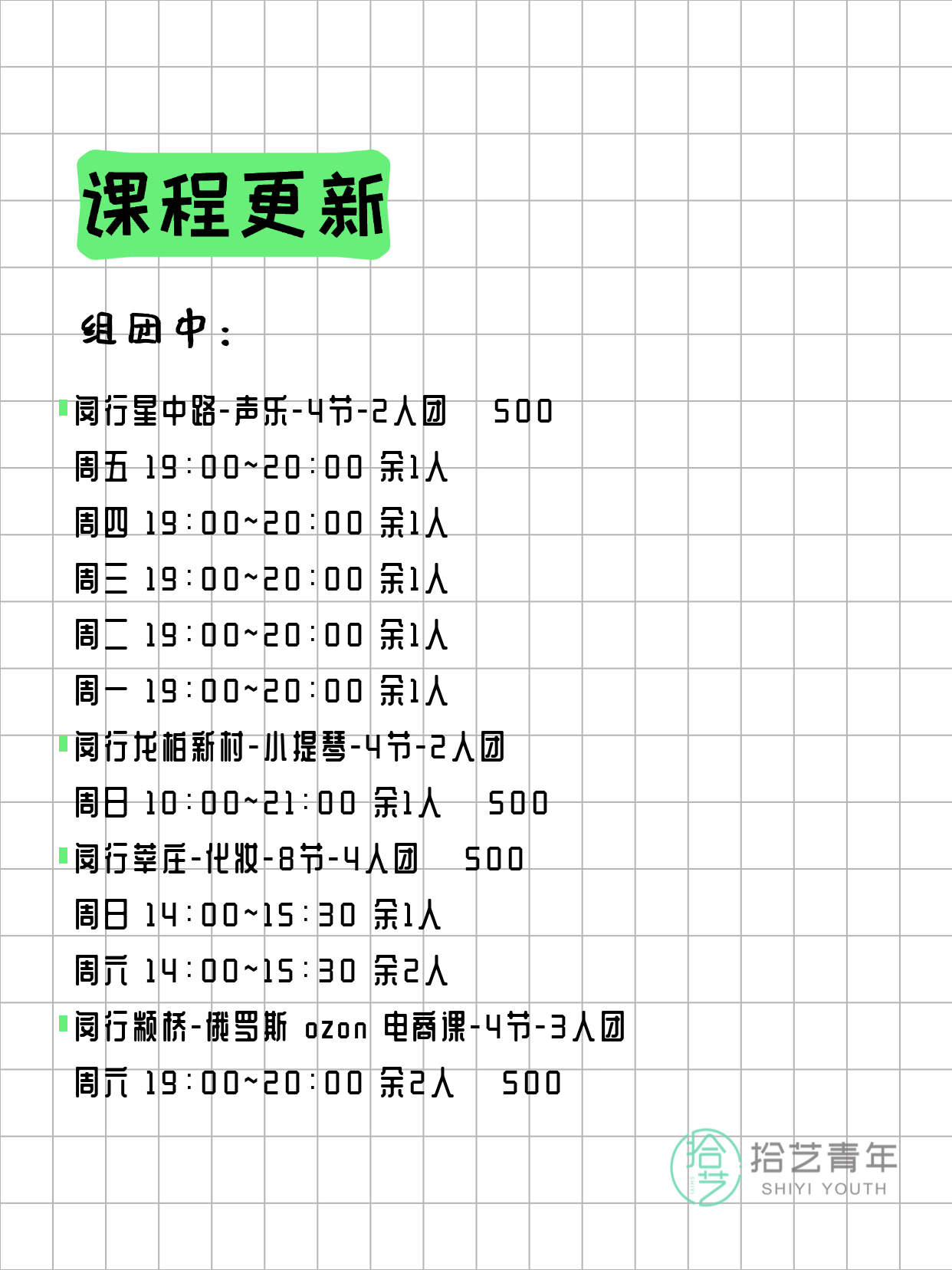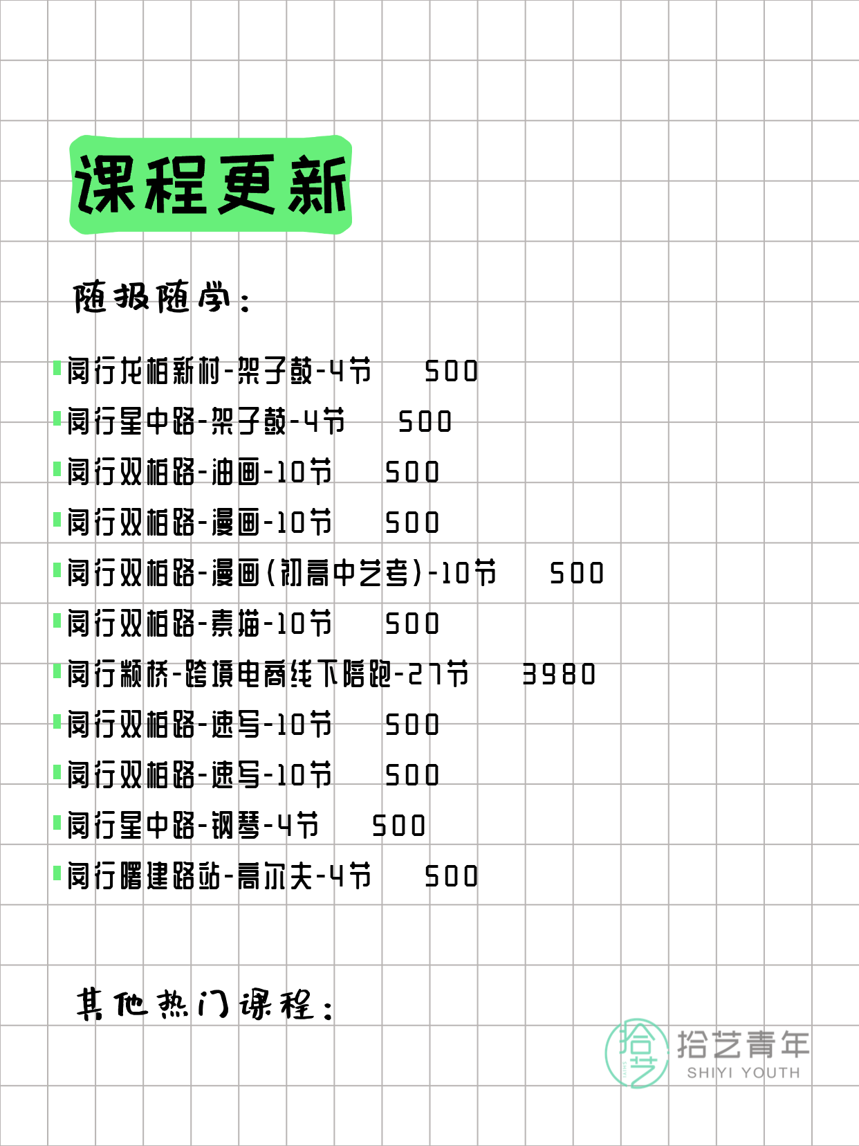💡 提示:以上课程信息来自拾艺青年小程序,课程可能随报名动态变化,具体以小程序实时信息为准。