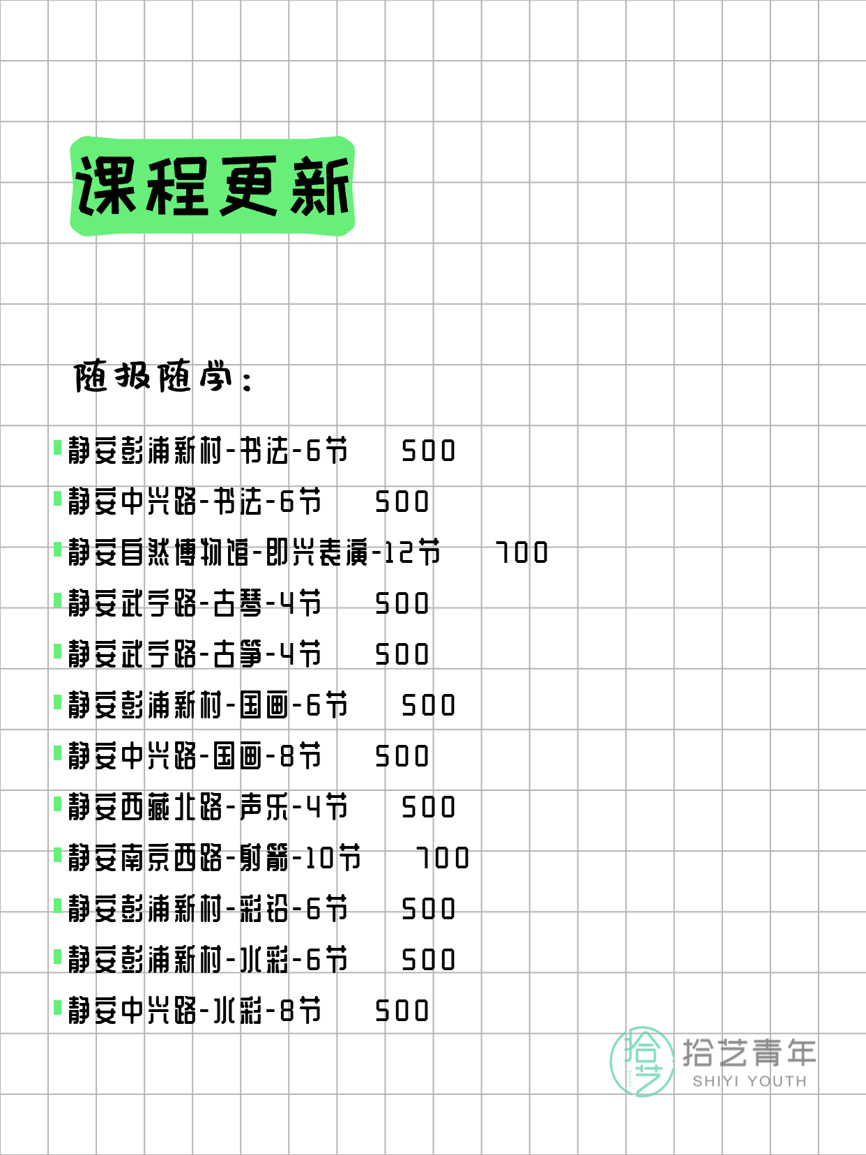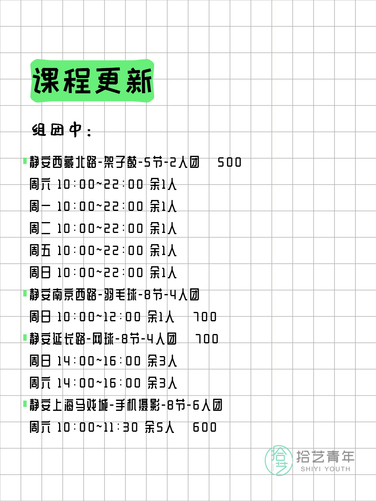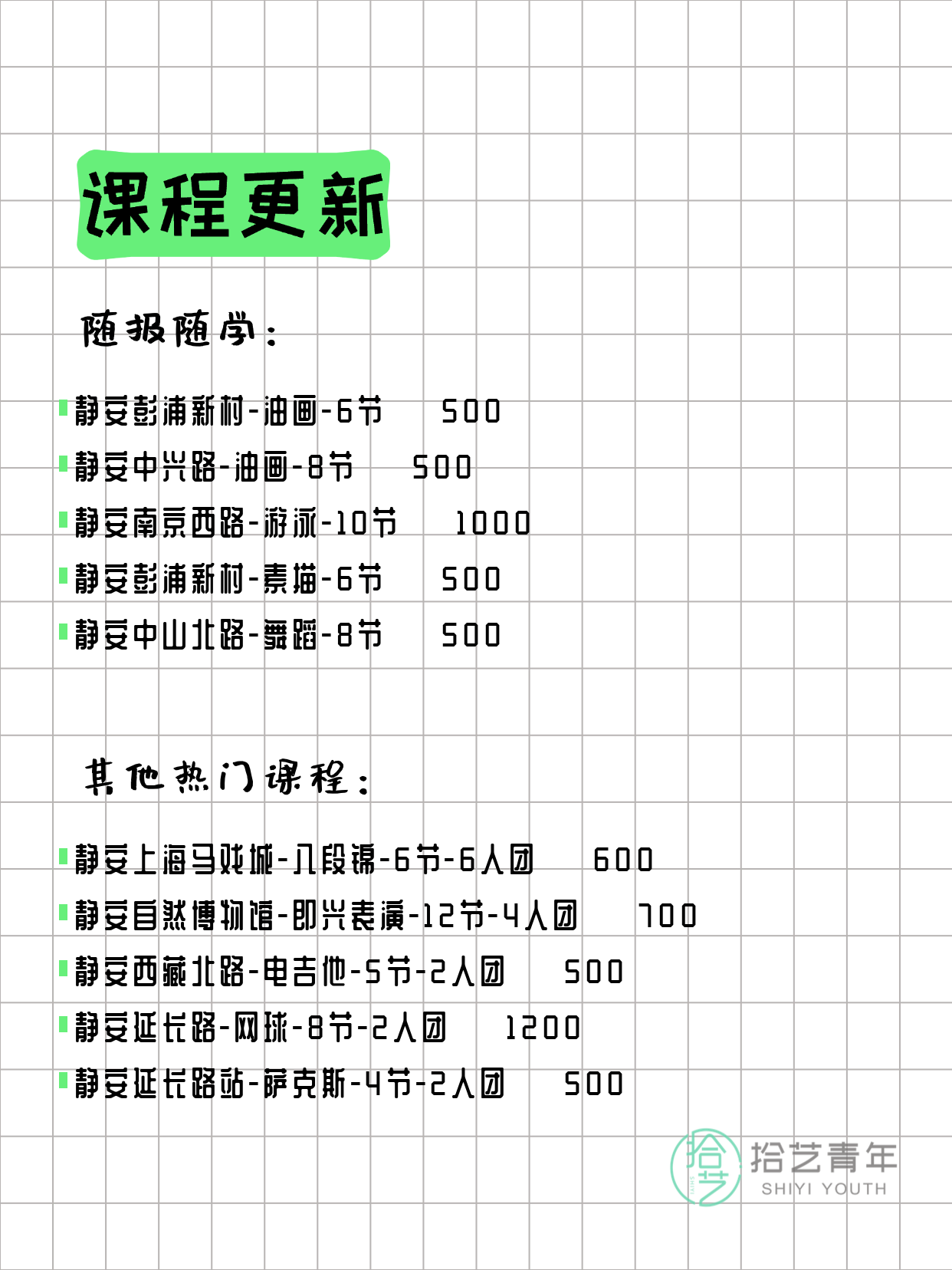 💡 提示:以上课程信息来自拾艺青年小程序,课程可能随报名动态变化,具体以小程序实时信息为准。