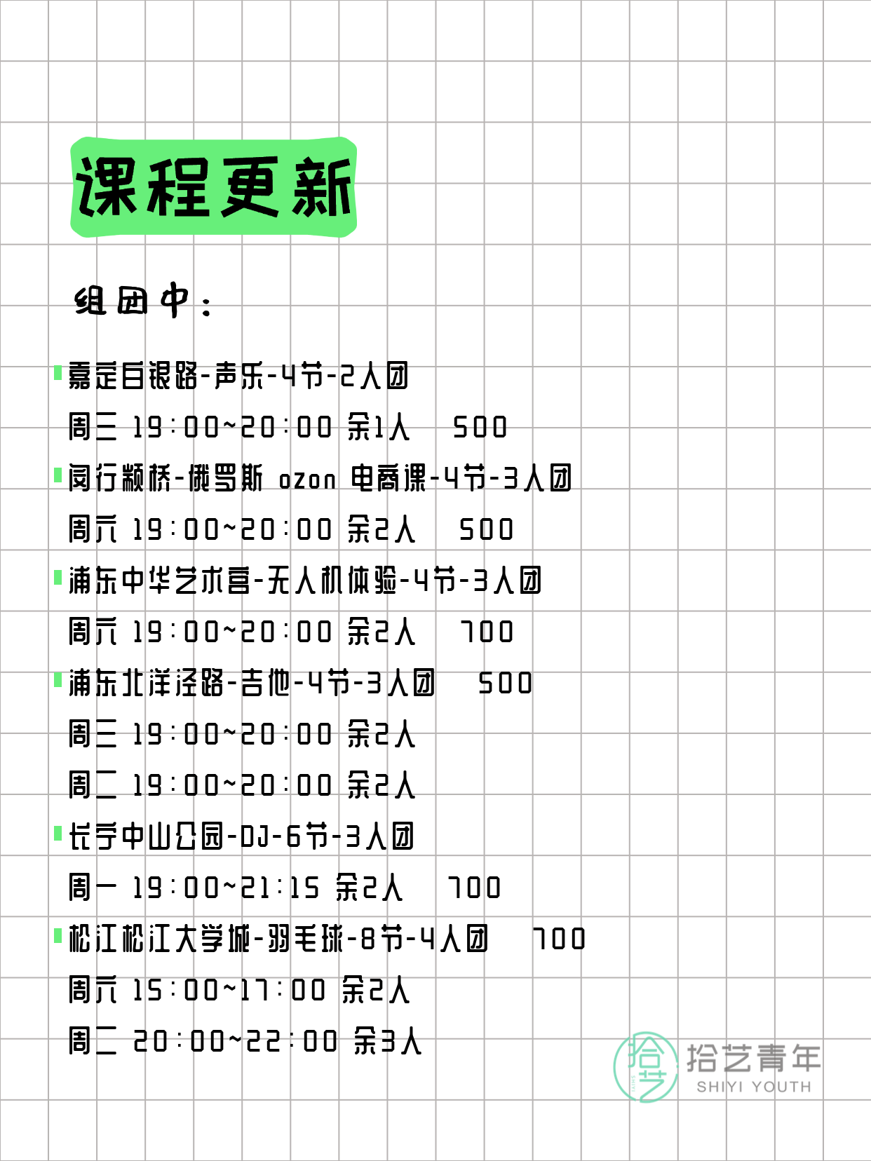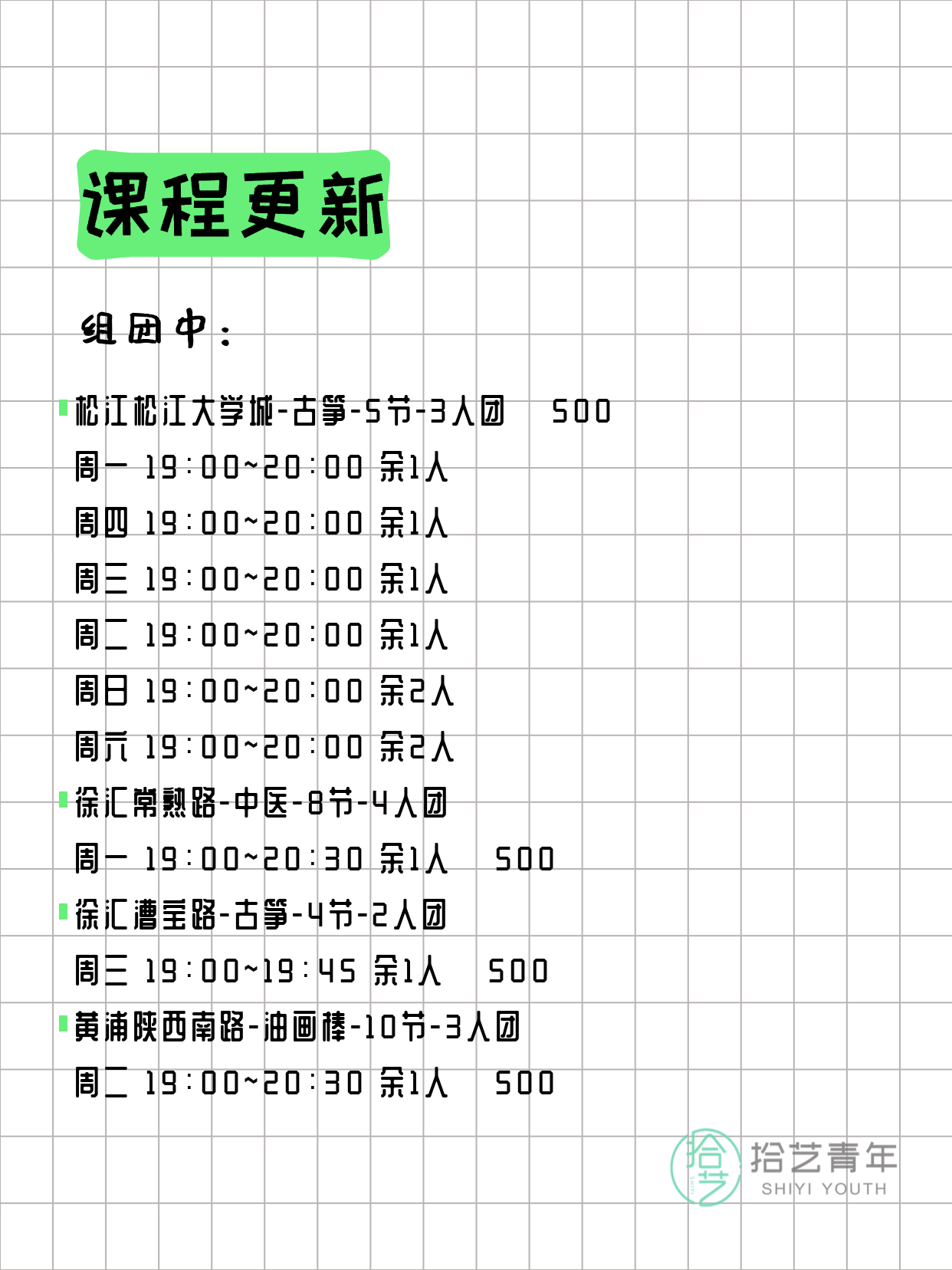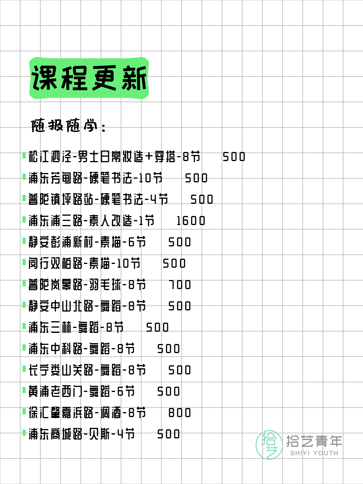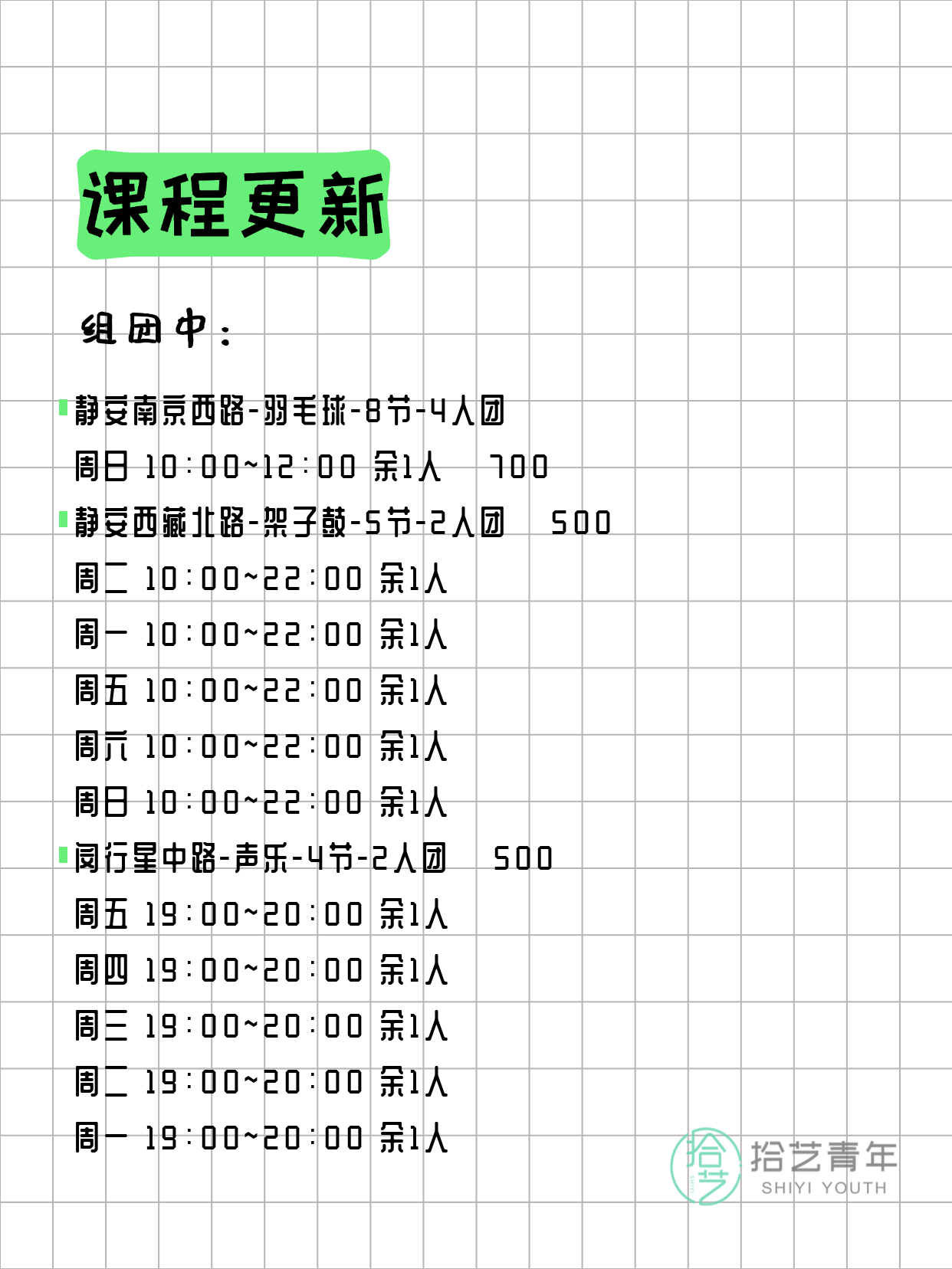 资讯>综合>正文3月24日上海夜校课程合集拾艺青年2026-03-241 / 17📊 本期课程概况• 总课程数:366门• 组团中课程:78门• 覆盖区域:15个区详见图片,欢迎报名咨询。💡 提示:以上课程信息来自拾艺青年小程序,课程可能随报名动态变化,具体以小程序实时信息为准。👉 微信小程序链接:#小程序://拾艺青年/WmfwH22mnQUxZwb
