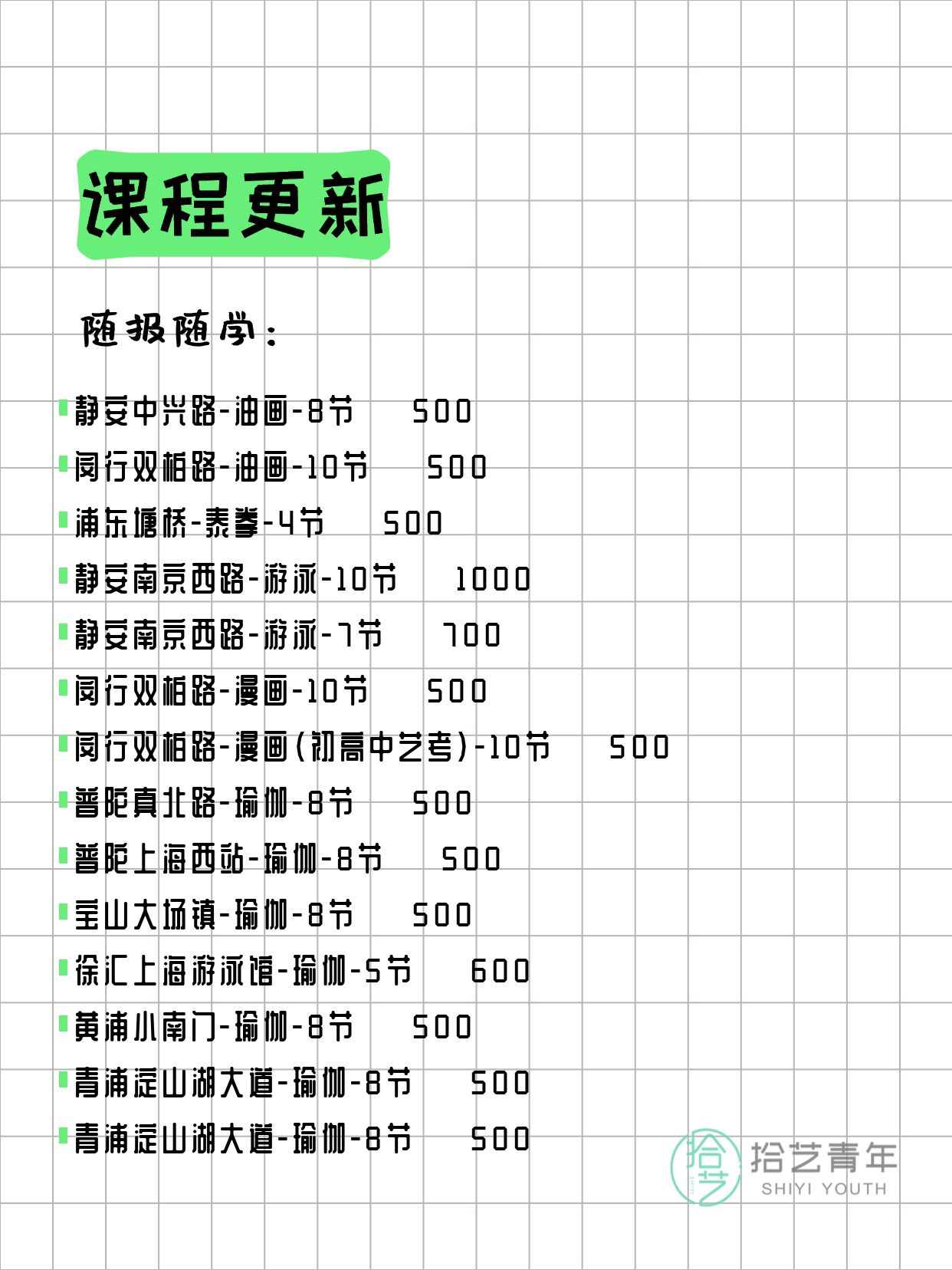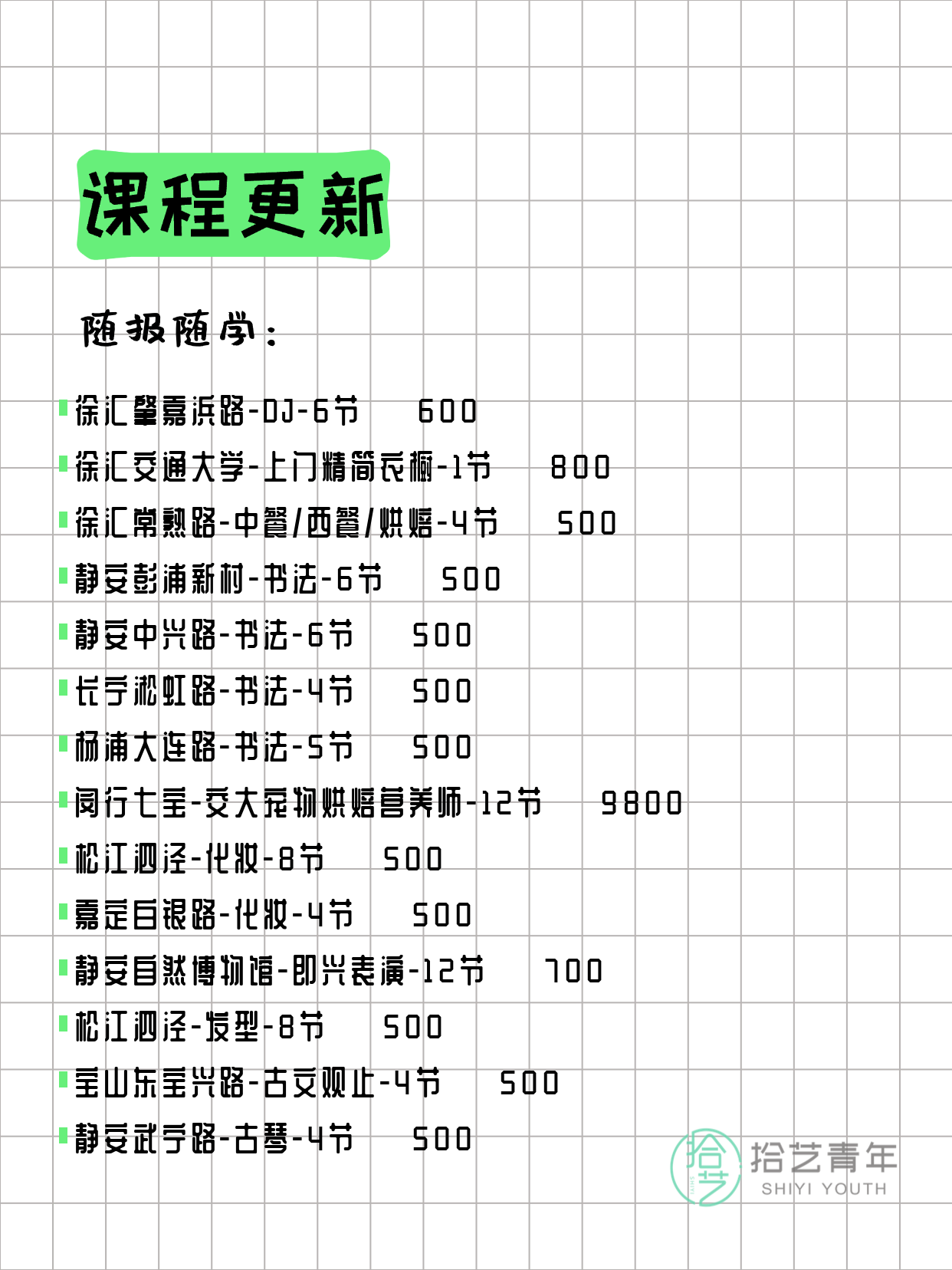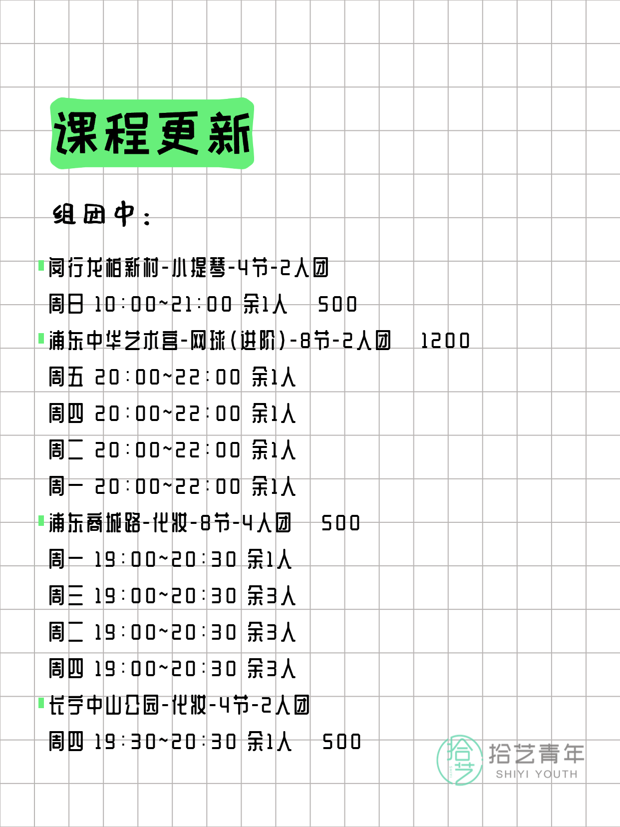资讯>综合>正文3月24日上海夜校课程合集拾艺青年2026-03-241 / 17📊 本期课程概况• 总课程数:366门• 组团中课程:78门• 覆盖区域:15个区详见图片,欢迎报名咨询。💡 提示:以上课程信息来自拾艺青年小程序,课程可能随报名动态变化,具体以小程序实时信息为准。👉 微信小程序链接:#小程序://拾艺青年/WmfwH22mnQUxZwb